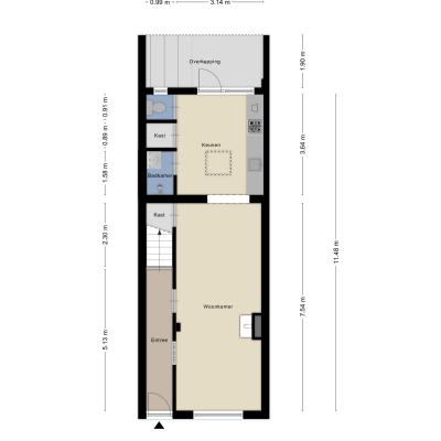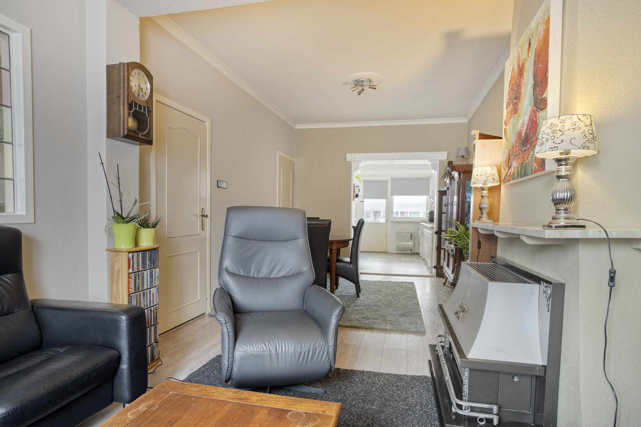 Via de entree met tegelvloer en afgesloten trapopgang betreed je de woning. De sfeervolle woonkamer valt direct op door het hoge plafond en de prettige lichtinval. De ruimte is afgewerkt met een laminaatvloer en beschikt over een gaskachel en een praktische, betegelde kelderkast met groepenkast.