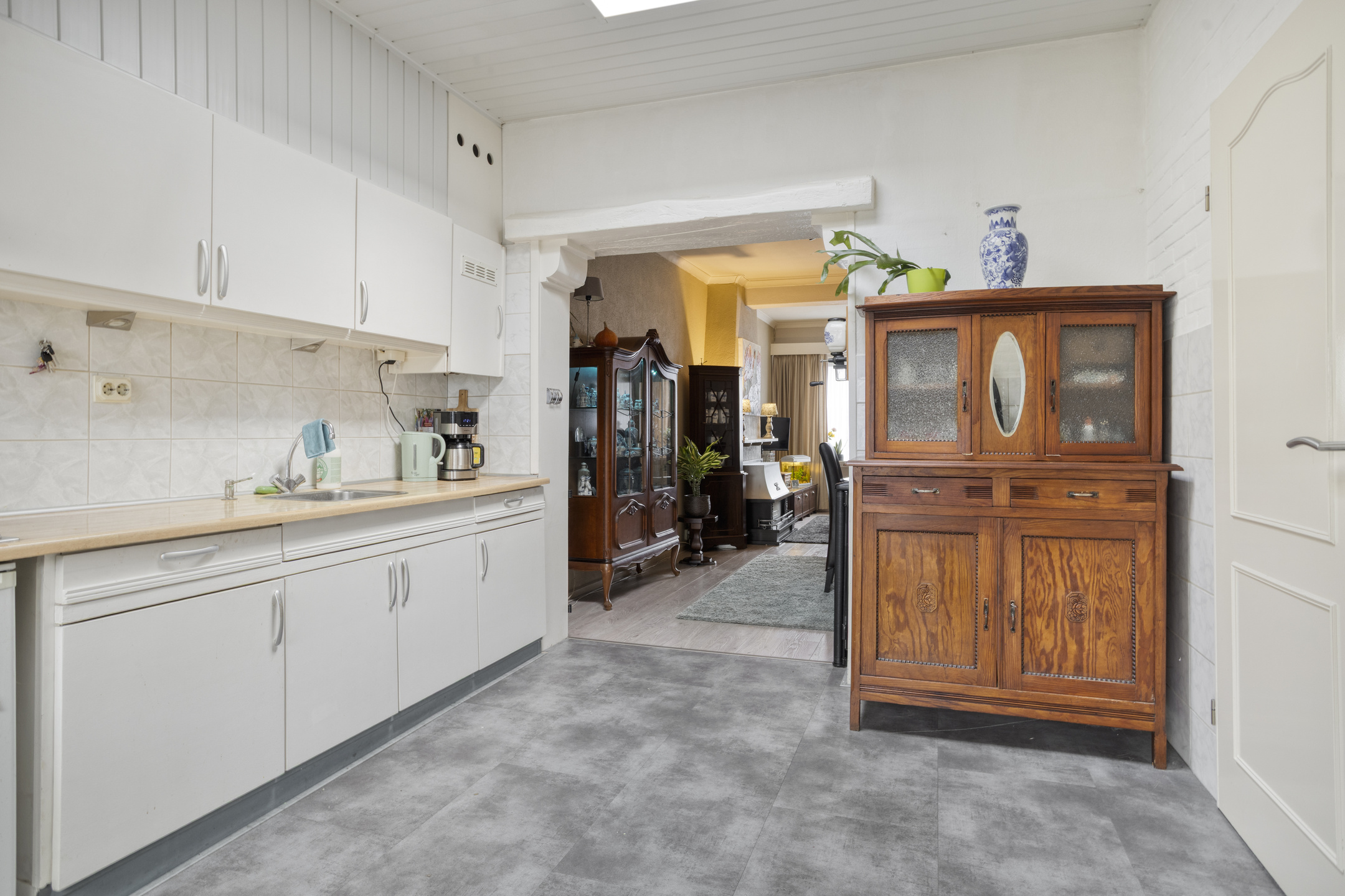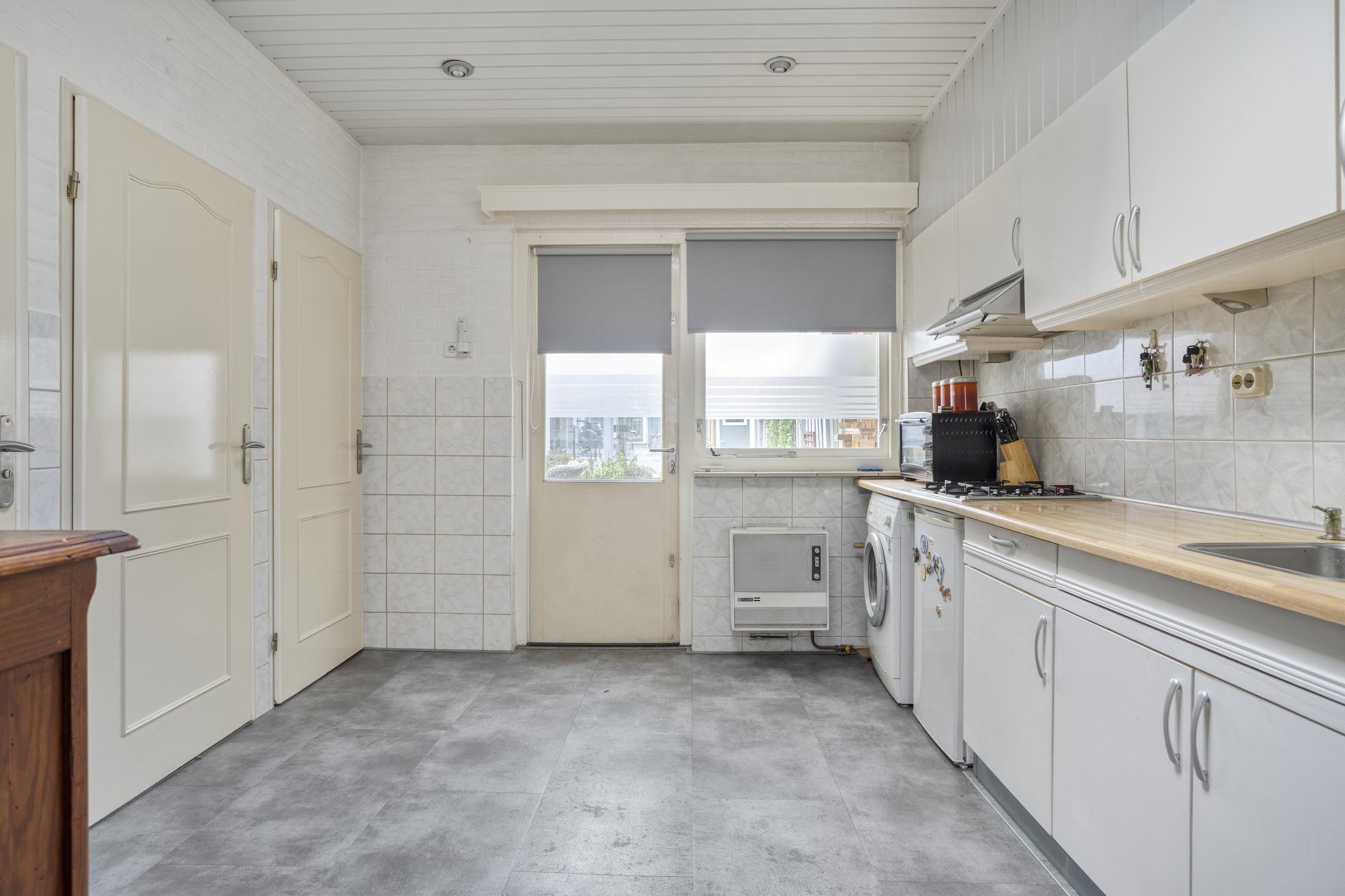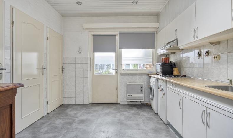 De uitgebouwde keuken vormt een fijne leefruimte met een lichtkoepel en loopdeur naar de tuin. De keuken is netjes uitgevoerd met een gaskookplaat, afzuigkap en ruimte voor losse apparatuur. Hier bevindt zich tevens de warmwatergeiser (Vaillant). Aansluitend vind je de separate toiletruimte, een compacte badkamer met douche en wastafel en een handige bergkast.