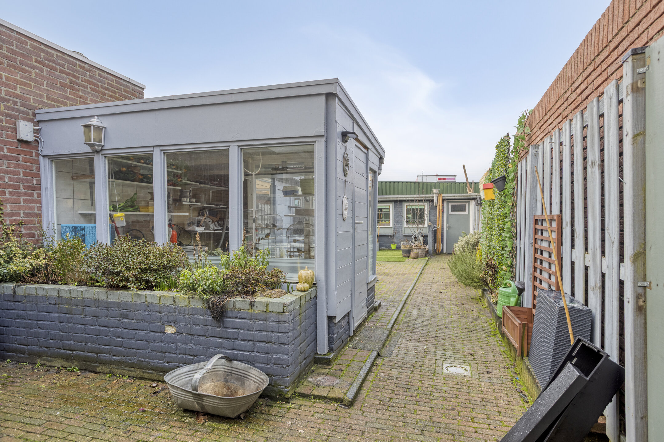 Achter op het perceel bevindt zich een tweede, ruime dubbele berging van ruim 20 m², voorzien van elektra en een praktische achterom.