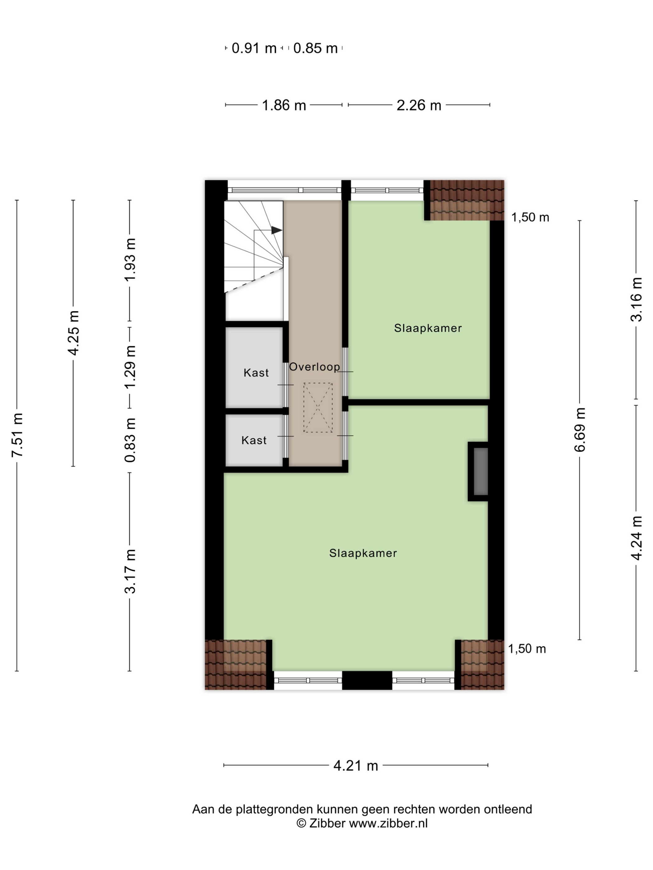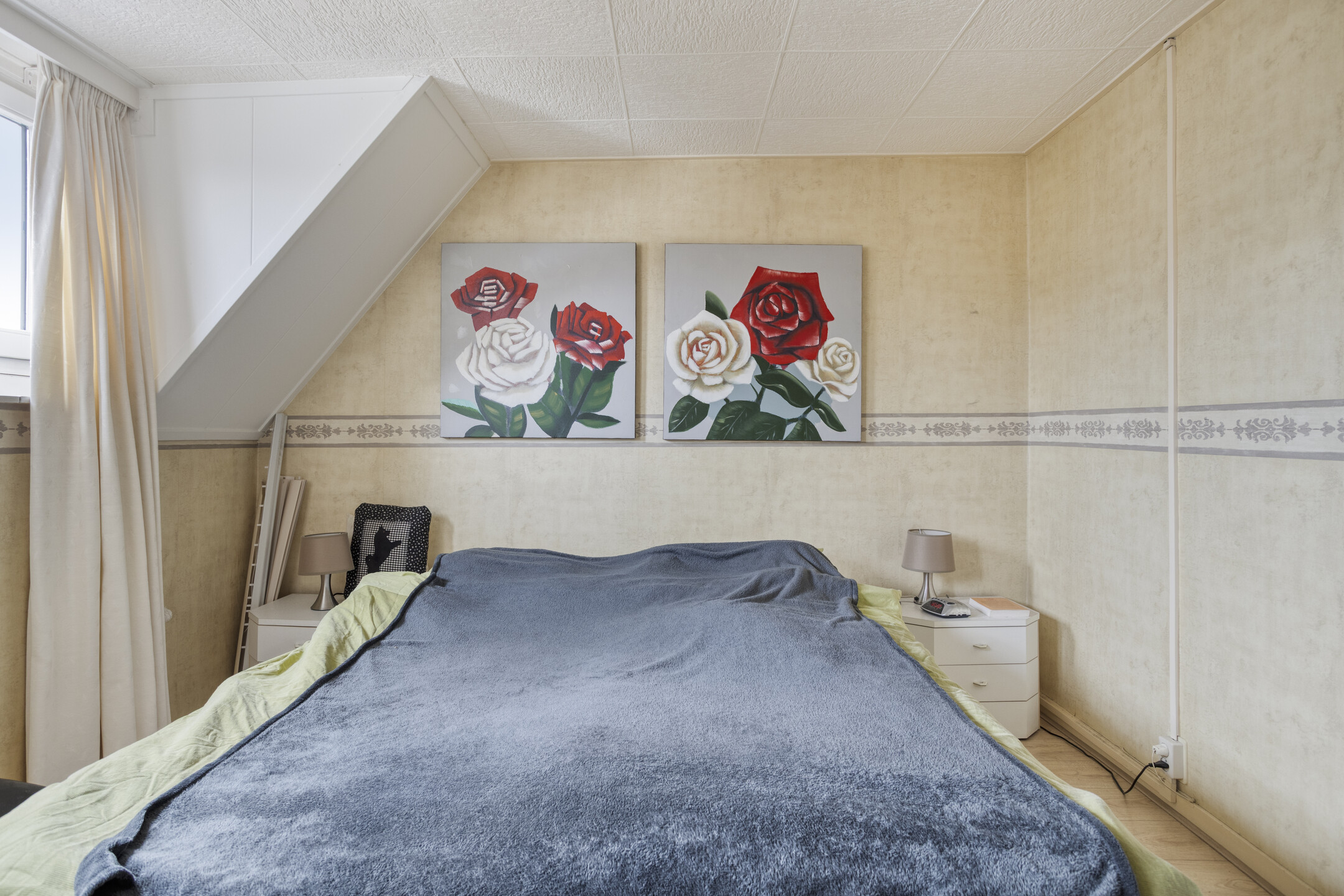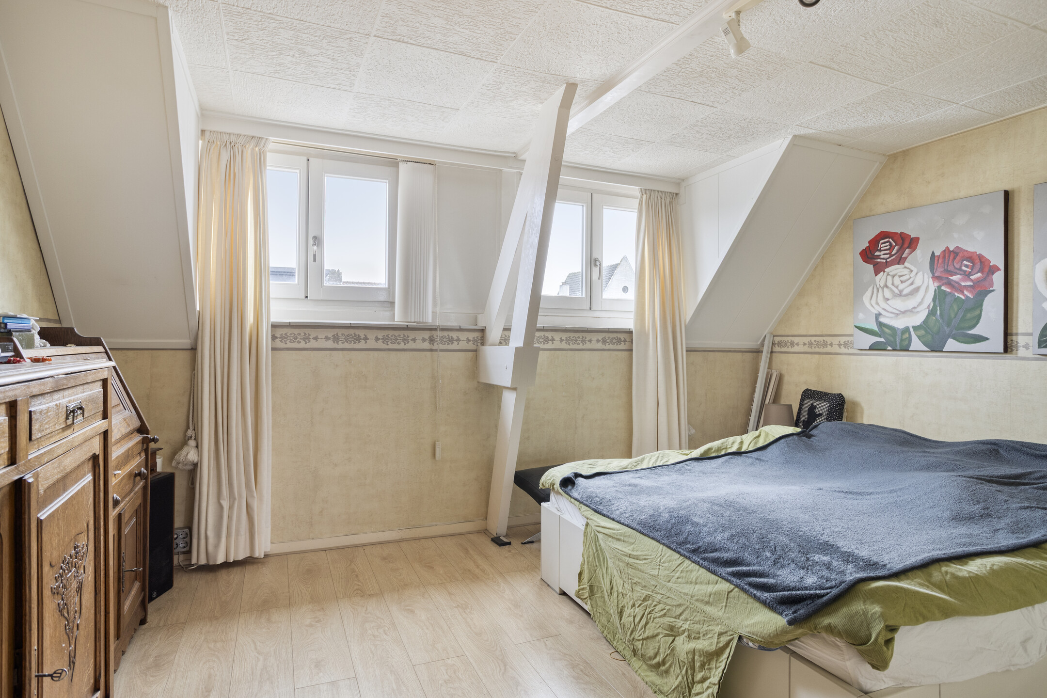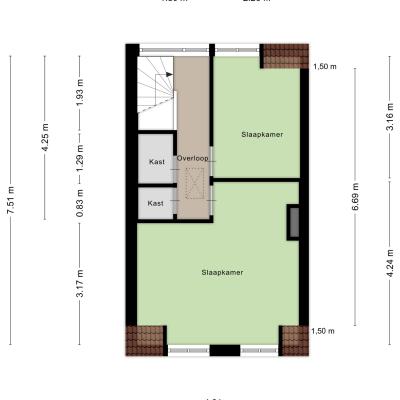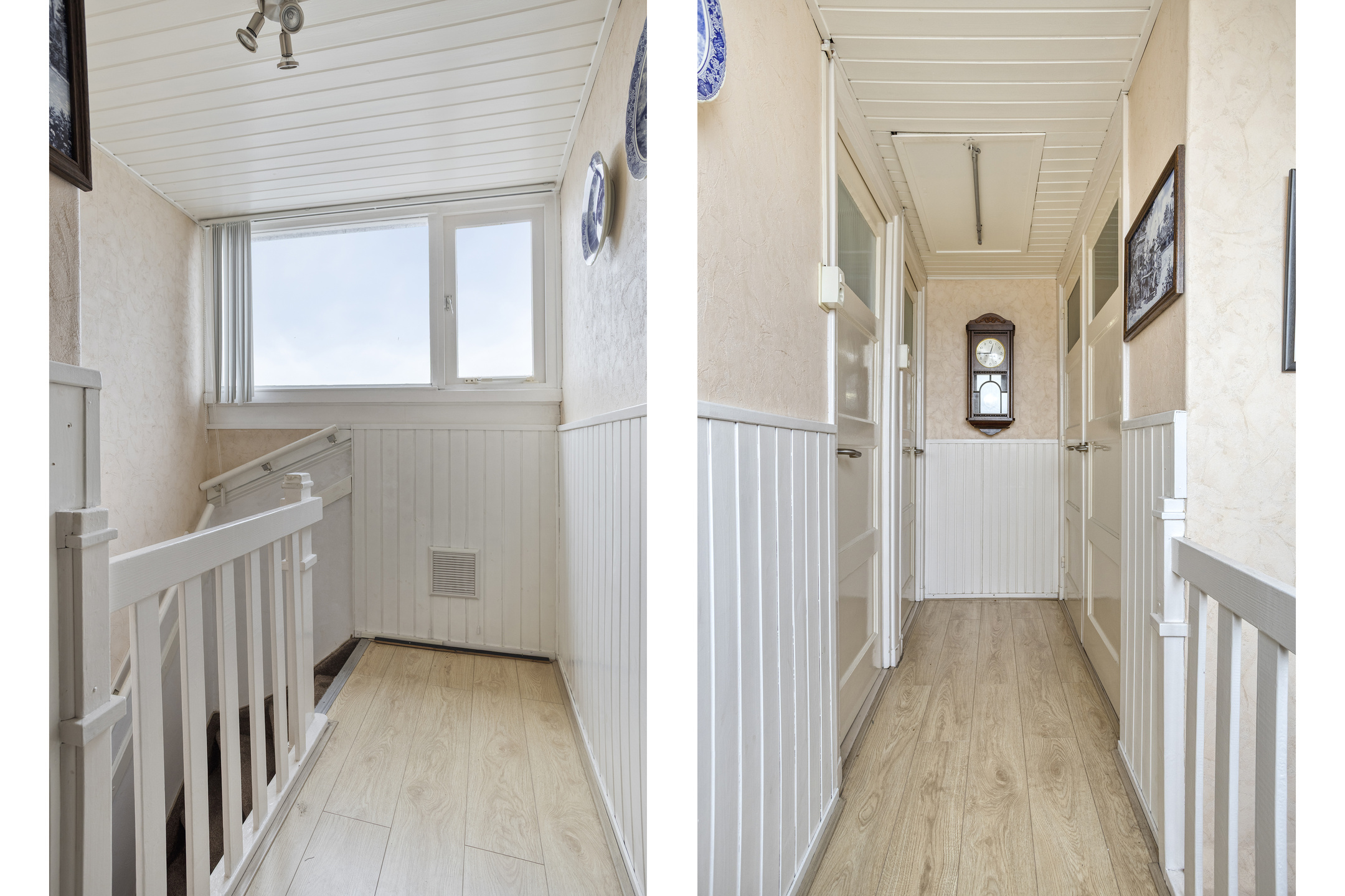 Overloop met toegang tot twee slaapkamers, beide voorzien van een dakkapel en dubbele inbouwkasten. De verdieping is netjes afgewerkt met een laminaatvloer.