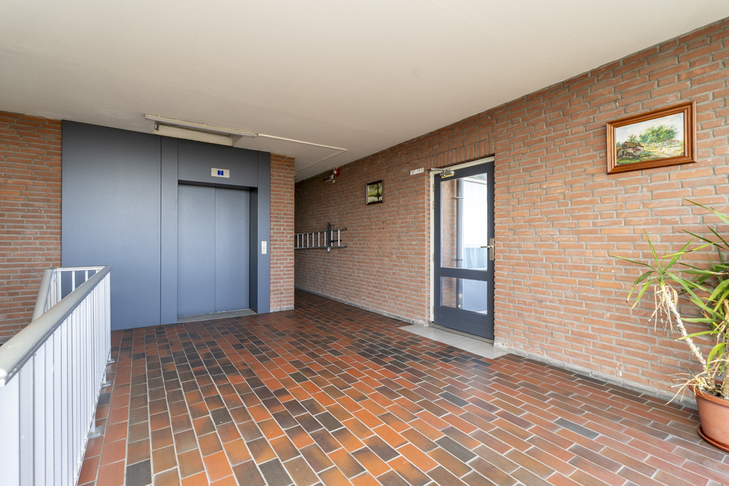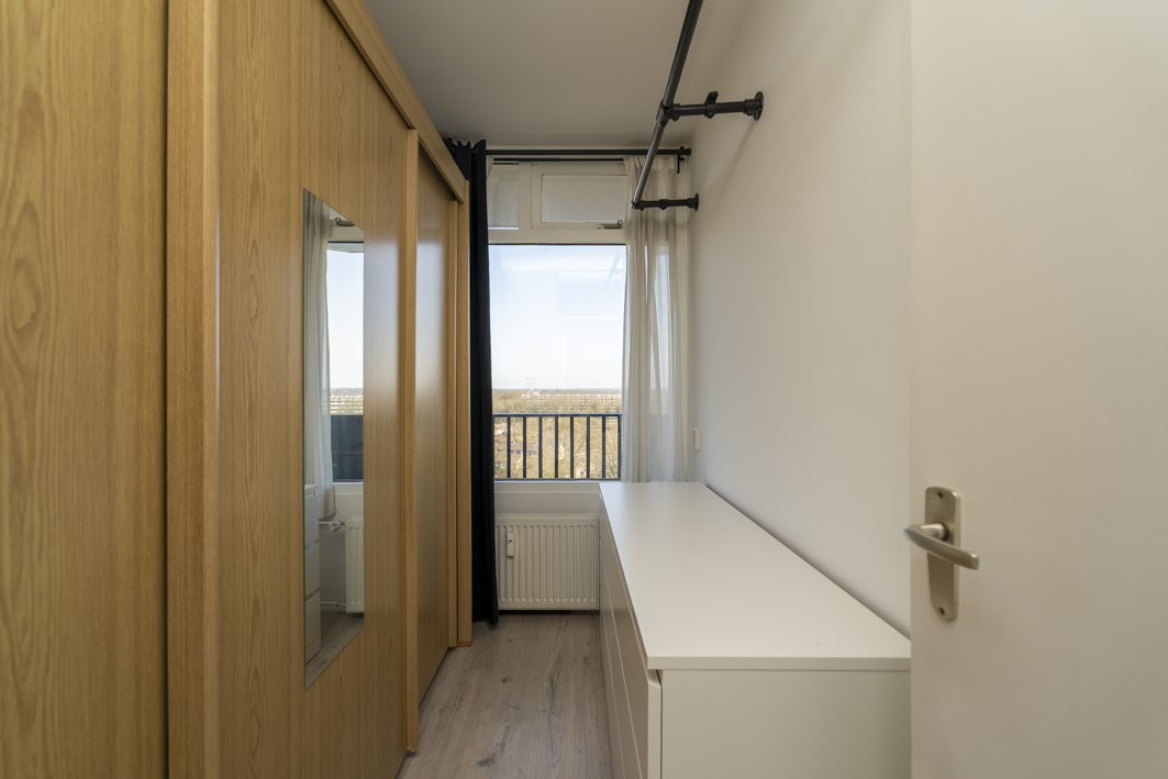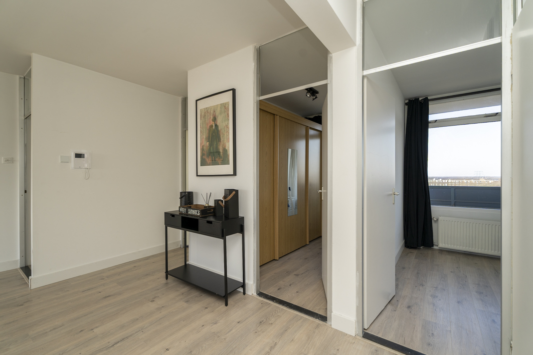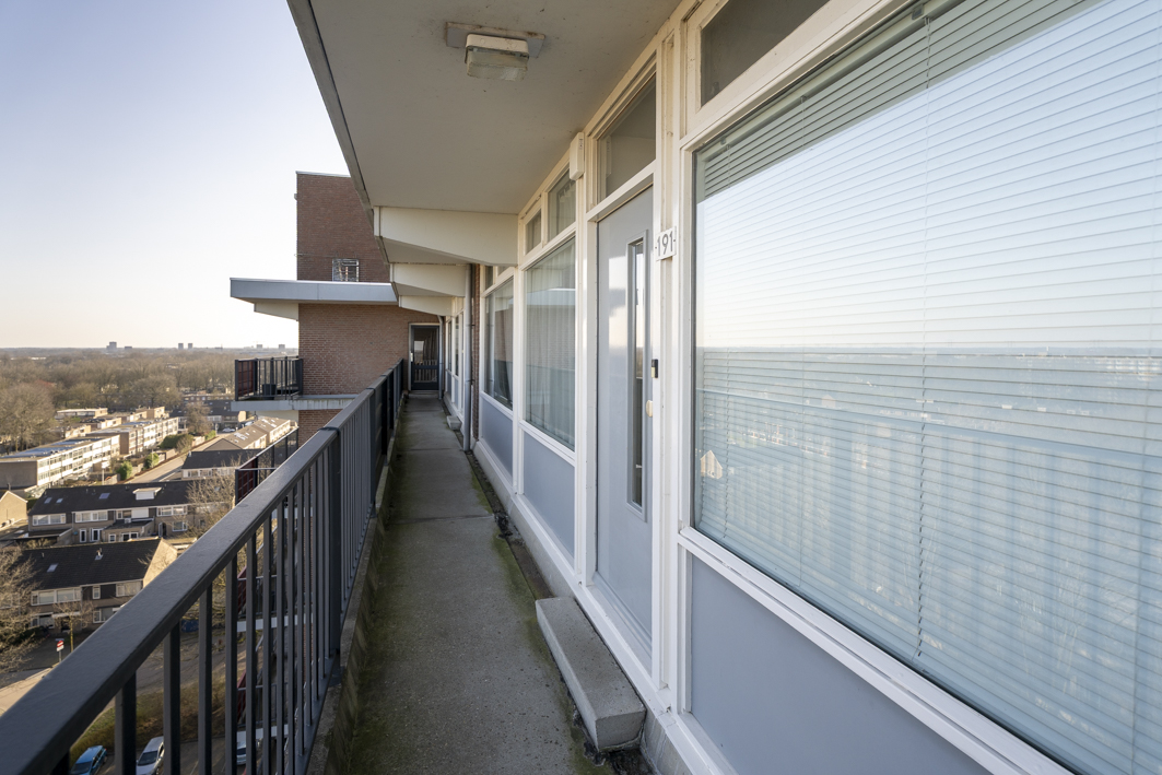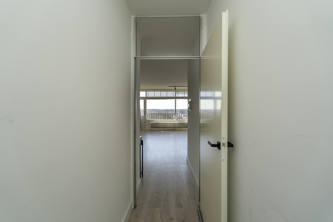 Via de centrale entree van het complex bereik je de bergingen, het trappenhuis en uiteraard de lift die je comfortabel naar de twaalfde verdieping brengt. Vanaf de galerij stap je zo de voordeur van dit verzorgde appartement binnen.