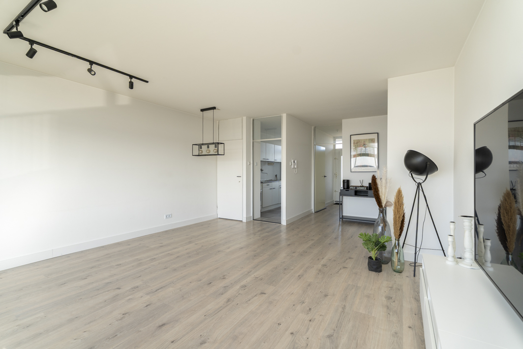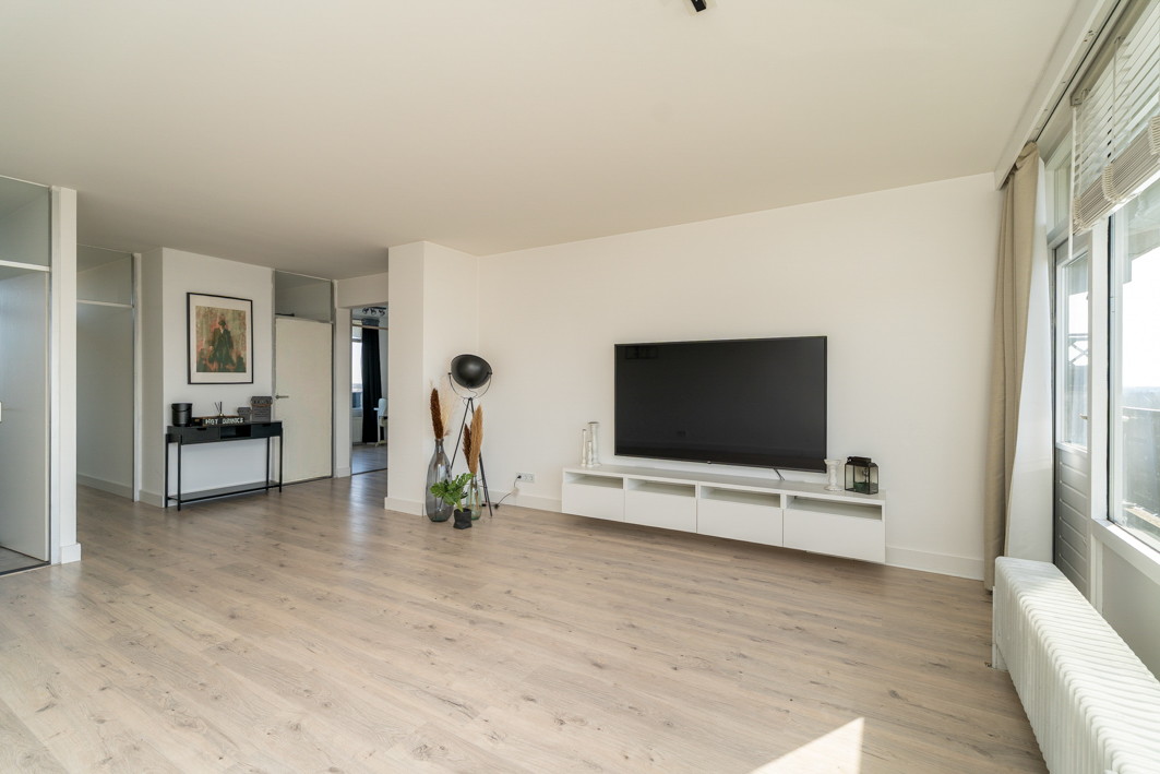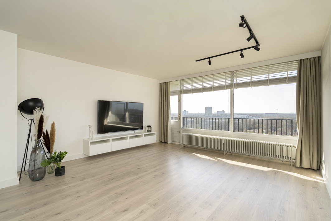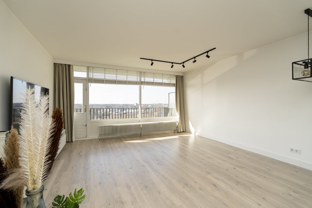Bij binnenkomst kom je in de hal die toegang geeft tot de woonkamer. De ruime en lichte woonkamer is afgewerkt met een nette laminaatvloer en strak gestucte wanden en plafonds. Dankzij de grote raampartijen geniet je hier van veel daglicht en een prachtig uitzicht over de stad. Vanuit de woonkamer stap je via een loopdeur zo het balkon op, een heerlijke plek om van de middag- en avondzon te genieten.