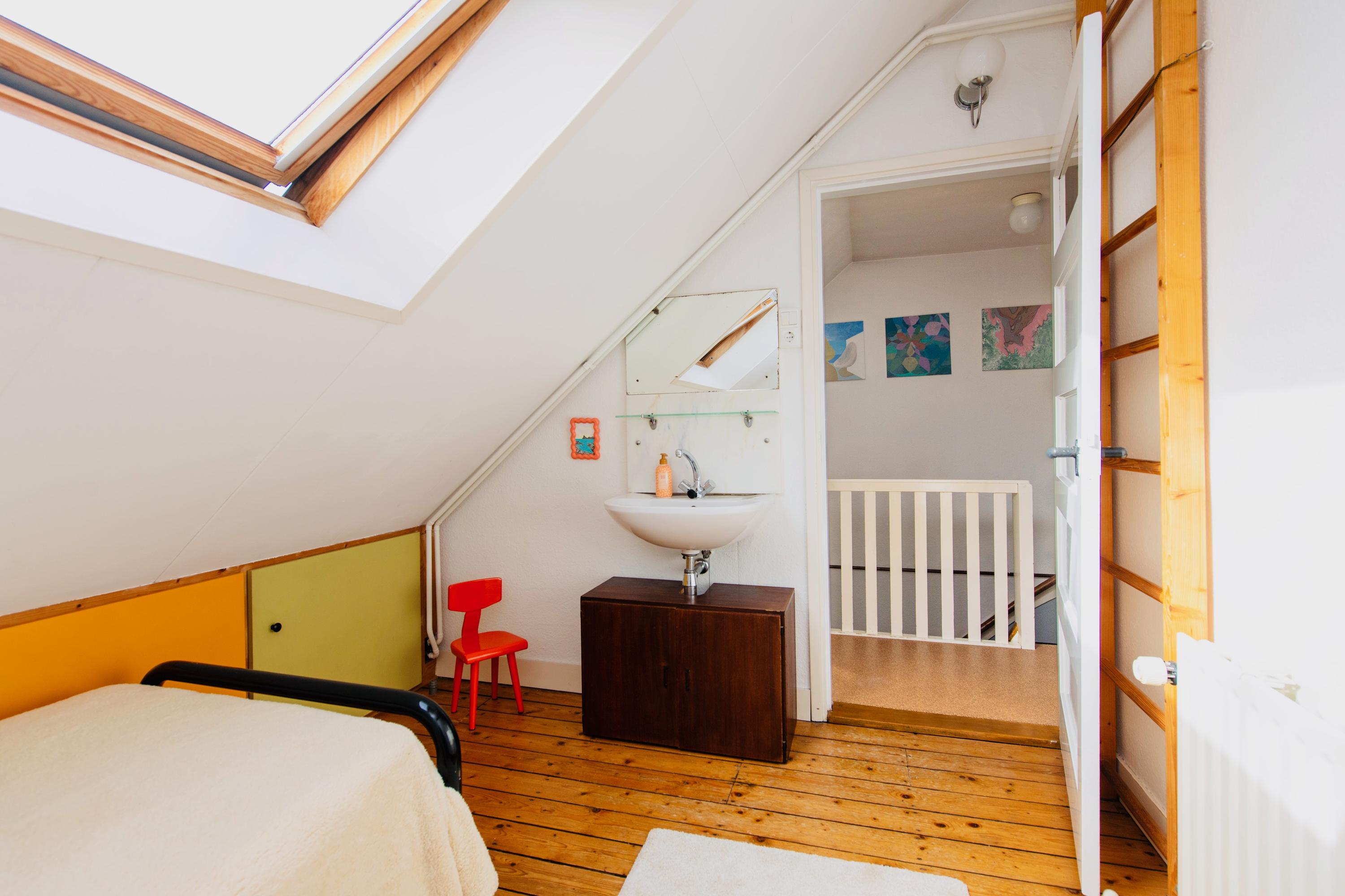 - slaapkamer voorzijde voorzien van wastafel, velux dakraam, vaste kasten en toegang tot een ruime bergzolder/vliering.