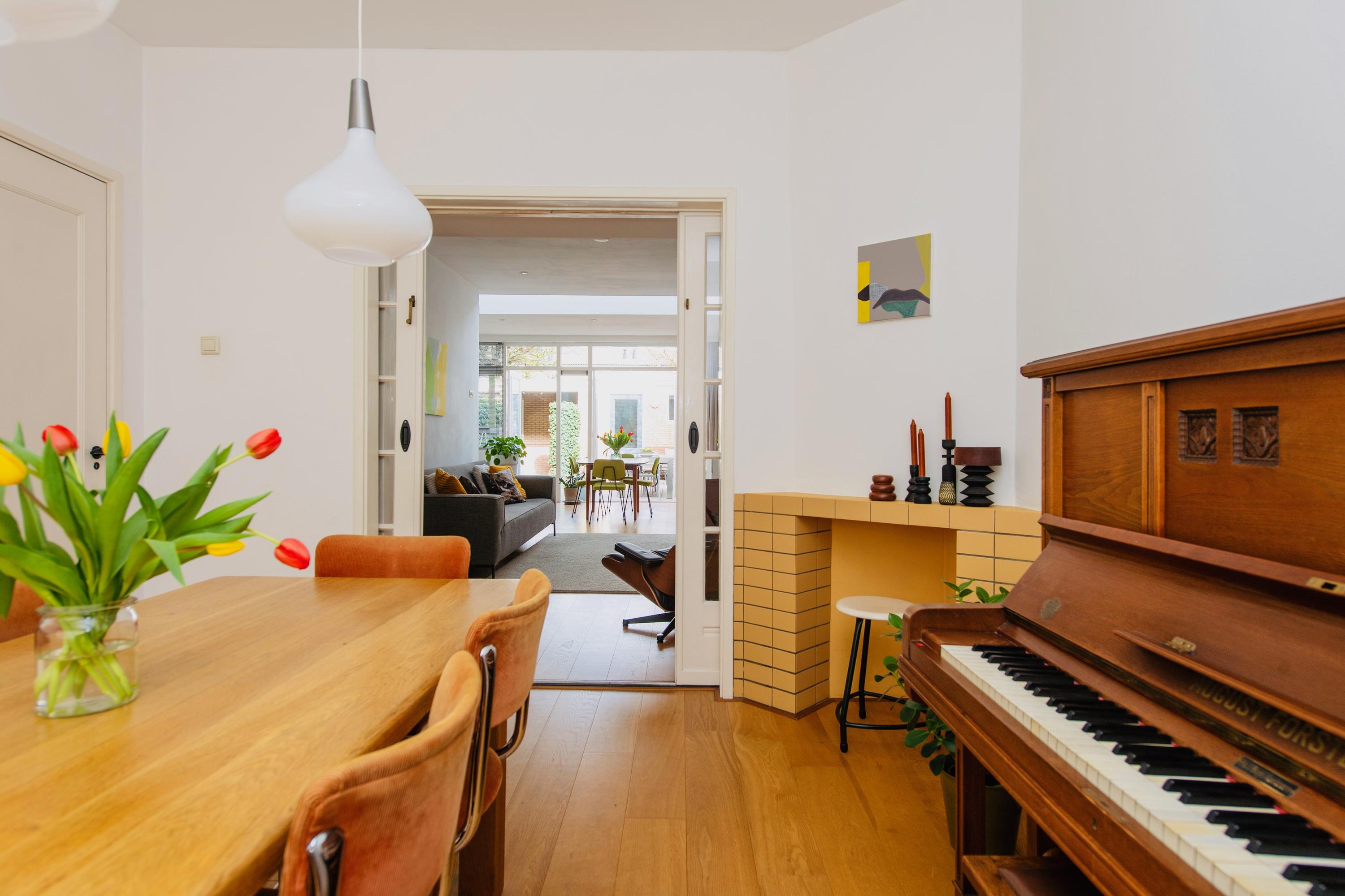 * voorkamer met erker aan de voorzijde, eikenhouten (toplaag) vloerafwerking en en-suite deuren met vaste kast, een zitgedeelte en een eetkamer bij de half-open keuken. De uitbouw biedt extra veel ruimte en mogelijkheden op de begane grond. Dankzij de lichtstraat over de gehele breedte is er een schitterende lichtinval. Door middel van een loopdeur en openslaande tuindeuren is er toegang tot de achtertuin.
