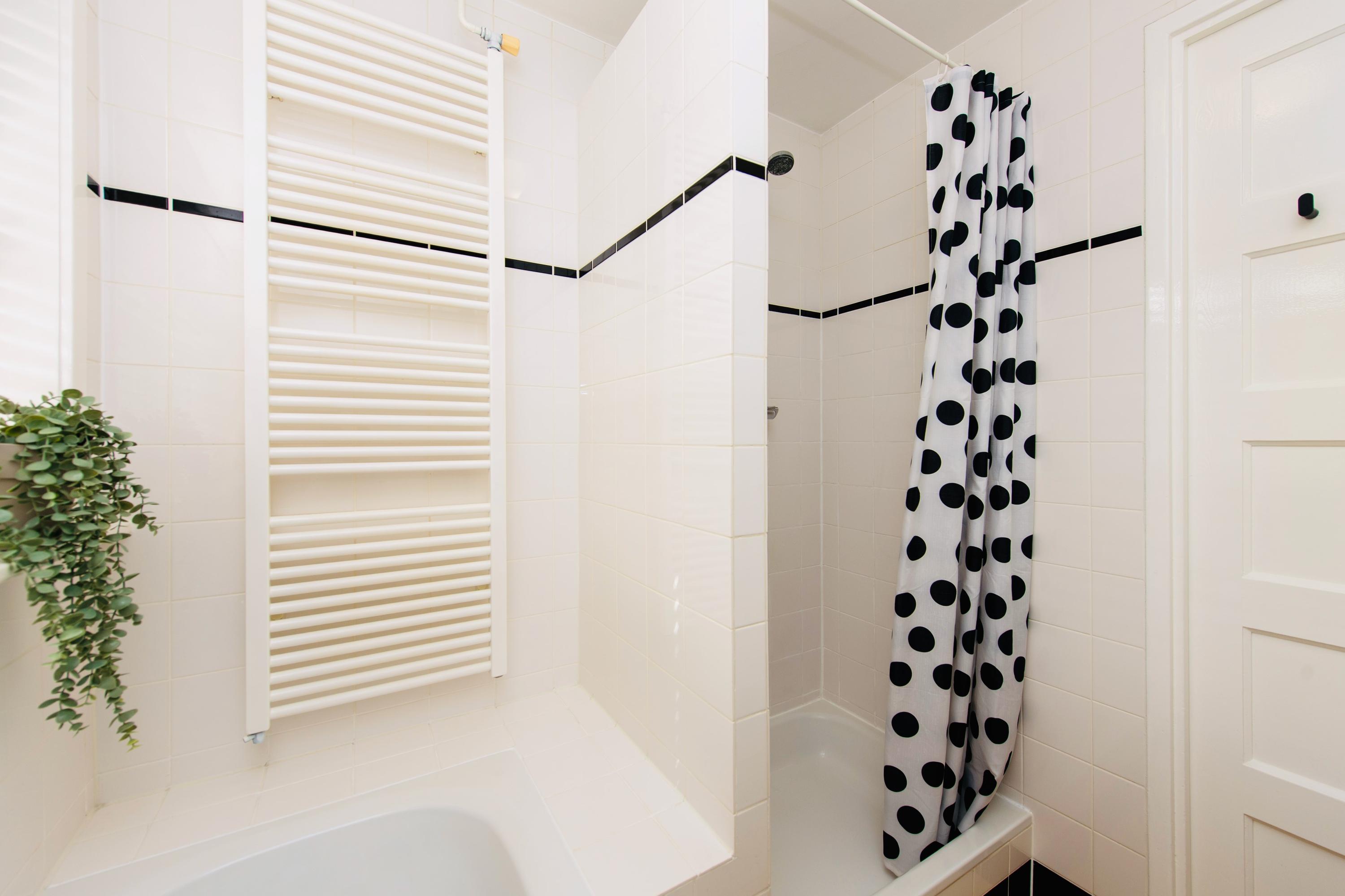 - badkamer met ligbad, douche, vaste wastafel en designradiator.