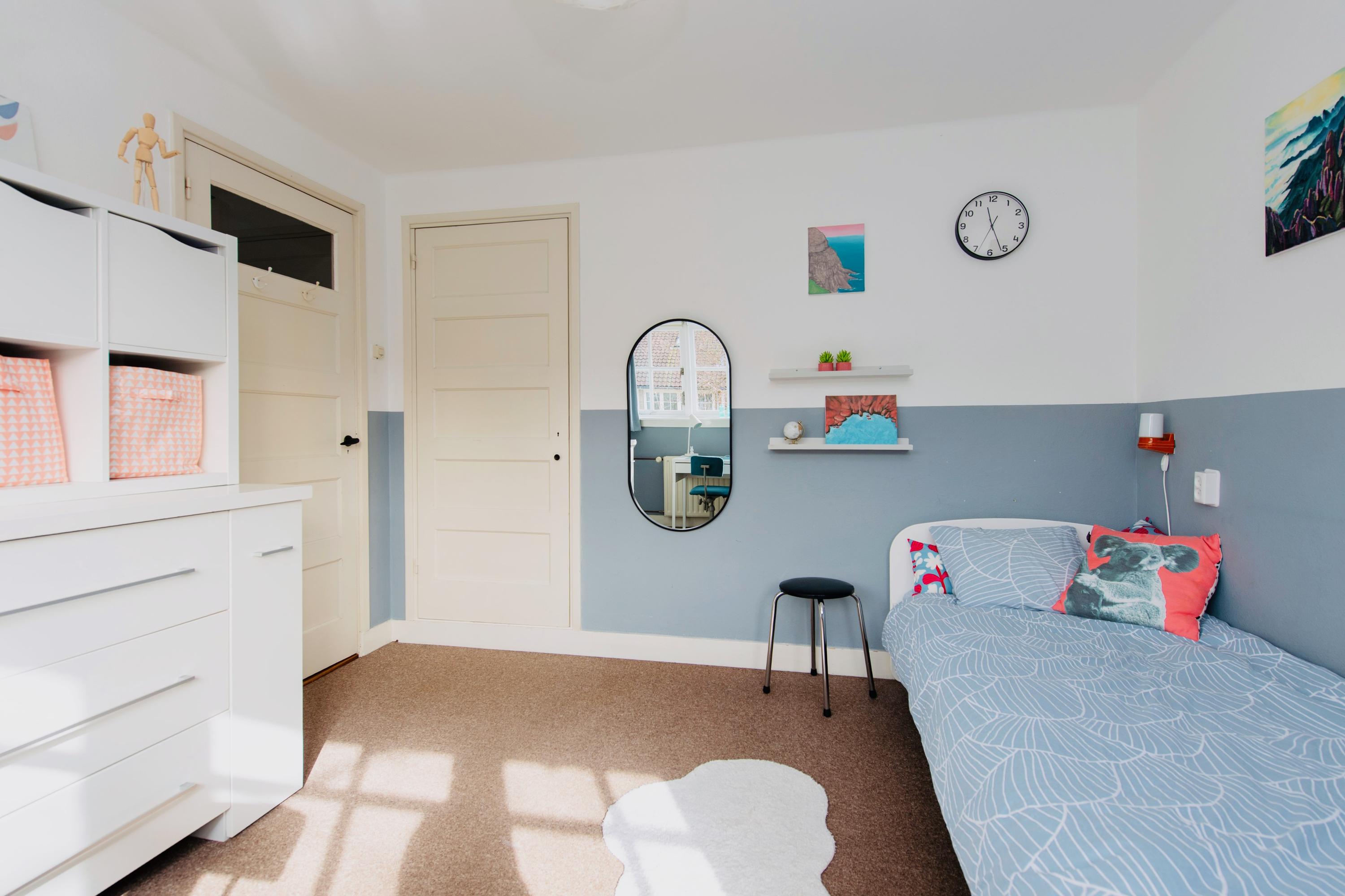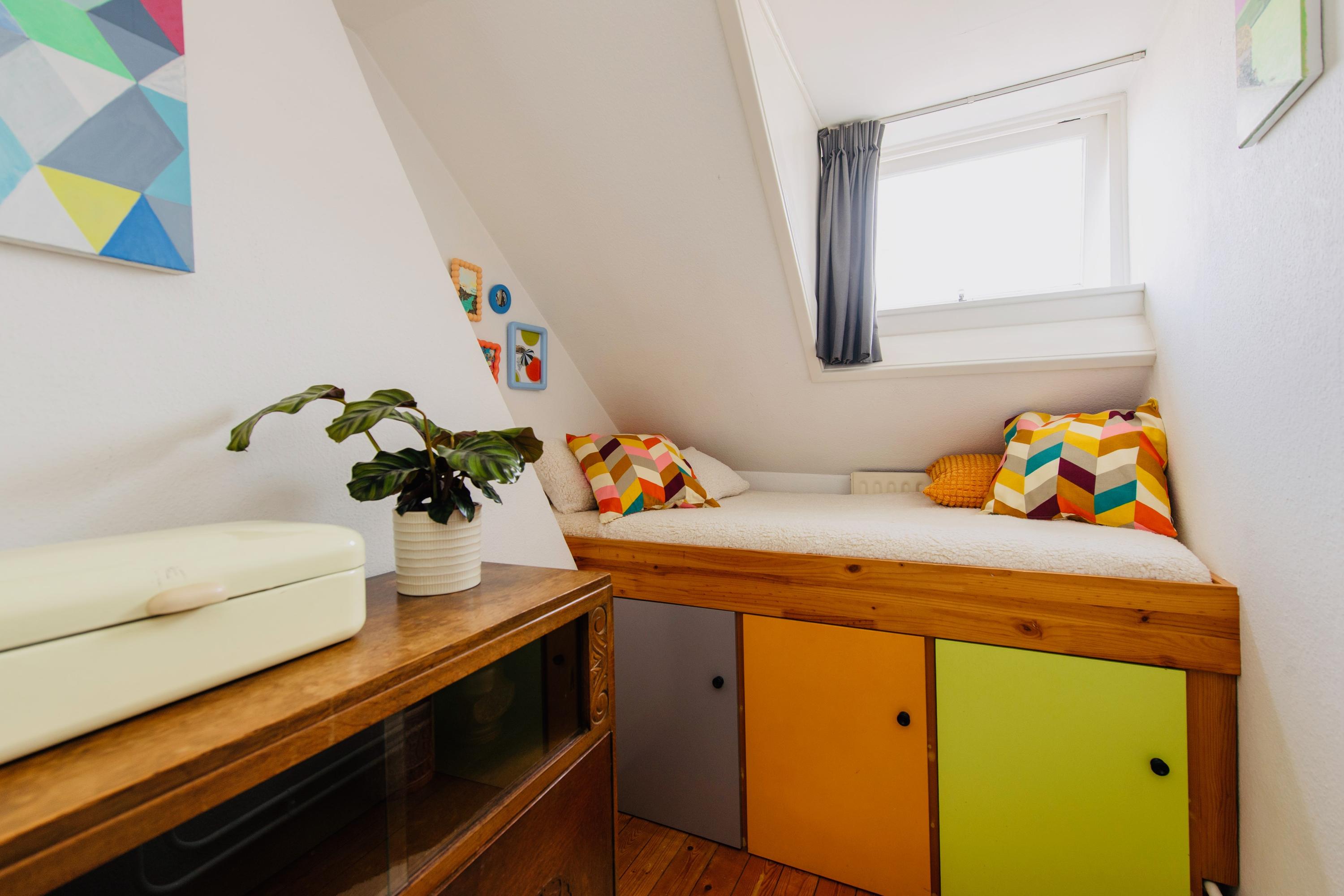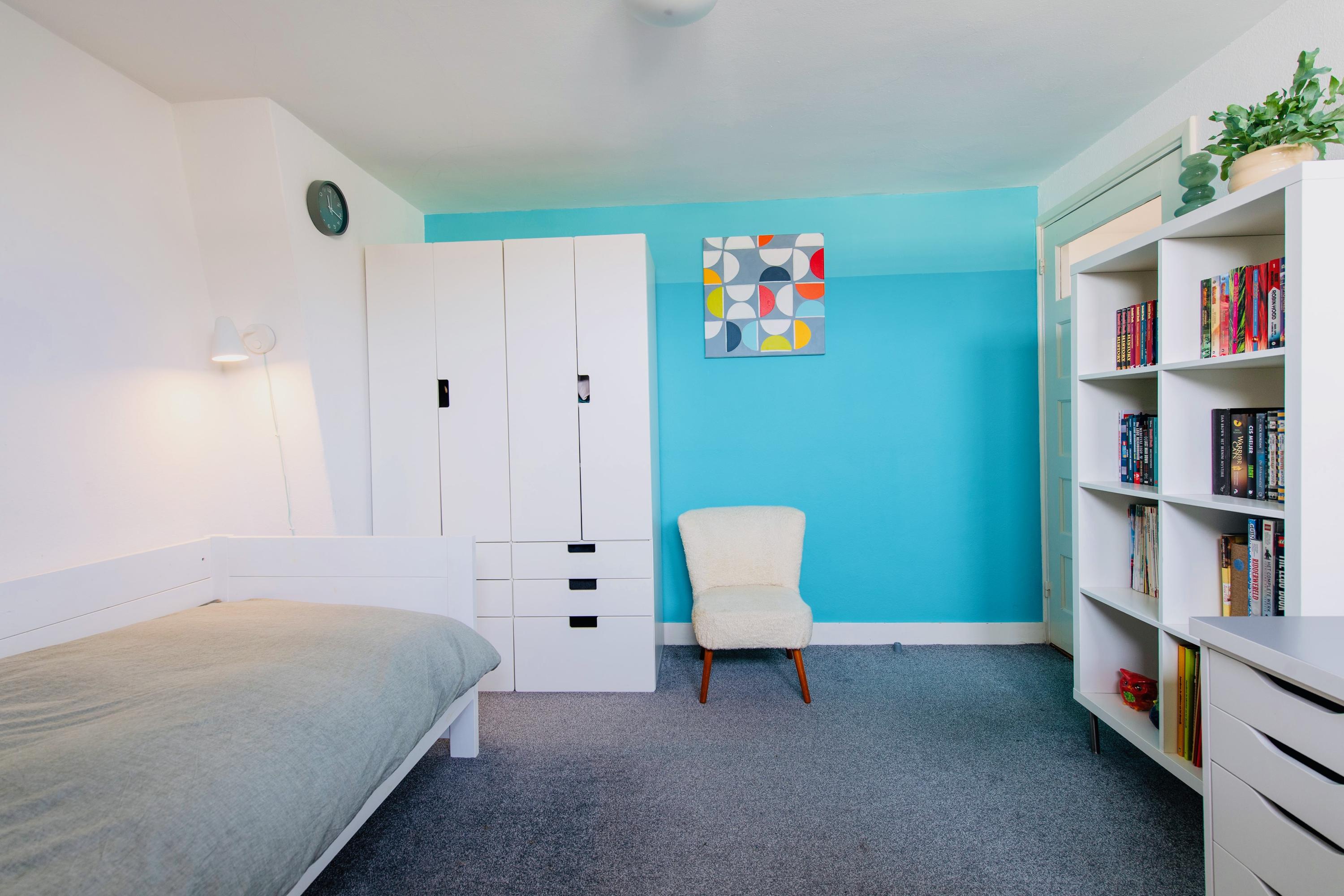 - sfeervolle derde slaap-/werkkamer met een vast bed voorzien van vaste kasten.