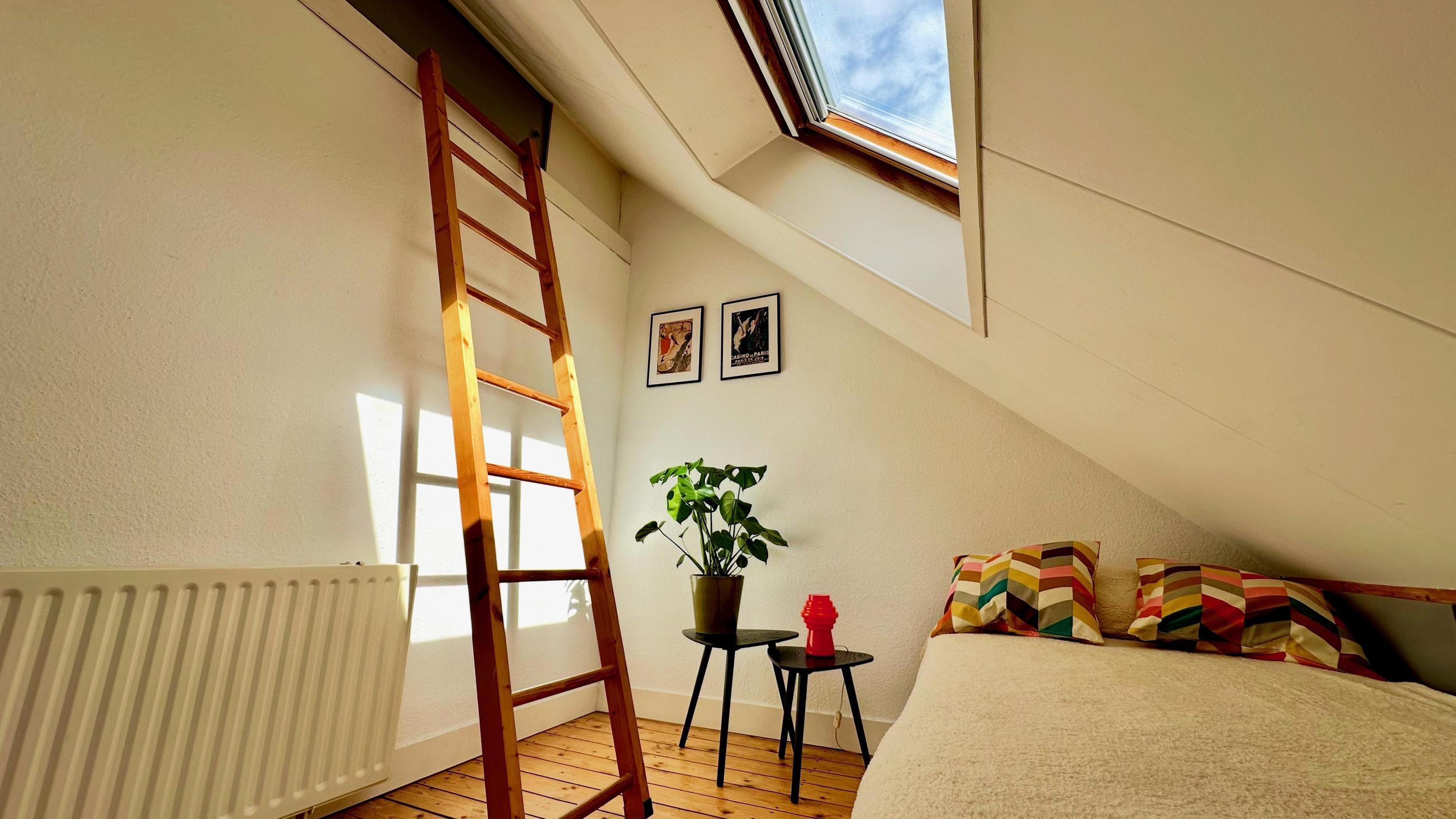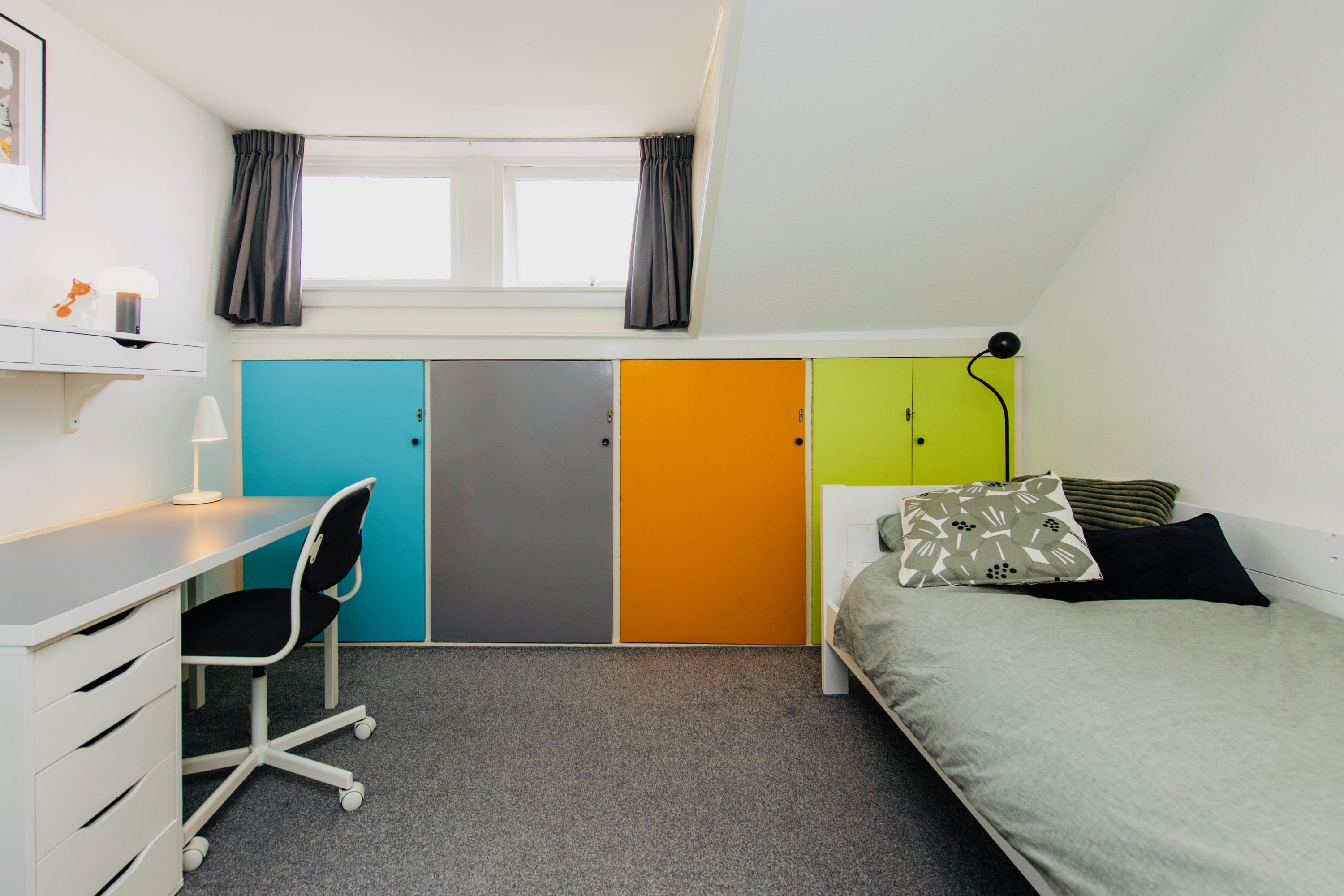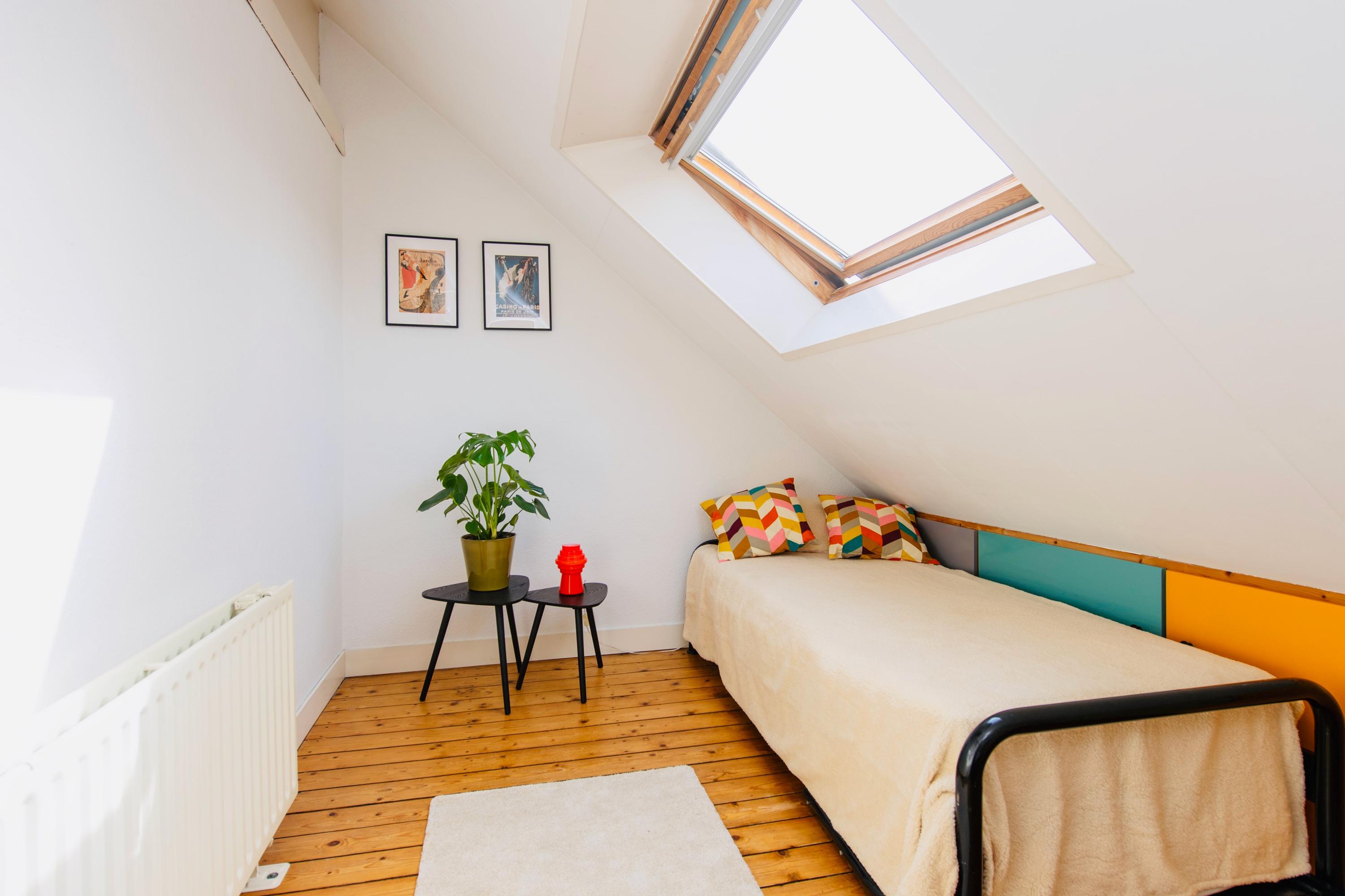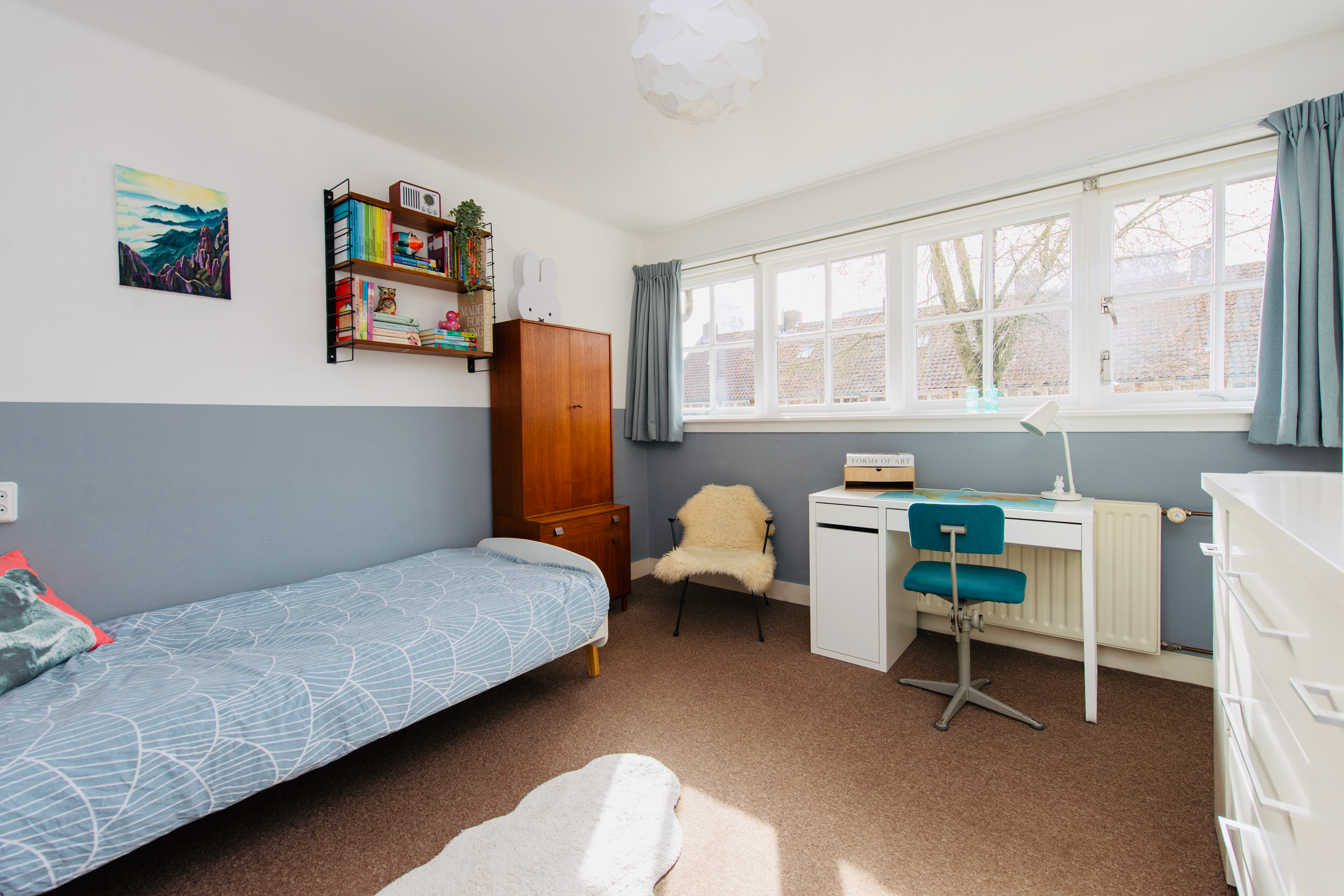 - sfeervolle derde slaap-/werkkamer met een vast bed voorzien van vaste kasten.