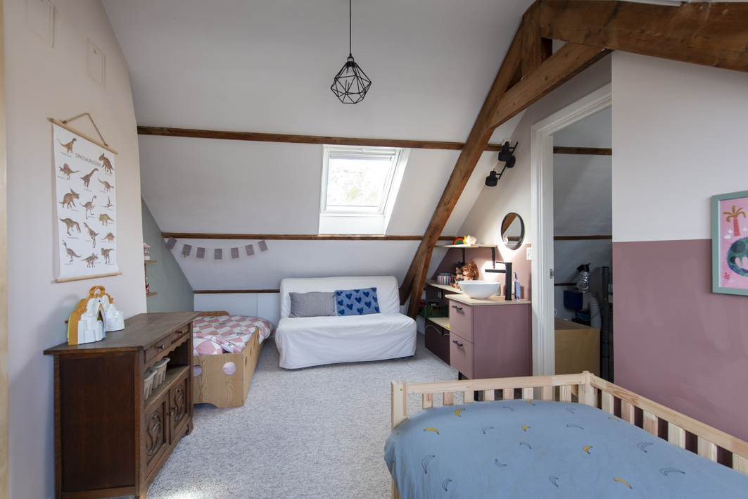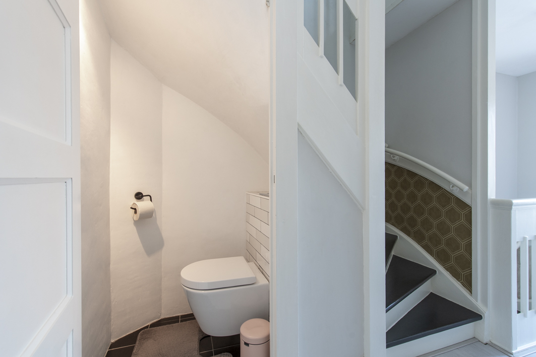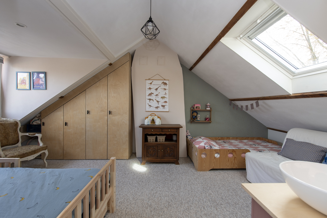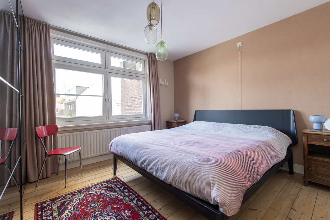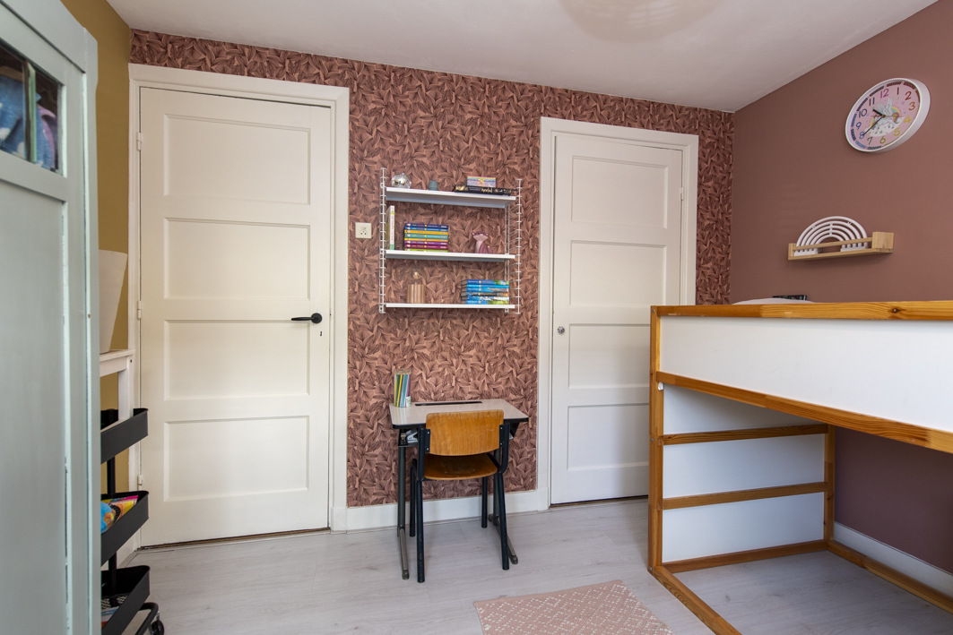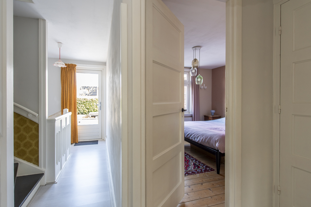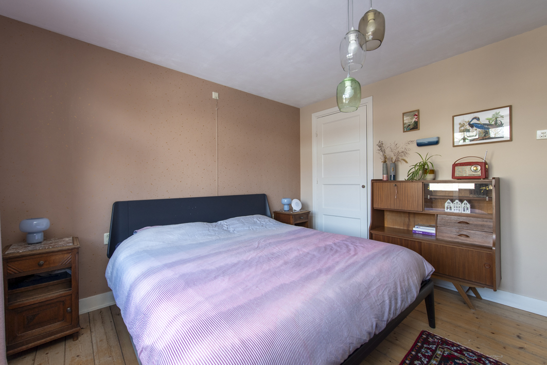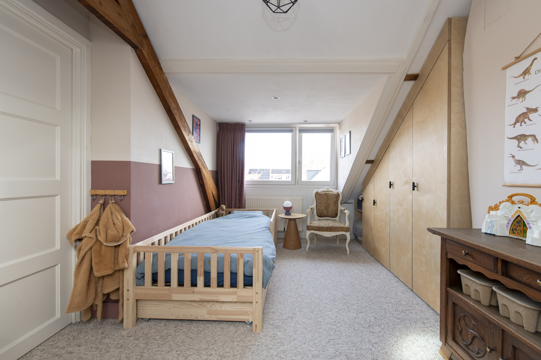 De in 2018 vernieuwde zolderverdieping is een echte verrassing. Dankzij de brede dakkapel over de volledige achterzijde is hier een royale en lichte derde slaapkamer ontstaan, met het originele spant zichtbaar voor extra karakter. Deze kamer is voorzien van een inbouwkast en wastafel.