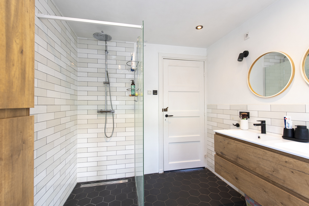 De moderne badkamer (2016) is voorzien van een whirlpoolligbad, een ruime inloopdouche met regen- en handdouche en een dubbel wastafelmeubel. Dankzij de vloerverwarming is het hier extra comfortabel.