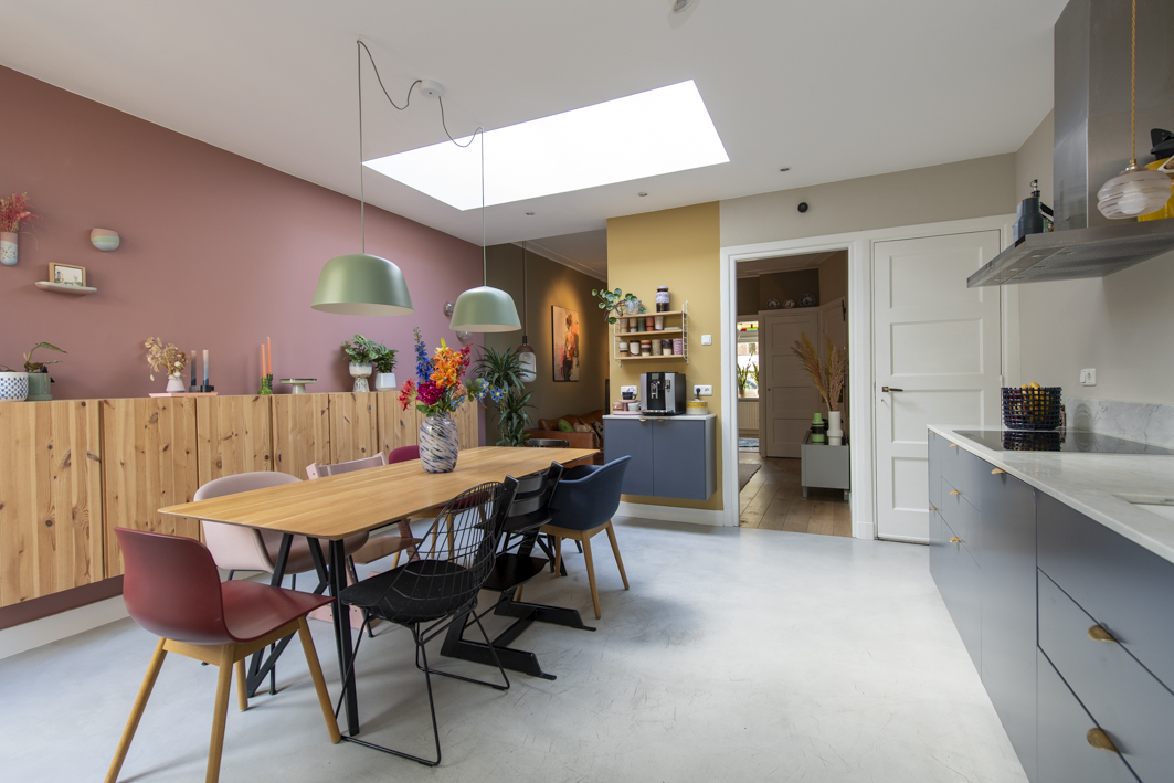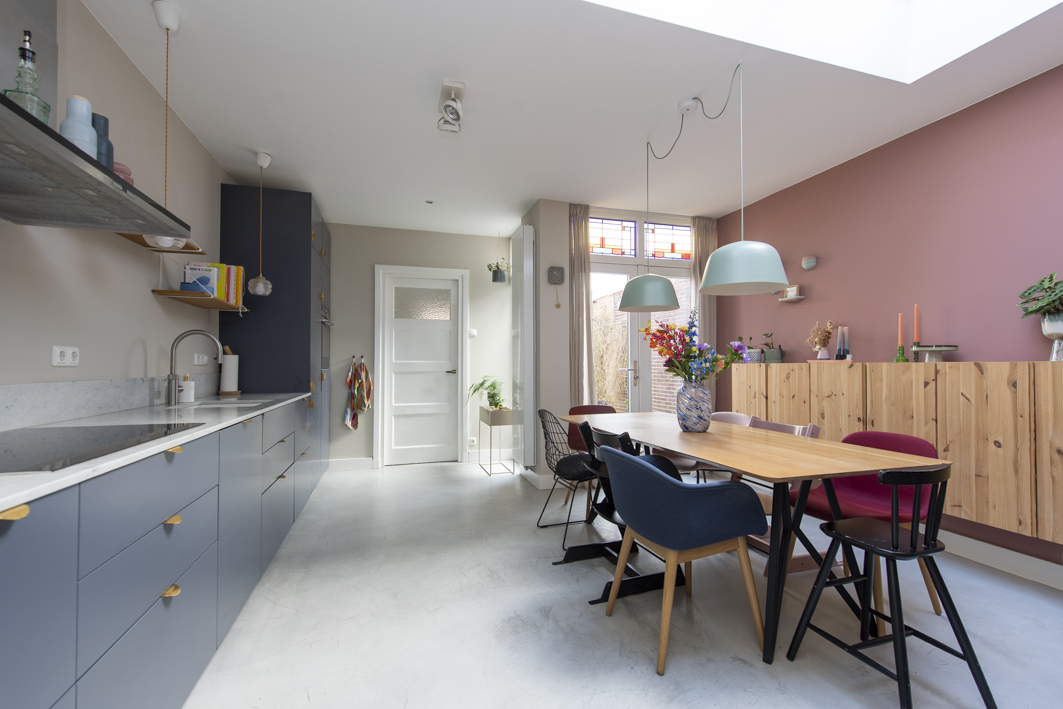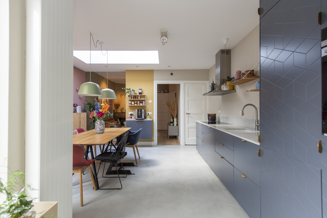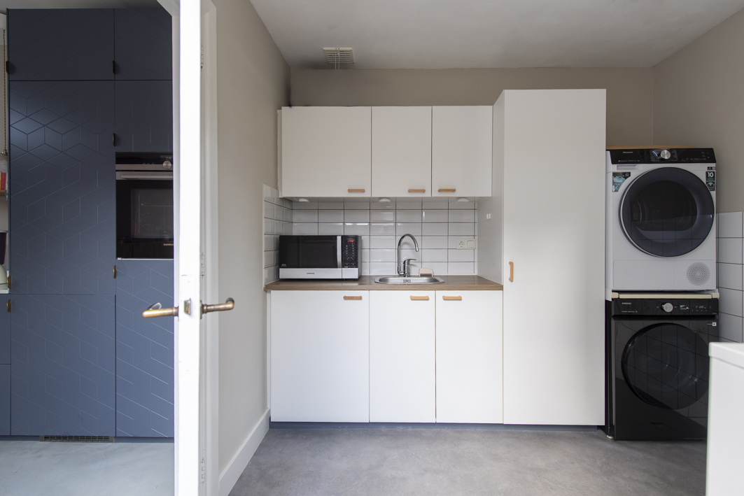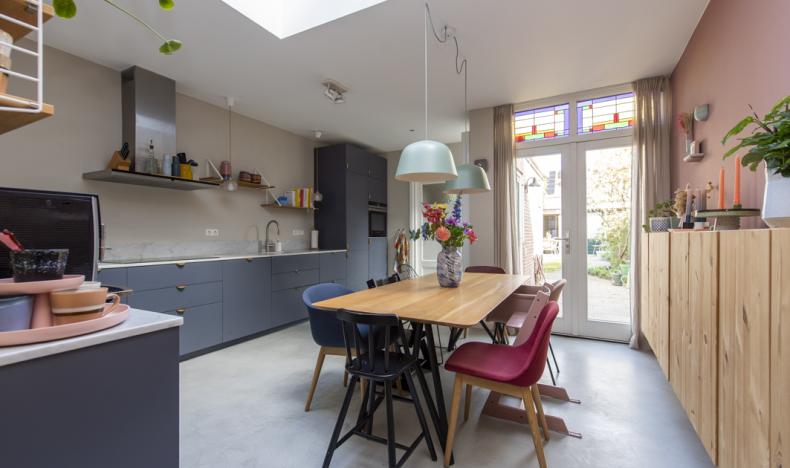 Aan de achterzijde bevindt zich de royale leefkeuken: het hart van het huis. Dankzij de lichtstraat en openslaande tuindeuren is dit een lichte en uitnodigende ruimte waar binnen en buiten naadloos in elkaar overlopen. De moderne keuken (2016) is uitgevoerd in stijlvol donkerblauw en voorzien van alle denkbare inbouwapparatuur, waaronder een Quooker, vaatwasser, (stoom)oven en inductiekookplaat. De koffiecorner maakt het geheel compleet.