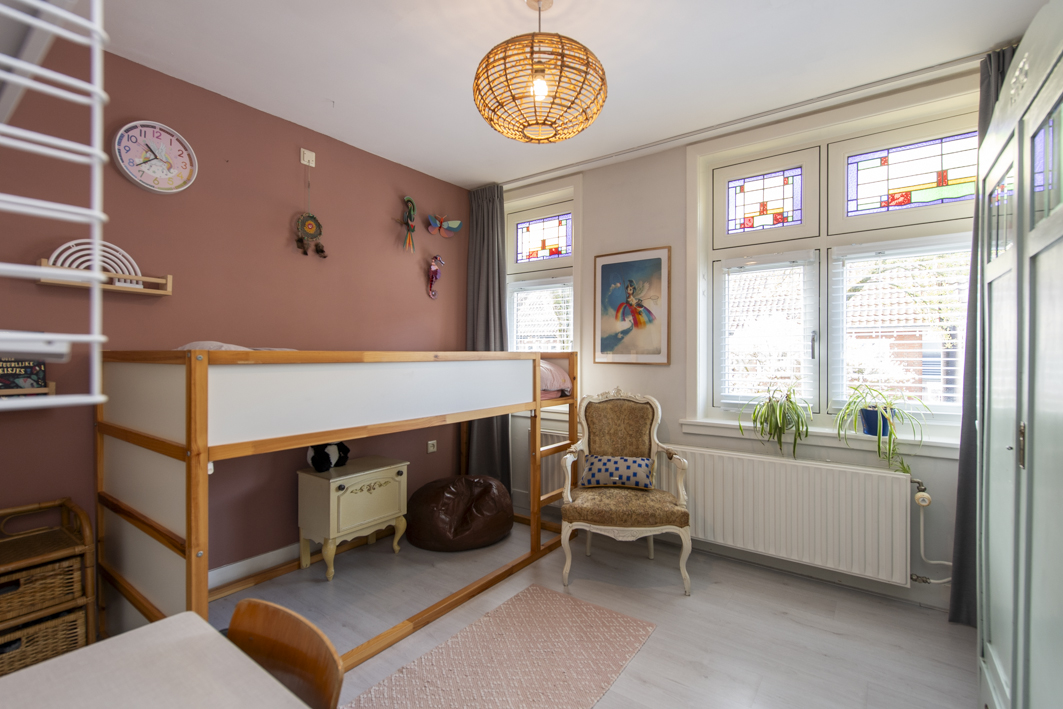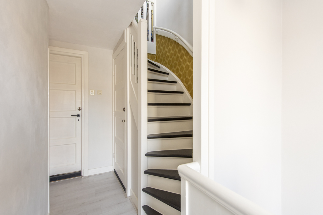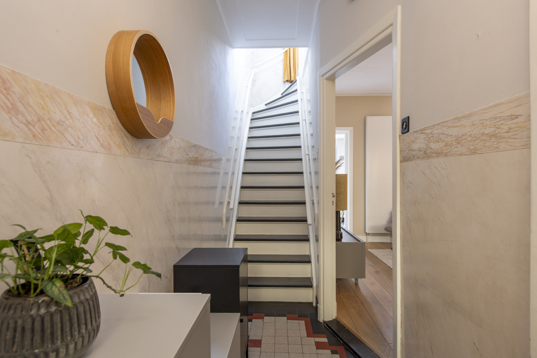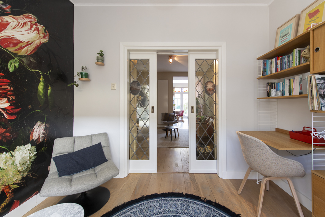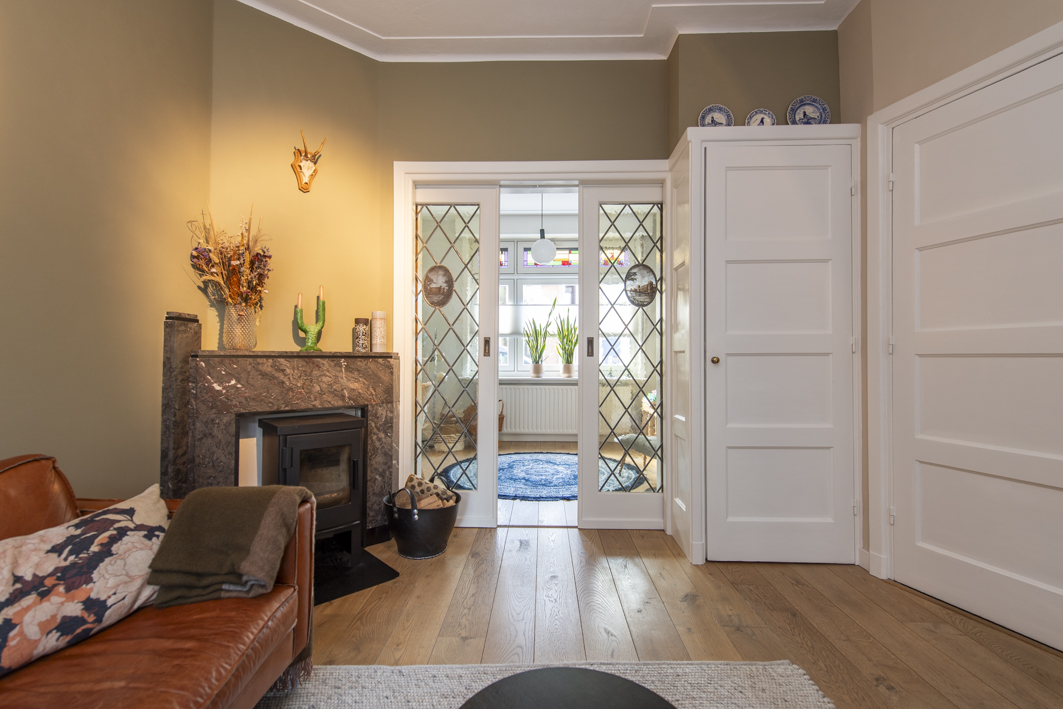 • Karakteristieke jaren ’30-woning met authentieke details zoals glas-in-lood, lambrisering in de hal en schuifdeuren.