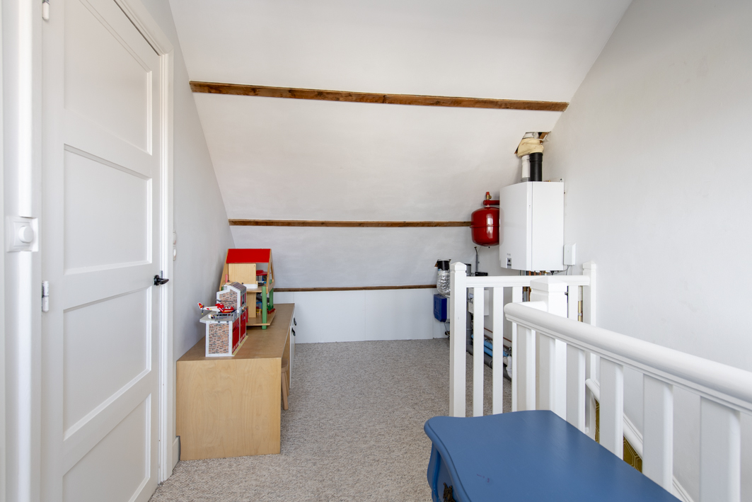 De voorzolder biedt een fijne werkplek — ideaal voor thuiswerken — en is multifunctioneel in te richten. Tevens bevinden zich hier de cv-installatie (Remeha, 2021), ventilatie-unit en omvormer voor de zonnepanelen.