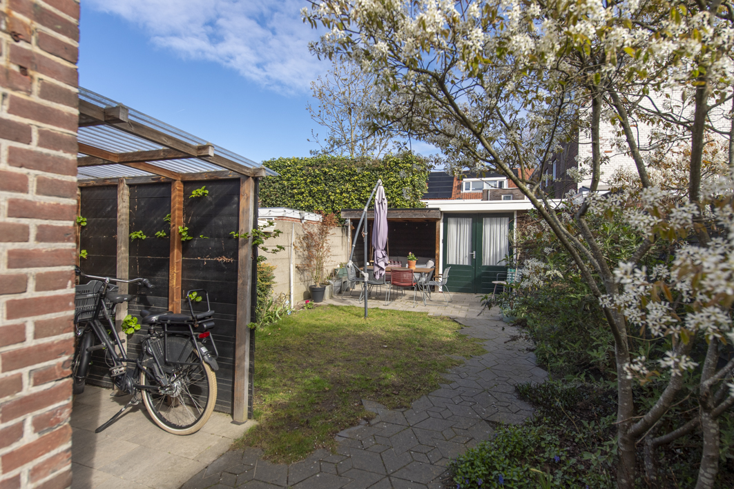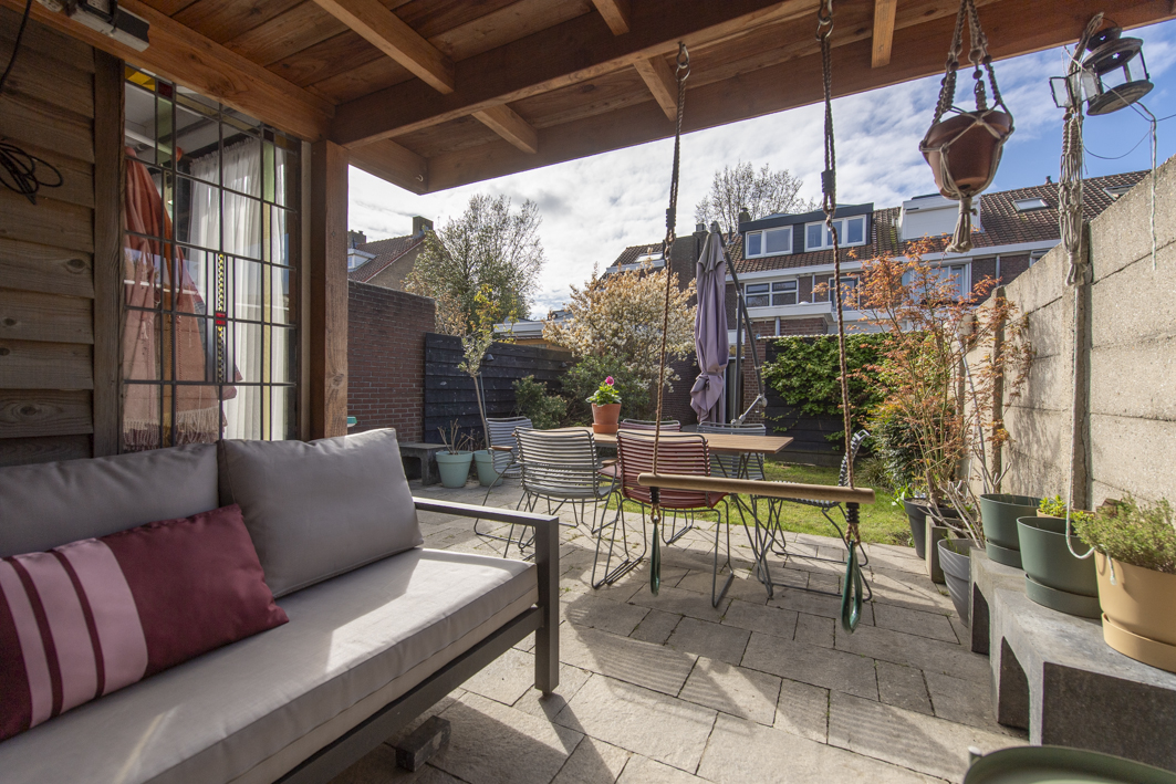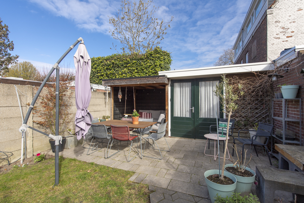 De fraai aangelegde stadstuin met overkapping, bergingen en achterom maakt het plaatje compleet.