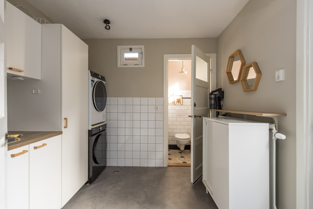 Aansluitend vind je de praktische bijkeuken met kasten, een aanrechtblok met spoelbak, aansluitingen voor wasmachine en droger en toegang tot de toiletruimte met zwevend toilet, fontein en mechanische ventilatie. Via de bijkeuken is er toegang tot de tuin.