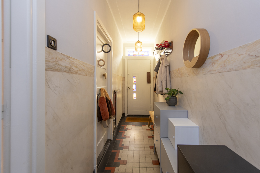 Via de originele voordeur betreed je de ruime hal, waar de authentieke vloertegels en lambrisering direct de sfeer van de woning neerzetten.