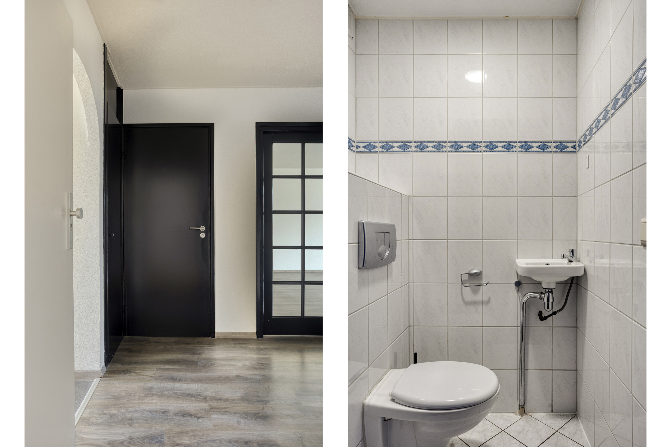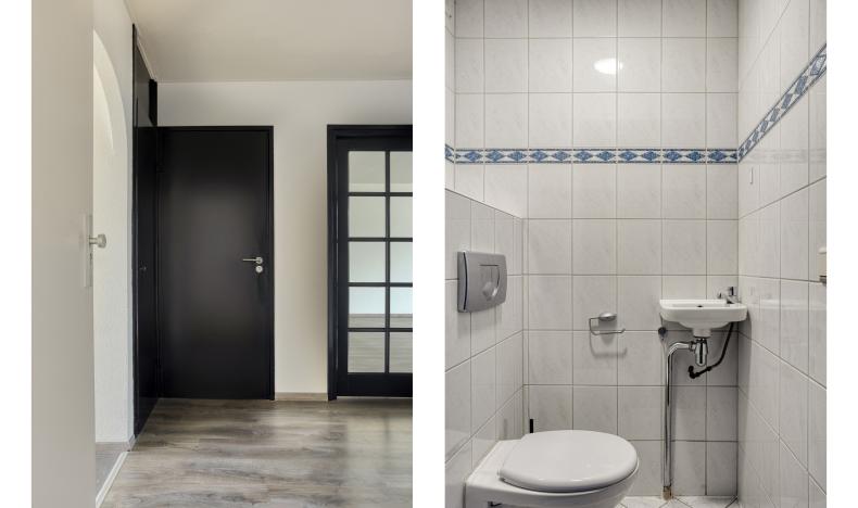 Hal: Ruime hal met meterkast (bergkast) en gedeeltelijk betegeld toilet met zwevend closet en fonteintje. De hal is afgewerkt met een mooie laminaatvloer welke doorloopt in woonkamer en twee slaapkamers.