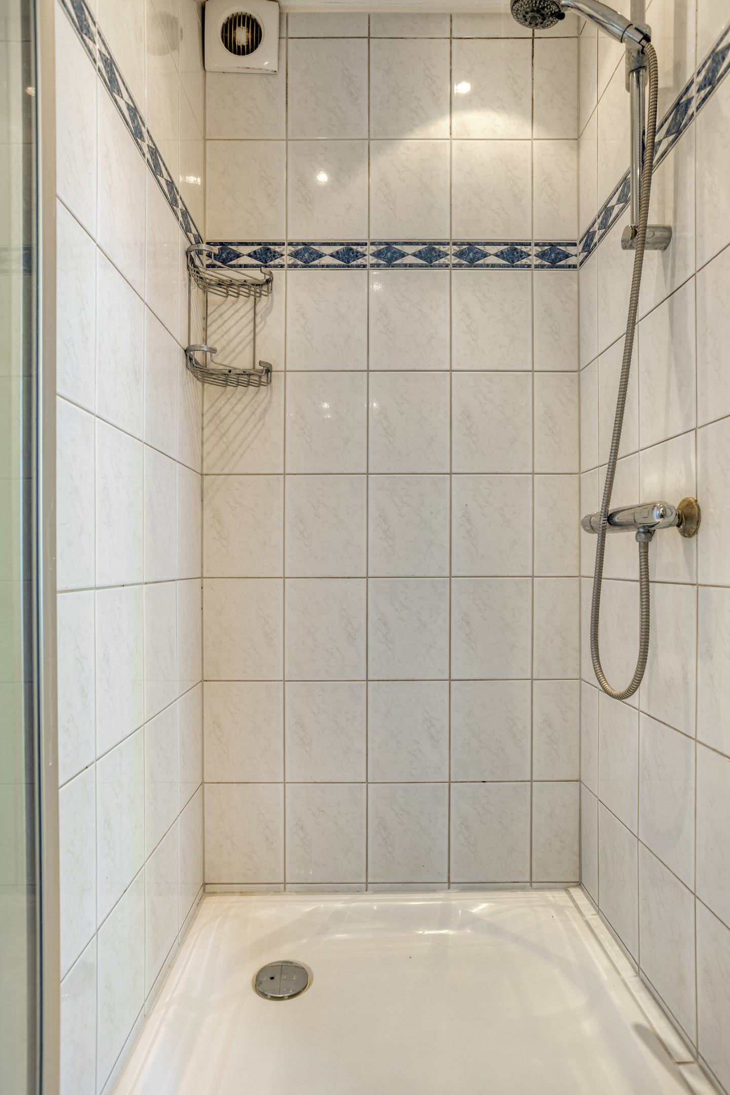 Badkamer: De badkamer is vanuit de keuken toegankelijk en beschikt over een douchecabine en vaste wastafel met onderkast en spiegelkastje.