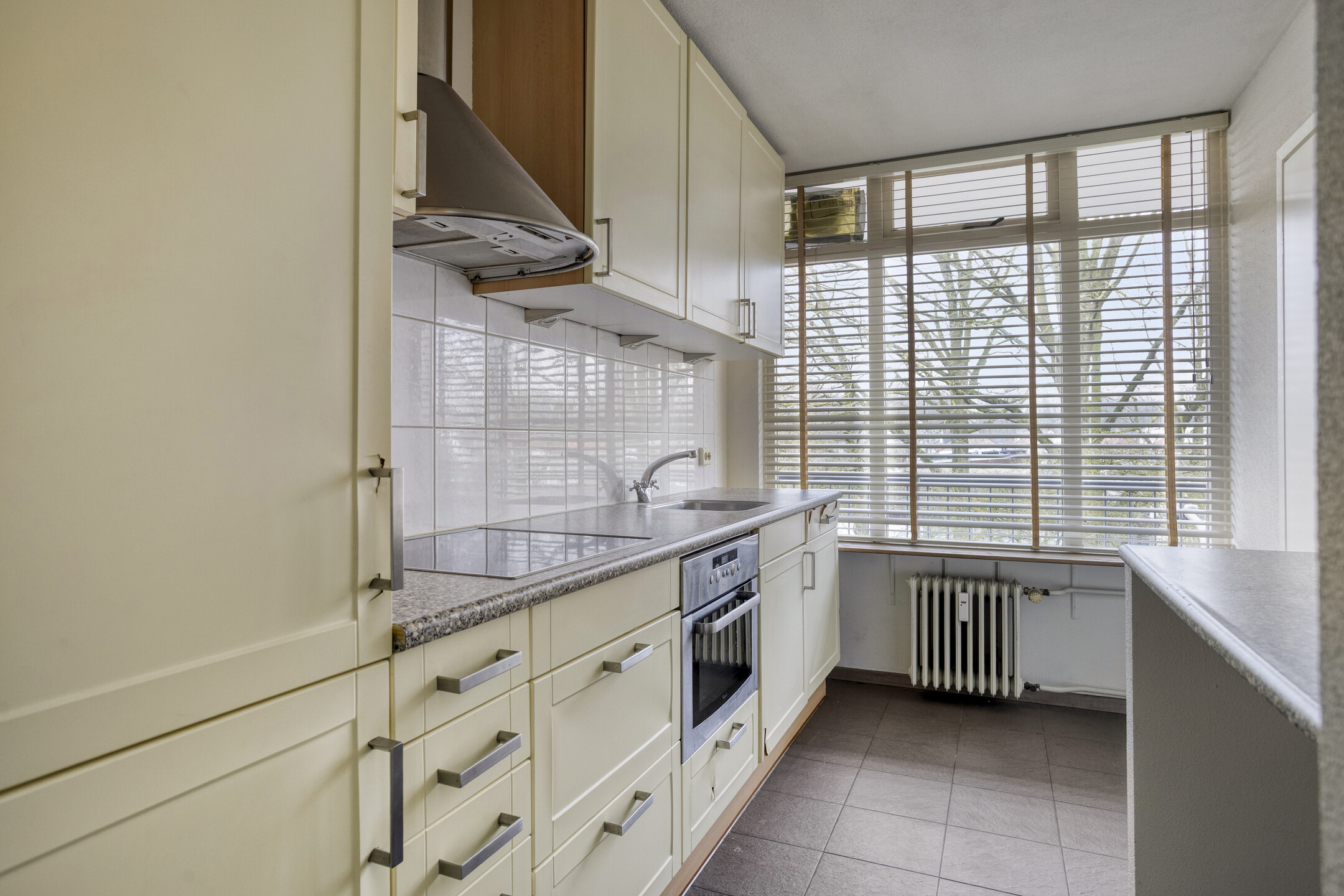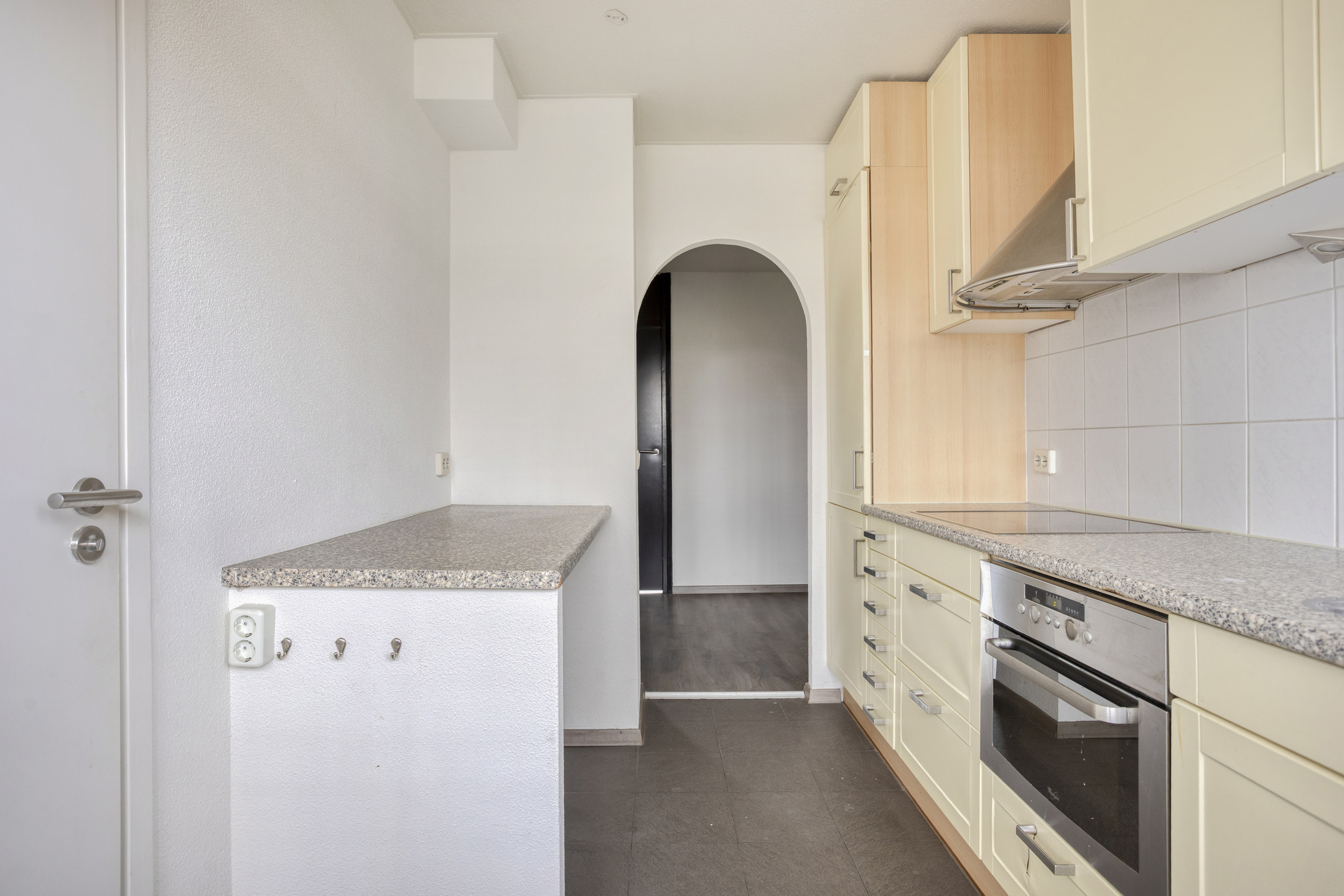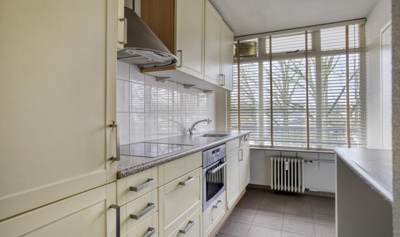 Keuken: Lichte keuken met boven- en onderkasten en aanrecht met kunststof blad, voorzien van spoelbak en inbouw inductie-kookplaat, koel-vries combinatie, vaatwasser en combioven. De wanden gedeeltelijk met tegelwerk afgewerkt. Hier is tevens de was- en droogopstelling gesitueerd. Vanuit de keuken bereikt u de badkamer.