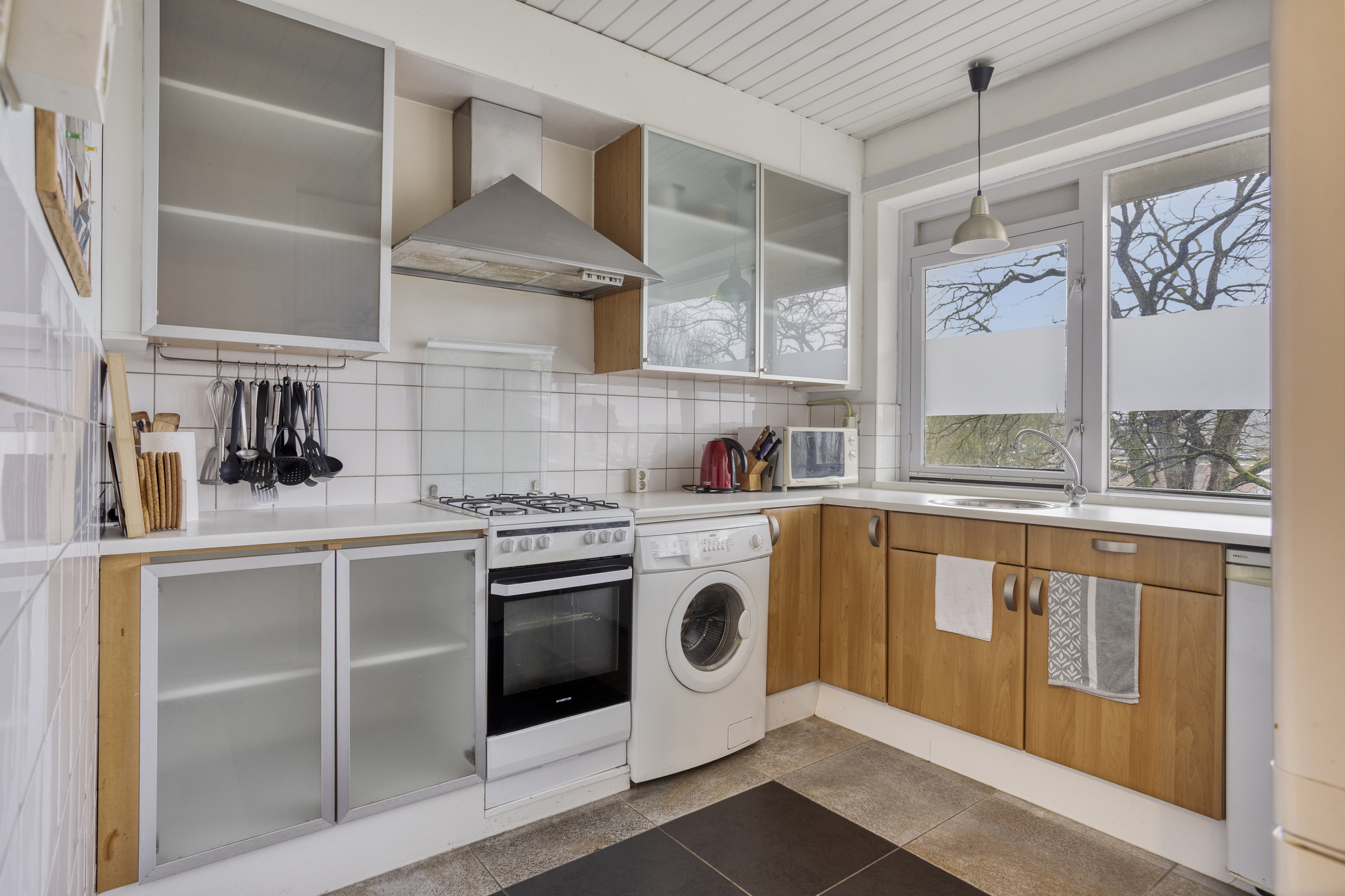 Aan de voorzijde bevindt zich de separate woonkeuken. Deze is functioneel ingericht en biedt voldoende werk- en bergruimte.