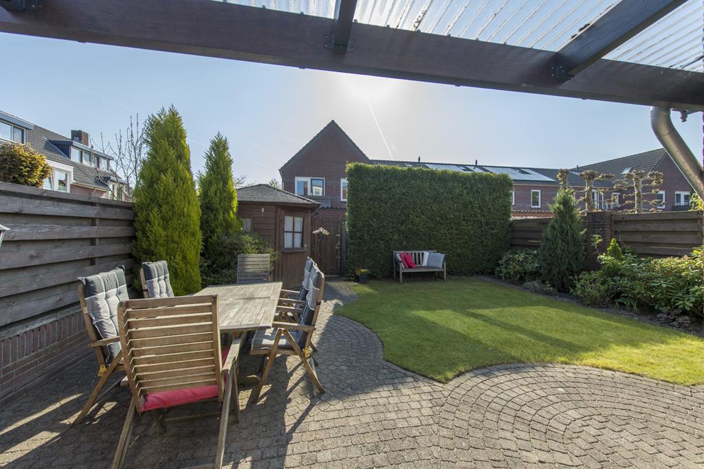 Voortuin en eigen oprit. En een op het oosten gelegen achtertuin, met terras, graspartij en een houten tuinhuis.
