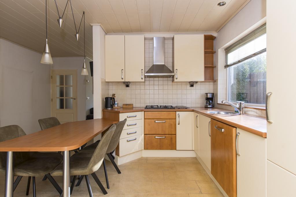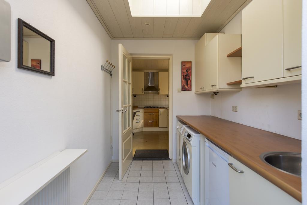 De centraal gelegen keuken is geplaatst in een hoekopstelling en deze is voorzien van inbouwapparatuur, zoals een gaskookplaat met afzuigkap, een koelkast, een vaatwasser en een combi-magnetron/oven. Grenzend aan de keuken is een fijne plek gecreëerd voor het ontbijt of een snelle hap. Vanuit de keuken is de bijkeuken bereikbaar, hier is de aansluiting voor de wasapparatuur aanwezig en naast extra bergruimte ook ruimte voor een vriezer of koelkast. Ook hier is een lichtkoepel geplaatst voor extra lichtinval en vanuit de bijkeuken is de tuin bereikbaar.