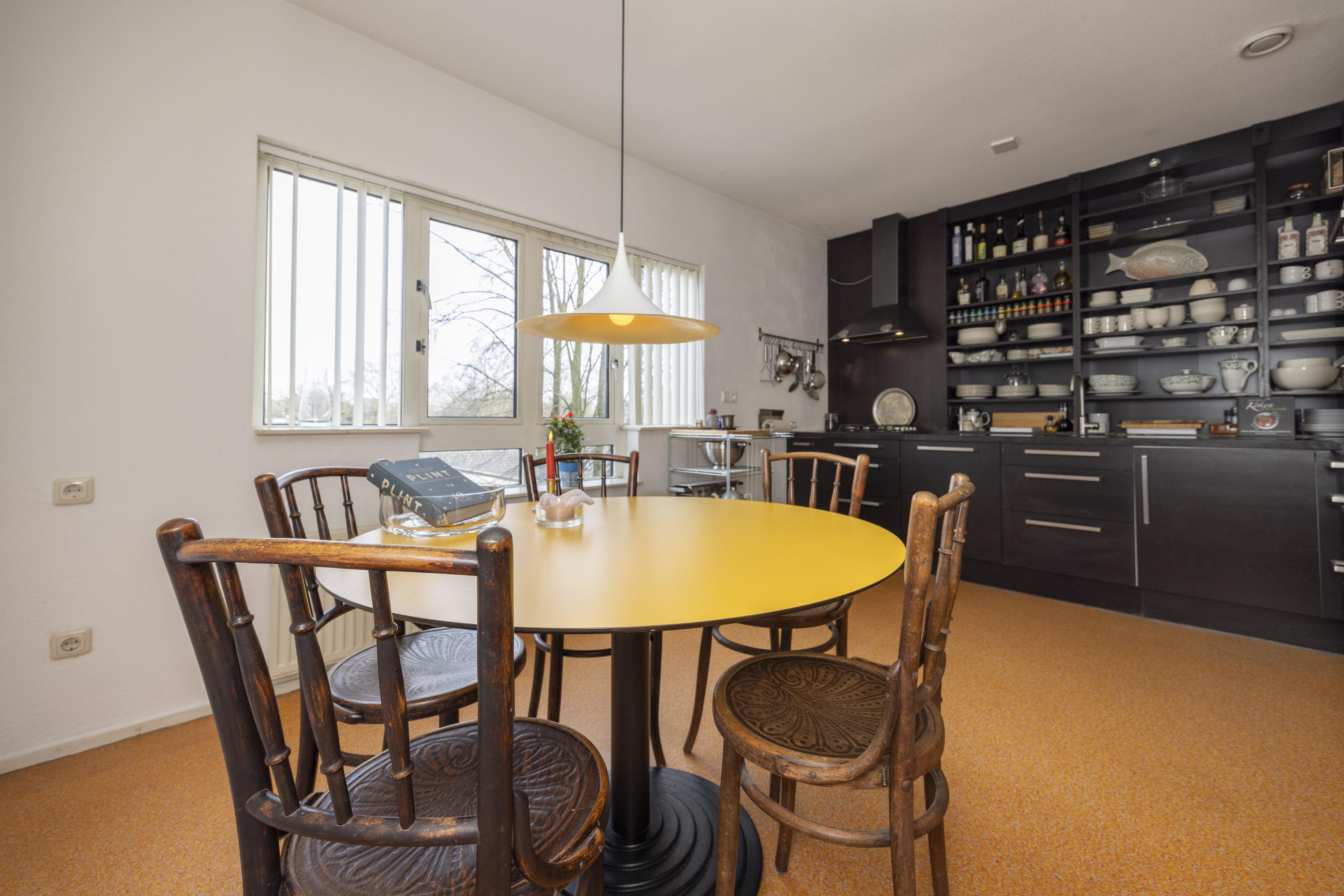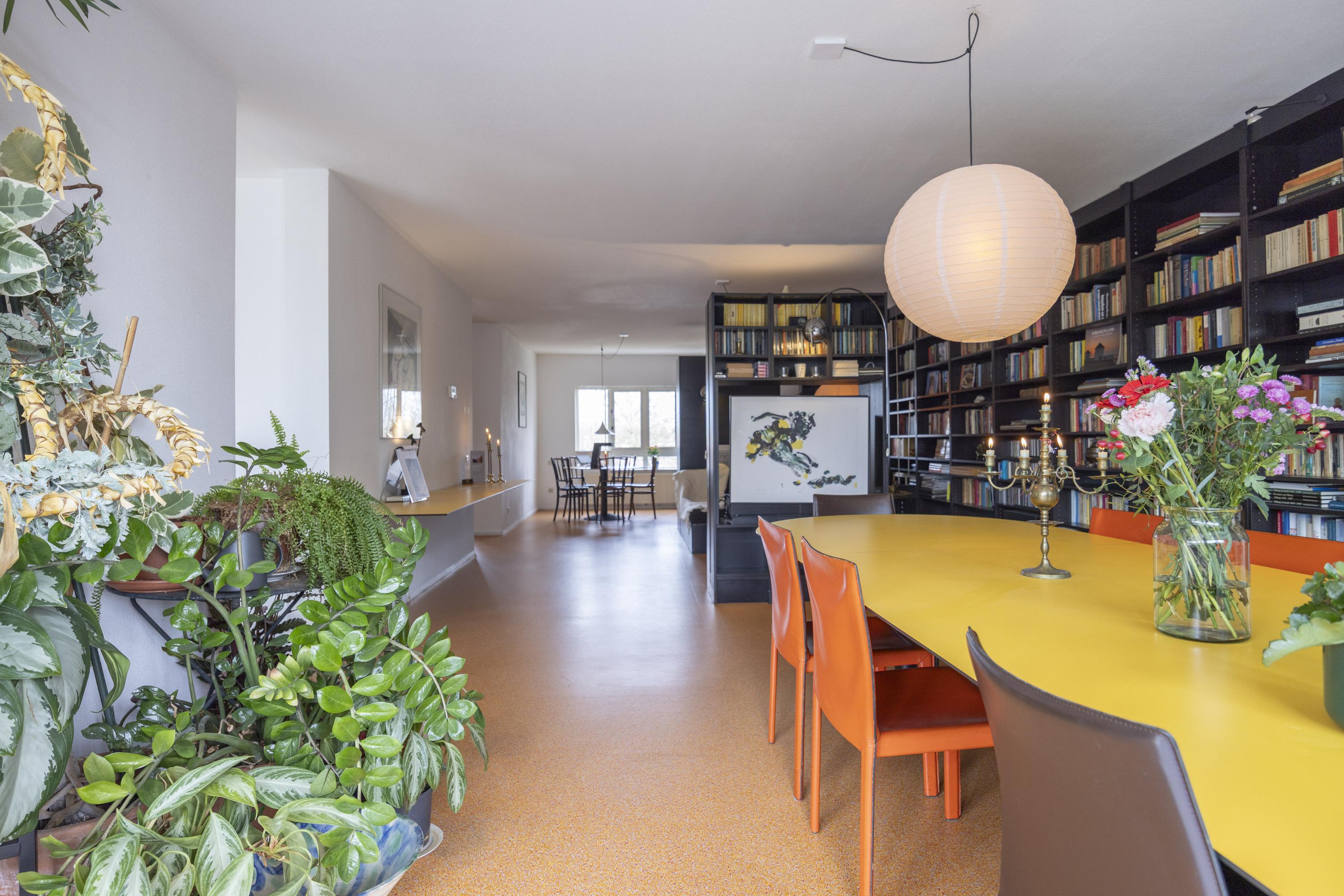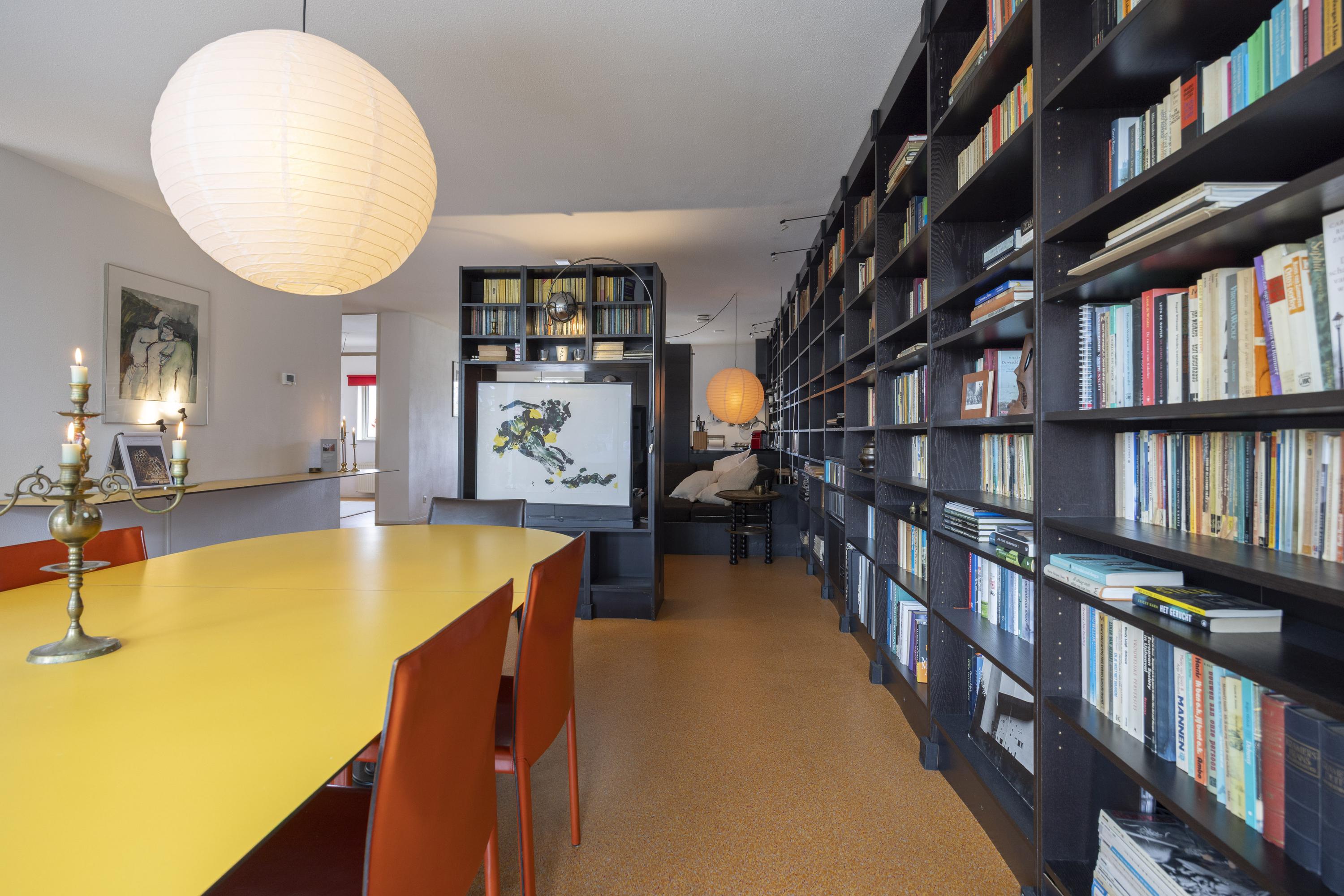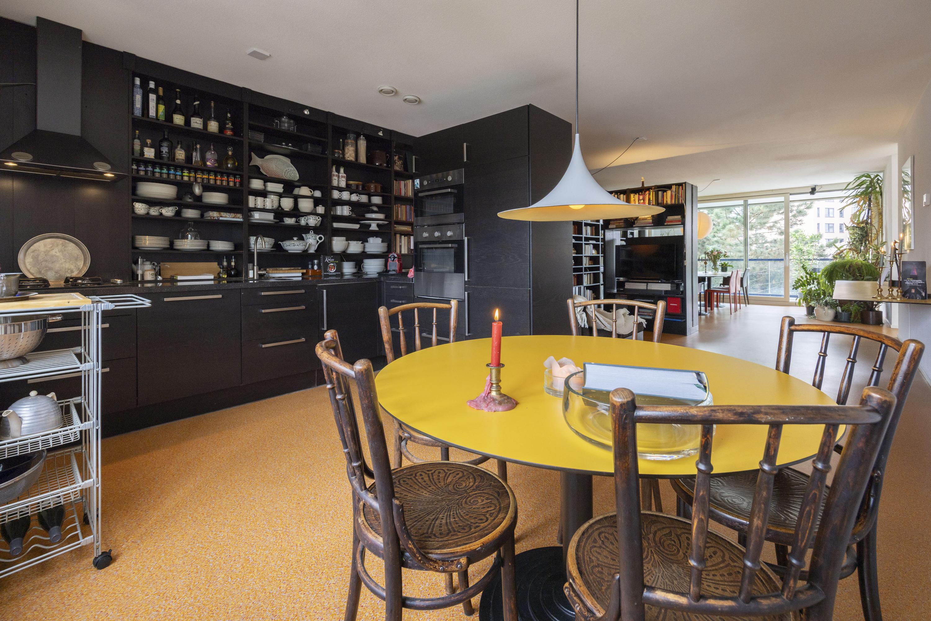 Binnenkomst in een ruime hal met toegang tot de toiletruimte (voorzien van zwevend toilet en fonteintje), een berging en diverse kamers. De woonkamer en open keuken vormen samen een royale leefruimte van circa 57 m². De keuken is uitgevoerd met een op maat gemaakte zwarte inrichting, voorzien van diverse inbouwapparatuur en een bijpassende kastenwand. Deze wand loopt door in de woonkamer, die tevens met een bijpassende roomdivider en bank is ingericht.
