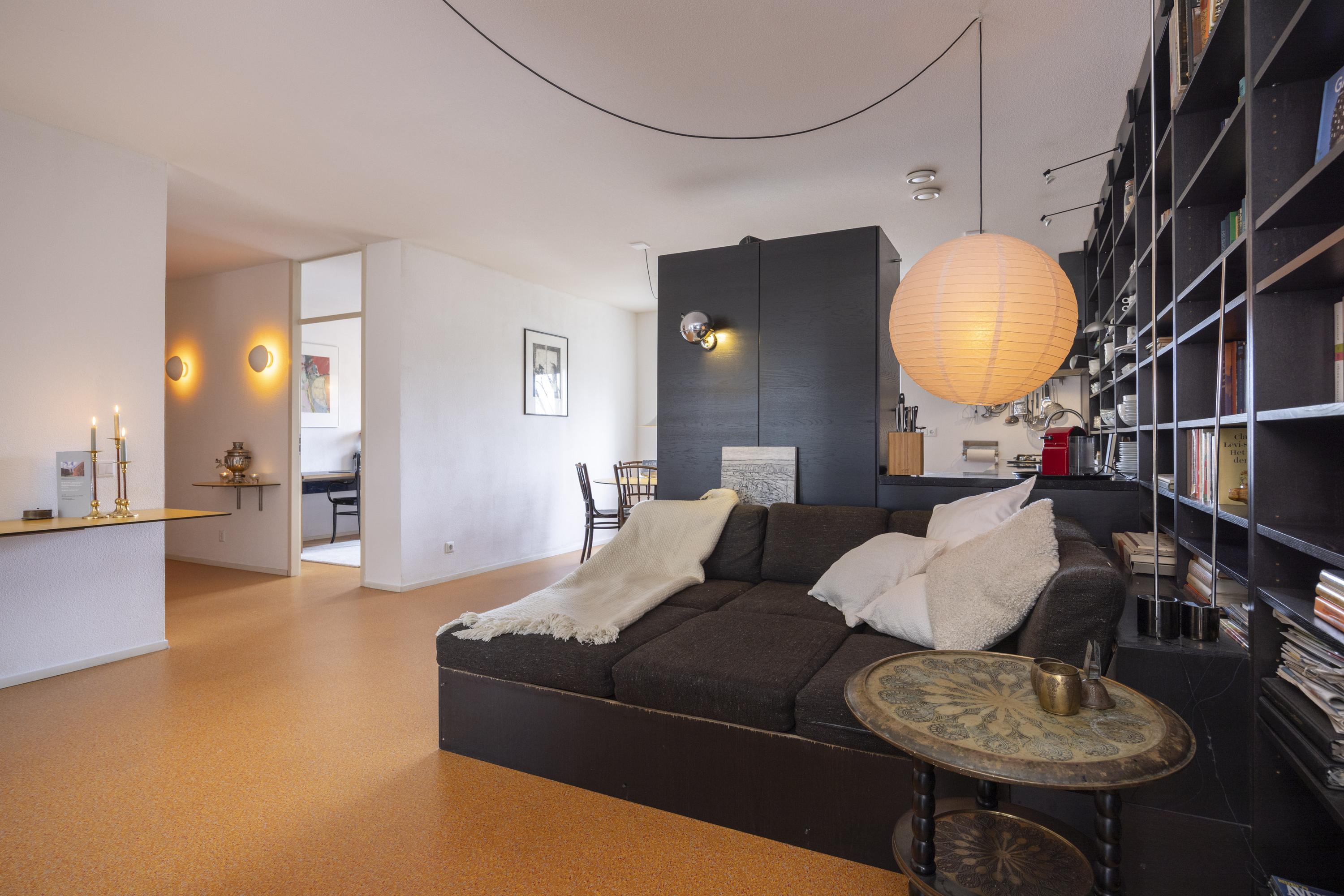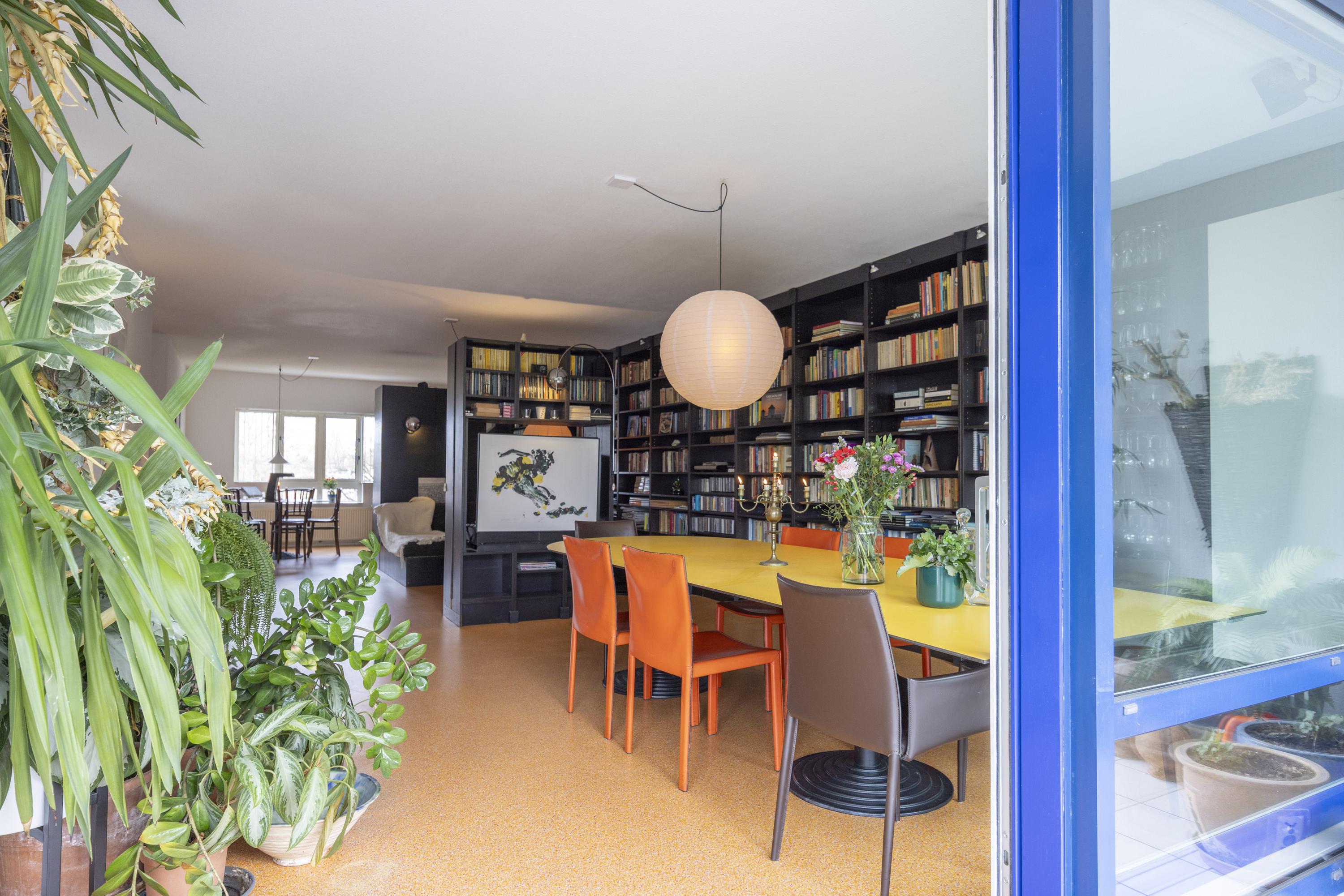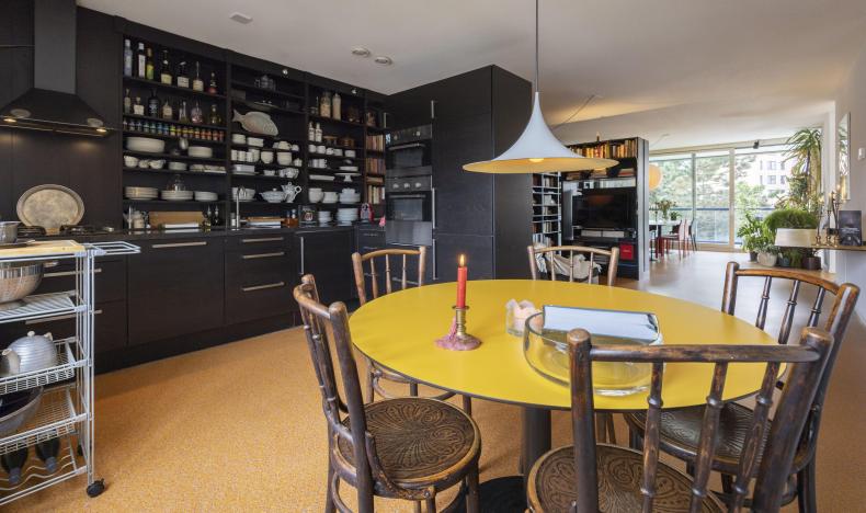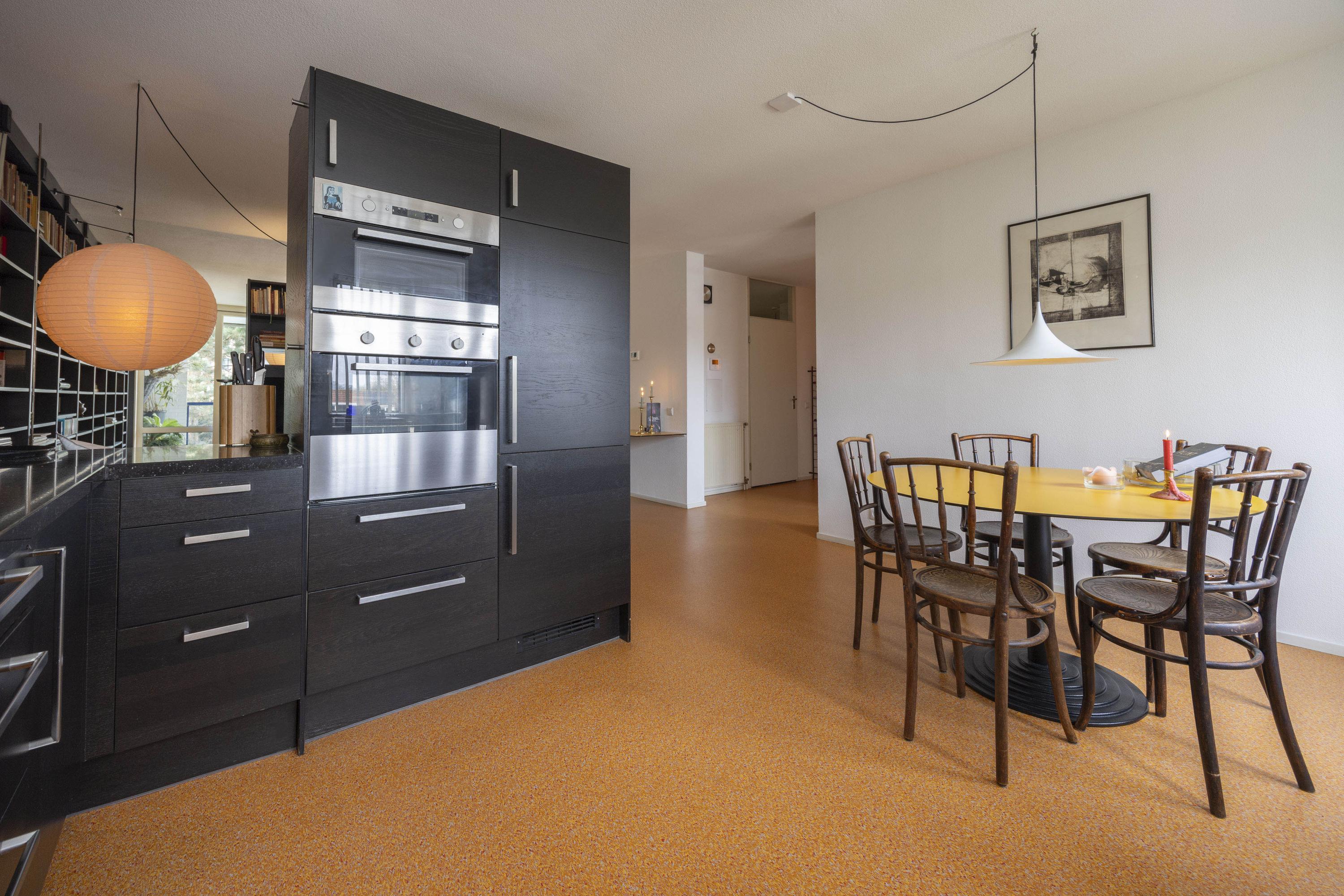 Binnenkomst in een ruime hal met toegang tot de toiletruimte (voorzien van zwevend toilet en fonteintje), een berging en diverse kamers. De woonkamer en open keuken vormen samen een royale leefruimte van circa 57 m². De keuken is uitgevoerd met een op maat gemaakte zwarte inrichting, voorzien van diverse inbouwapparatuur en een bijpassende kastenwand. Deze wand loopt door in de woonkamer, die tevens met een bijpassende roomdivider en bank is ingericht.