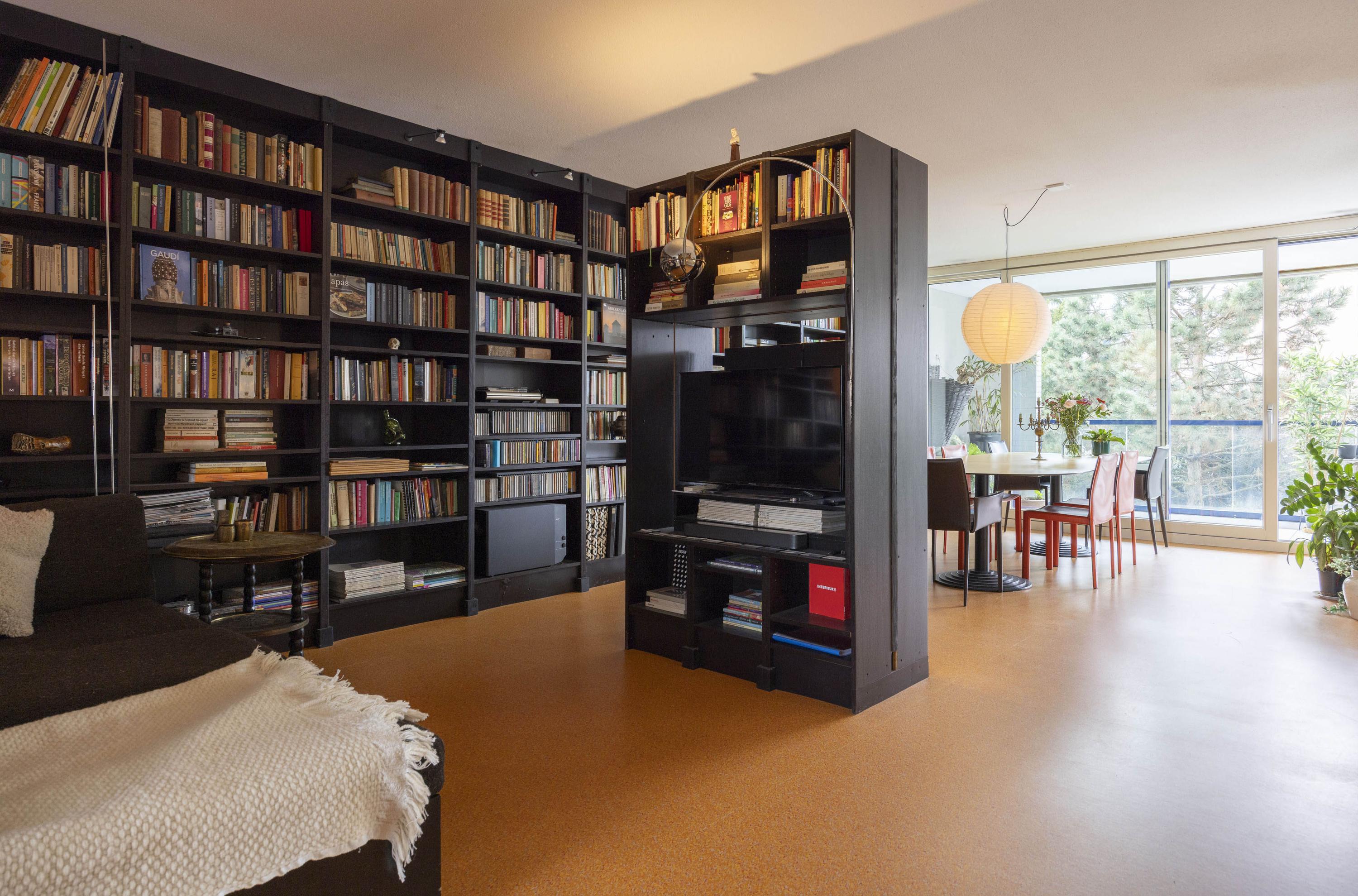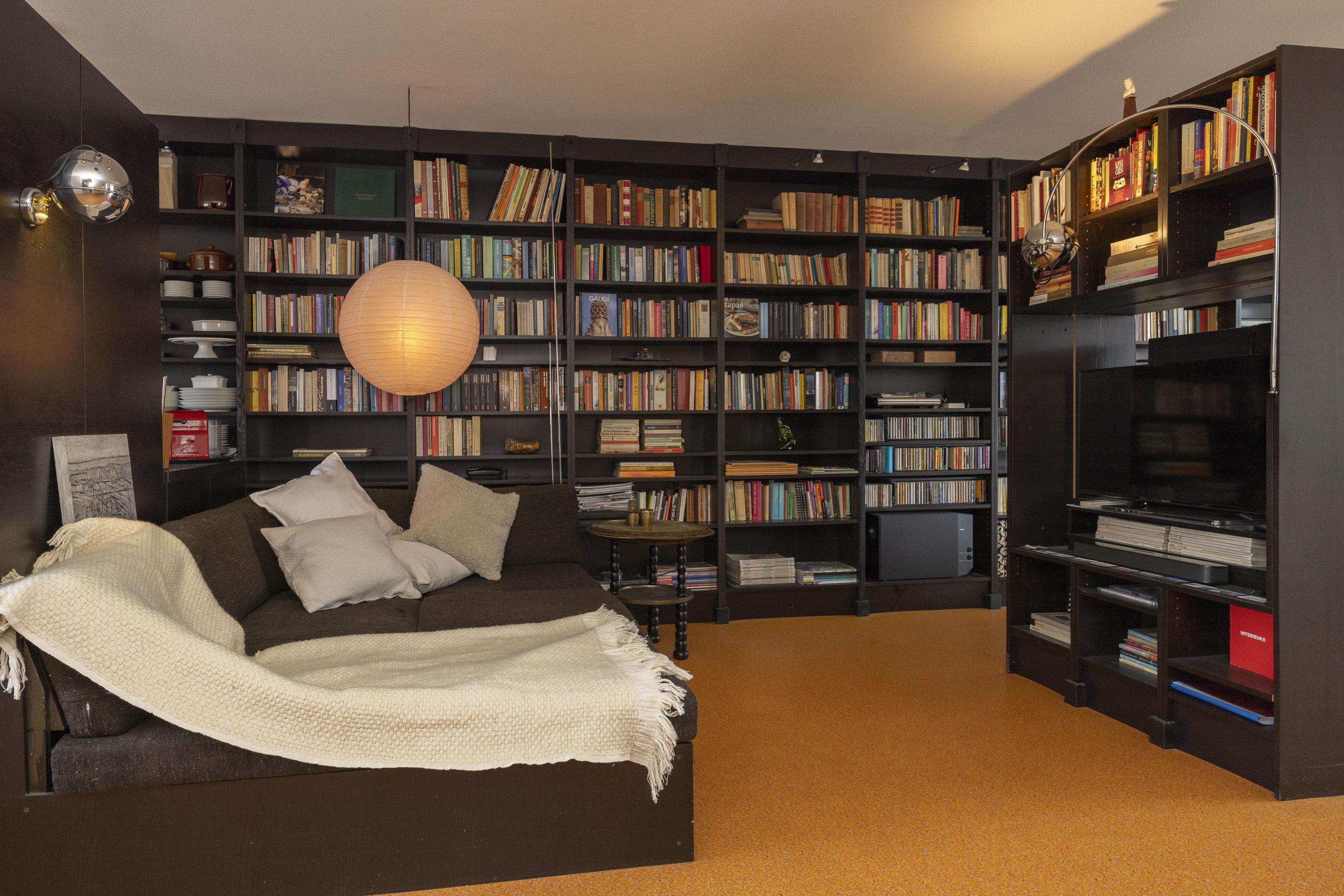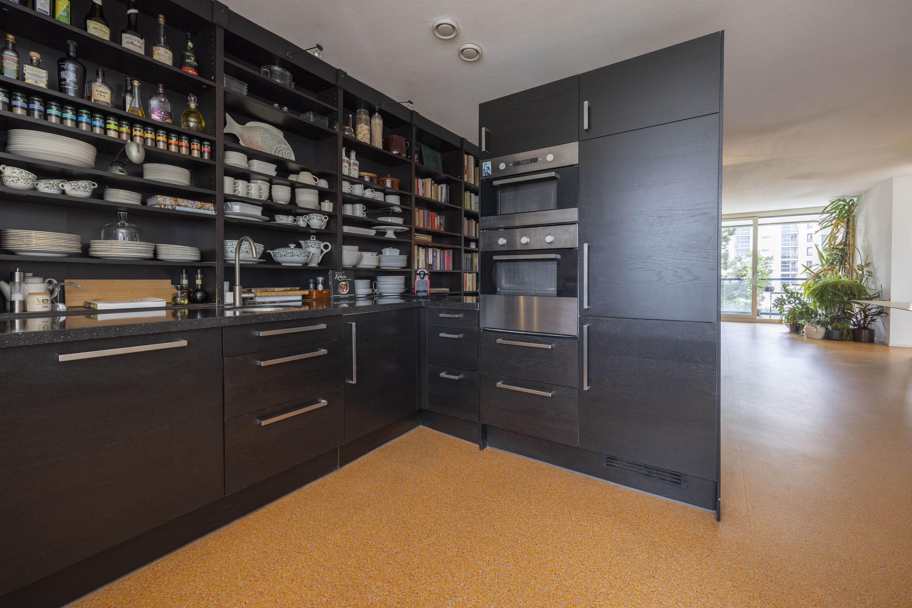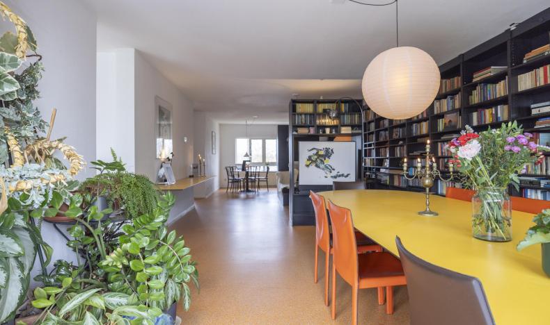 Binnenkomst in een ruime hal met toegang tot de toiletruimte (voorzien van zwevend toilet en fonteintje), een berging en diverse kamers. De woonkamer en open keuken vormen samen een royale leefruimte van circa 57 m². De keuken is uitgevoerd met een op maat gemaakte zwarte inrichting, voorzien van diverse inbouwapparatuur en een bijpassende kastenwand. Deze wand loopt door in de woonkamer, die tevens met een bijpassende roomdivider en bank is ingericht.