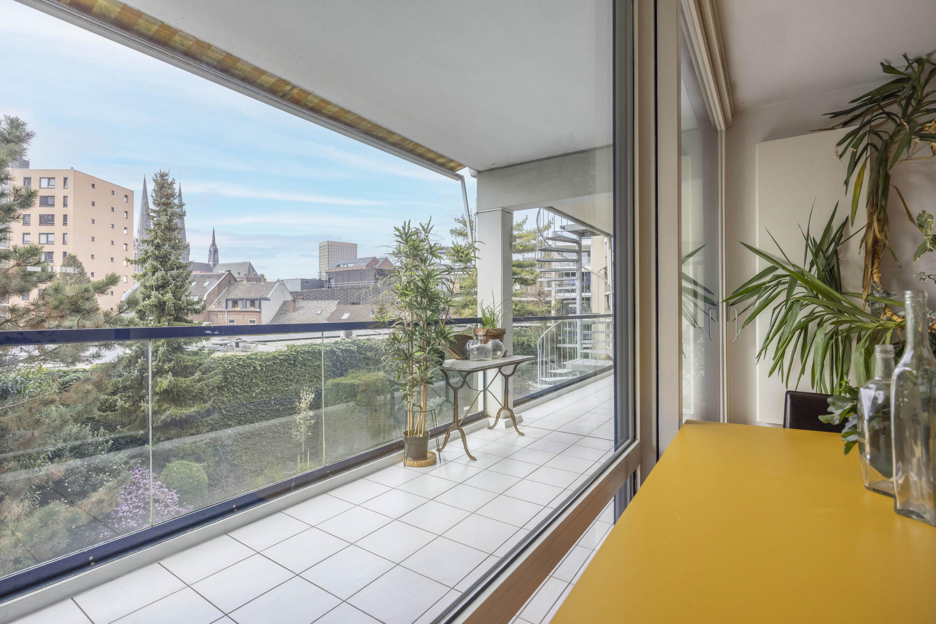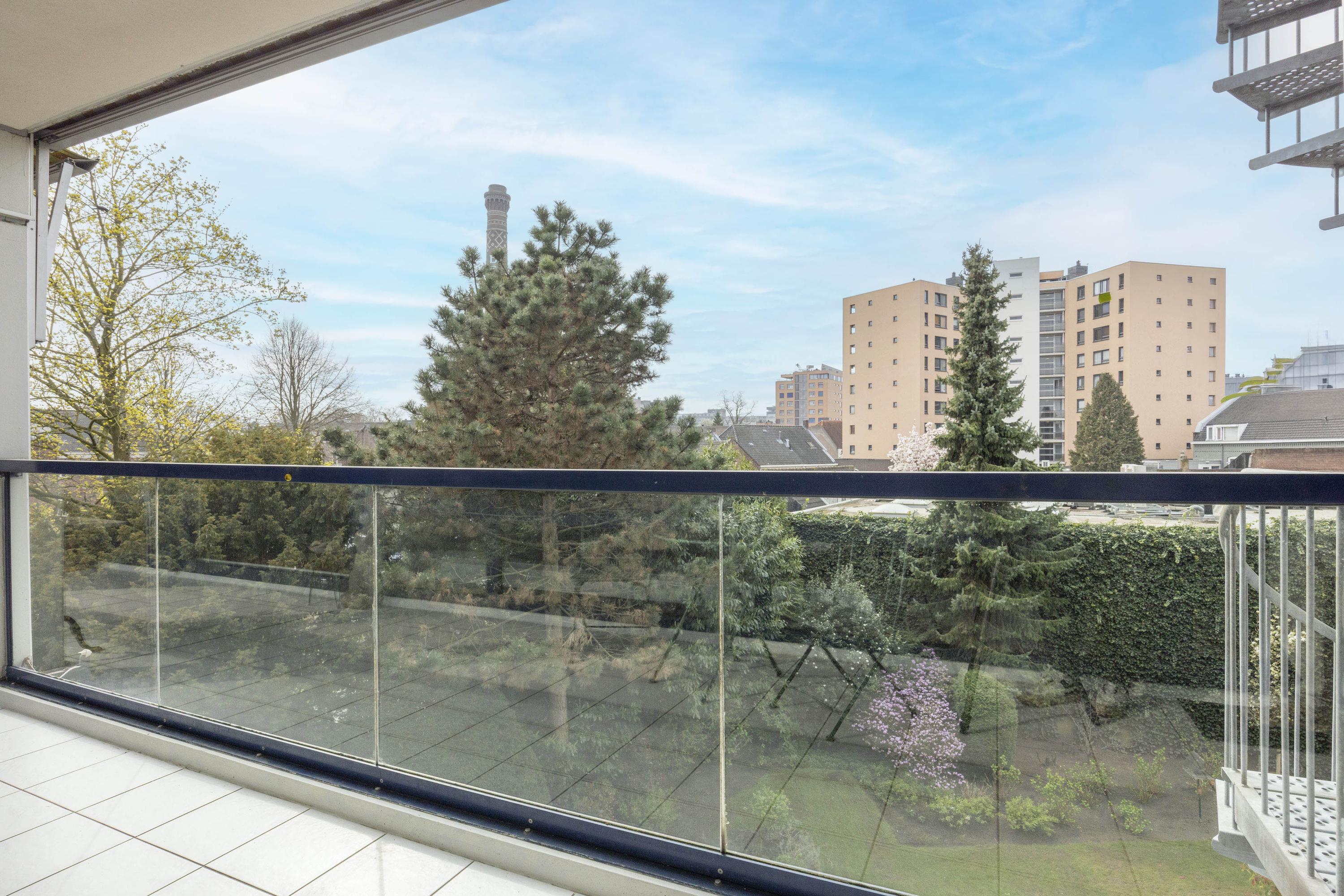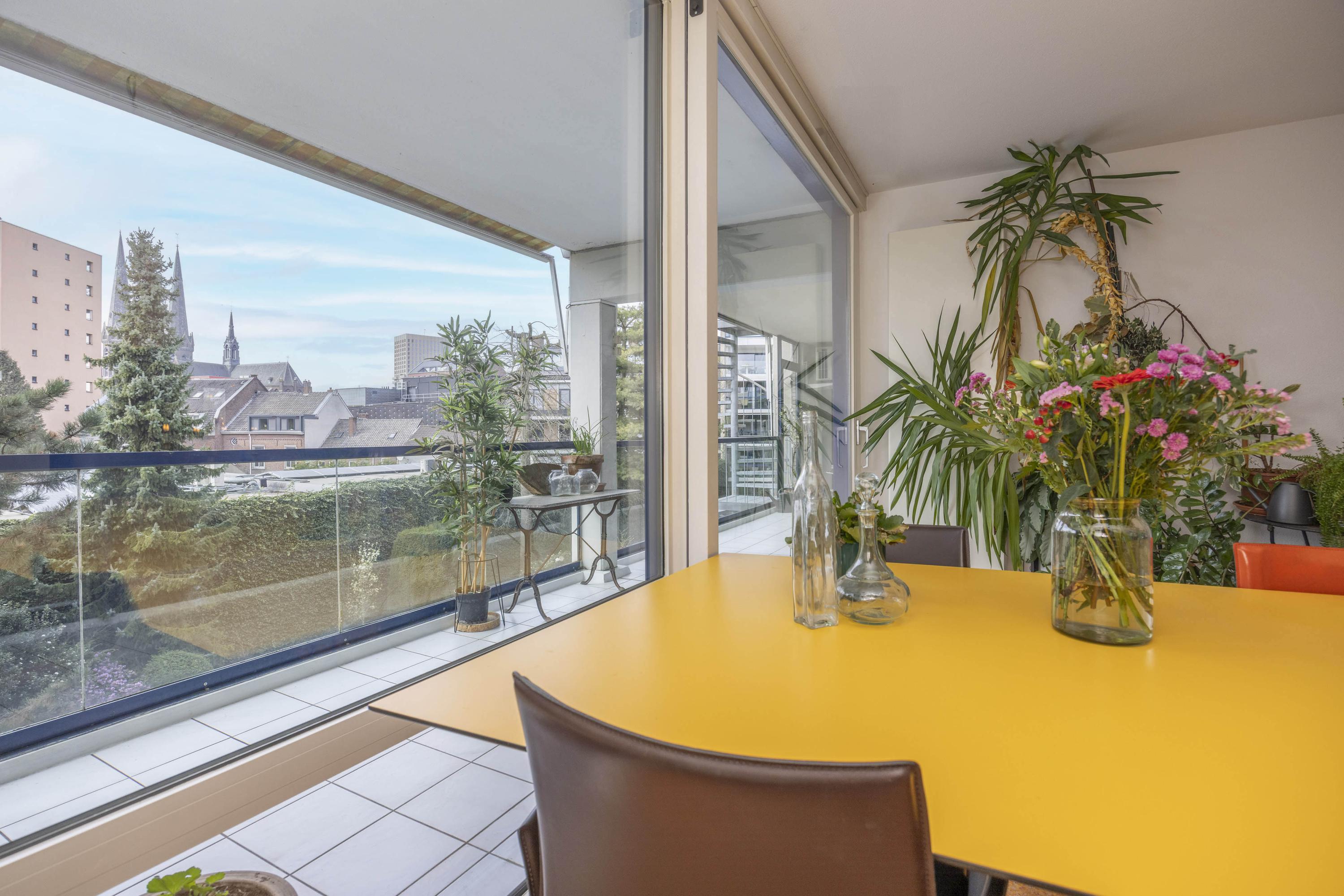 De woonkamer is licht en ruim, met een schuifpui naar het balkon, dat op het zuidwesten is gelegen. Vanaf hier heeft u een prettig uitzicht op de binnentuin en de stad, met onder andere zicht op de Heuvelse Kerk.