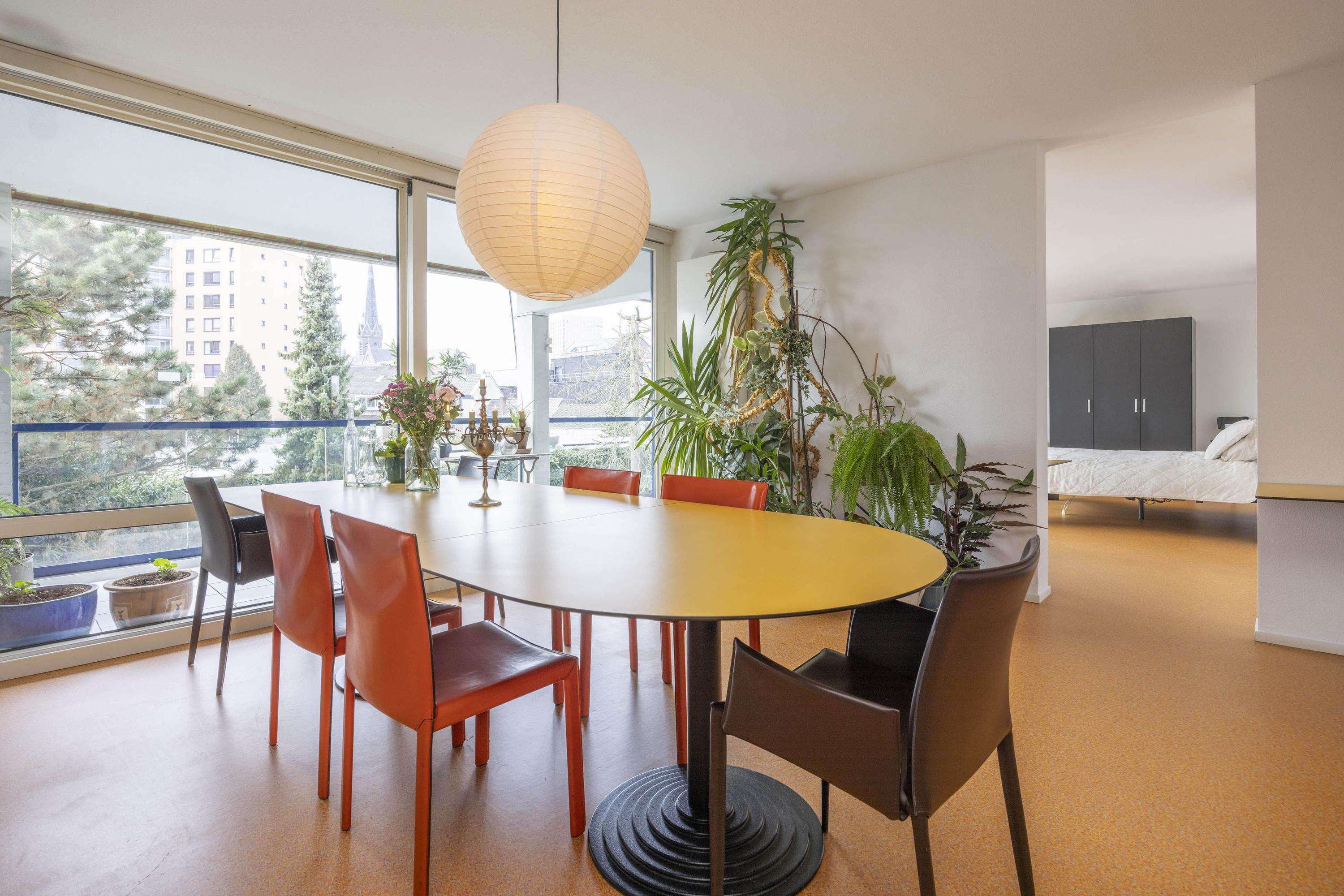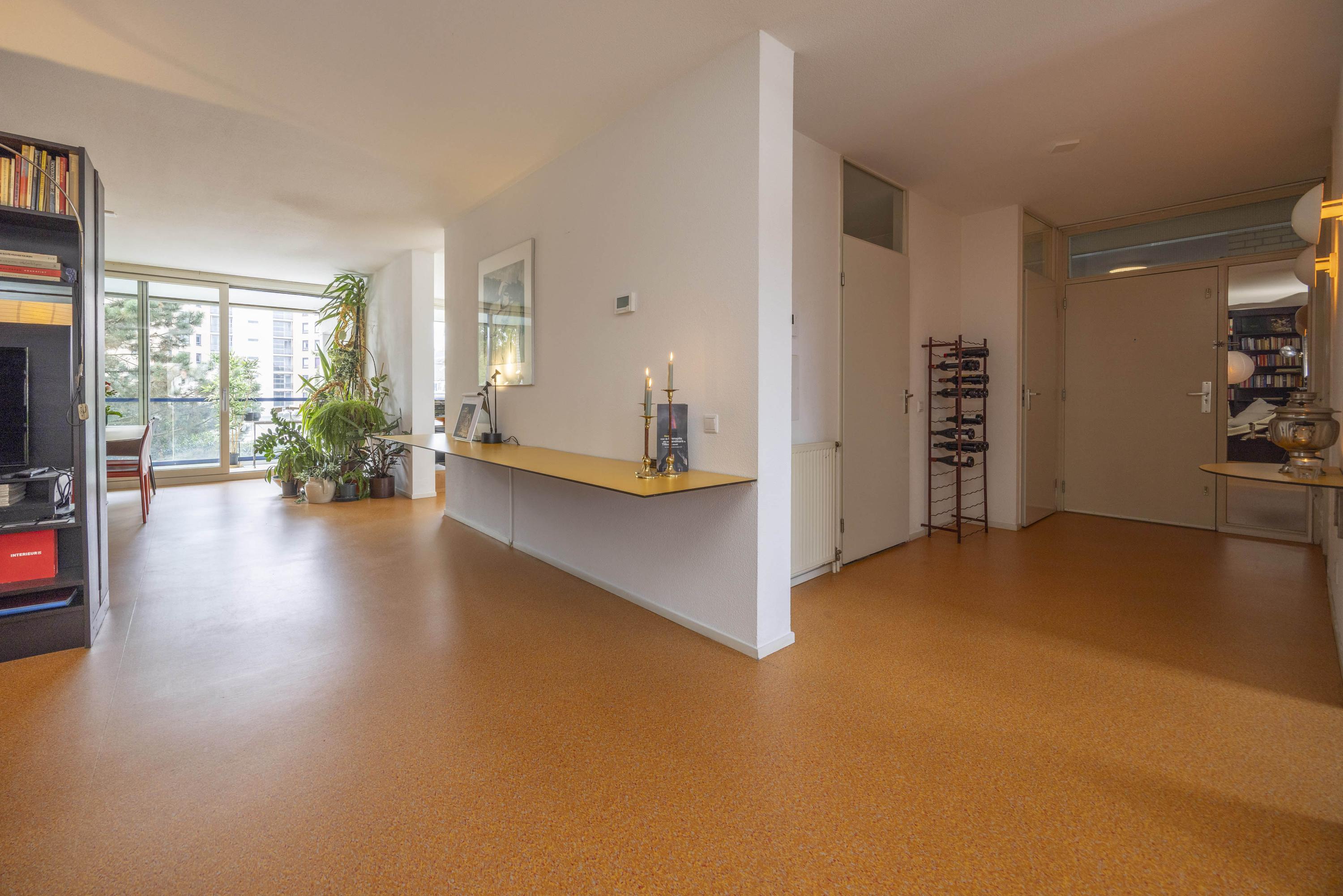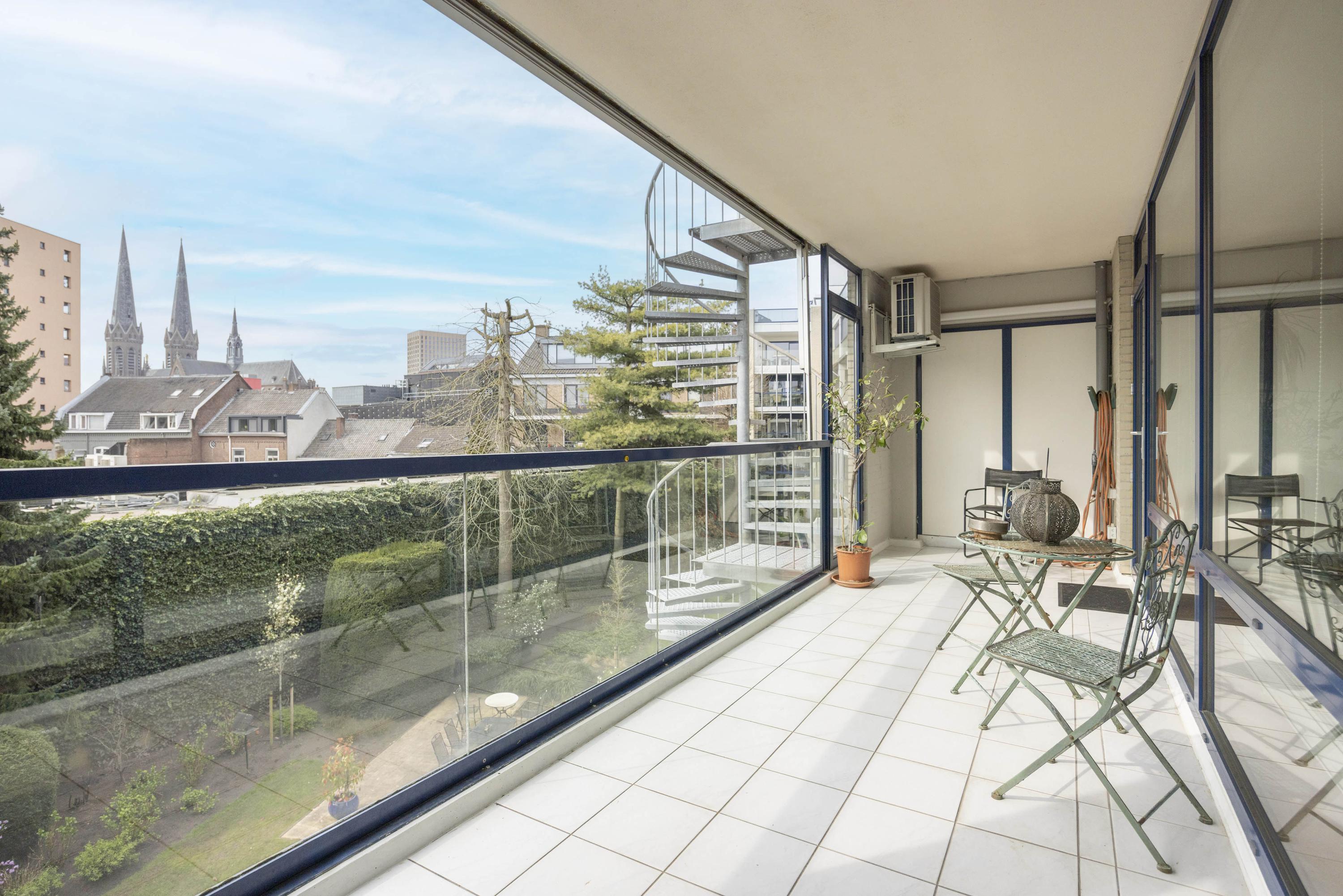 De woonkamer is licht en ruim, met een schuifpui naar het balkon, dat op het zuidwesten is gelegen. Vanaf hier heeft u een prettig uitzicht op de binnentuin en de stad, met onder andere zicht op de Heuvelse Kerk.