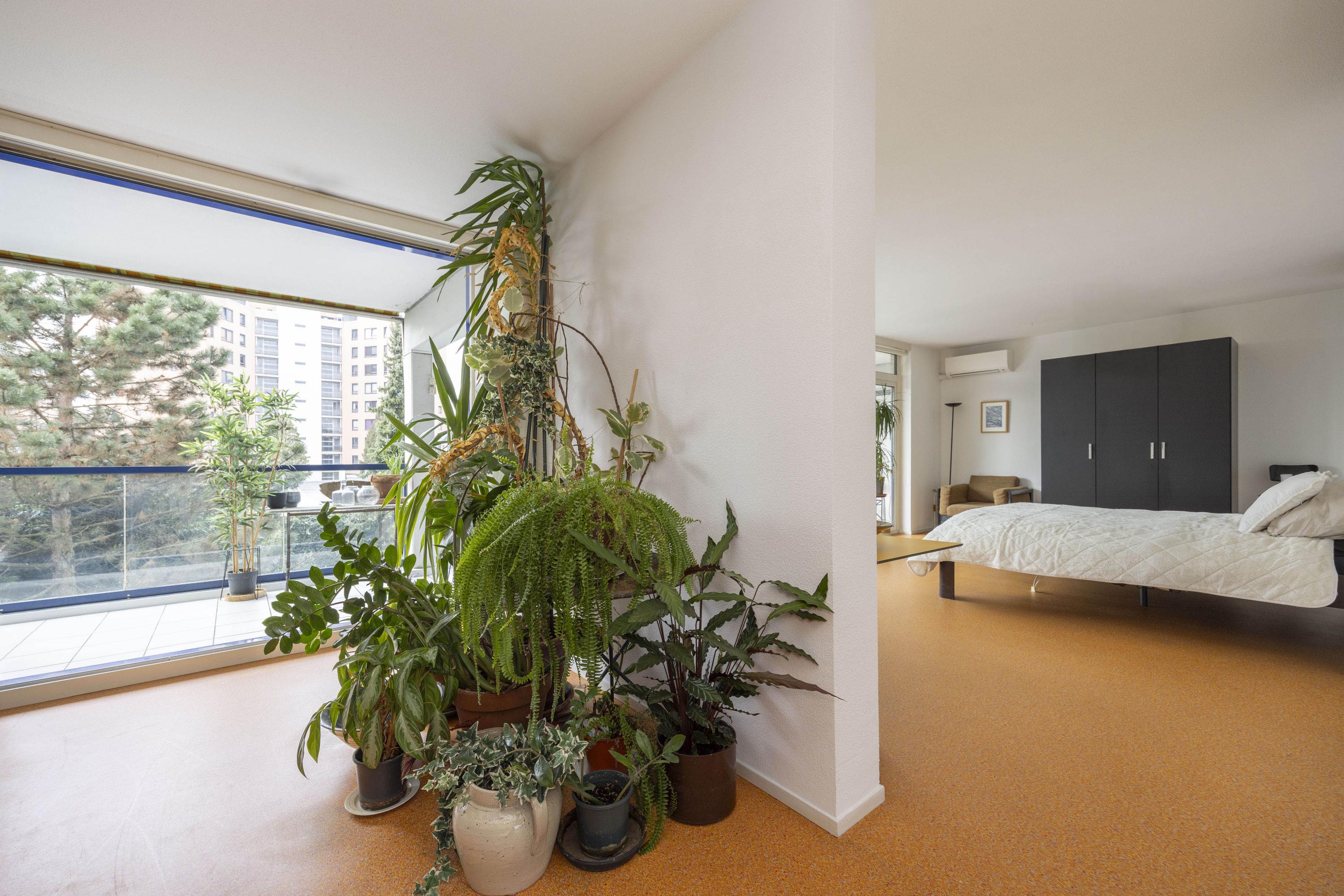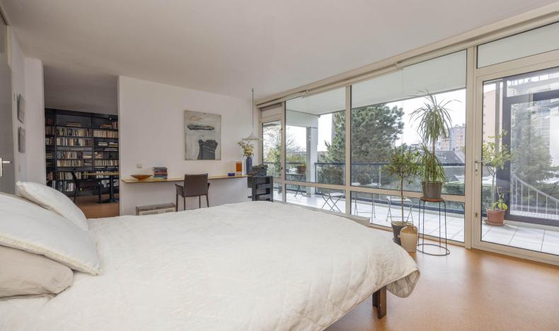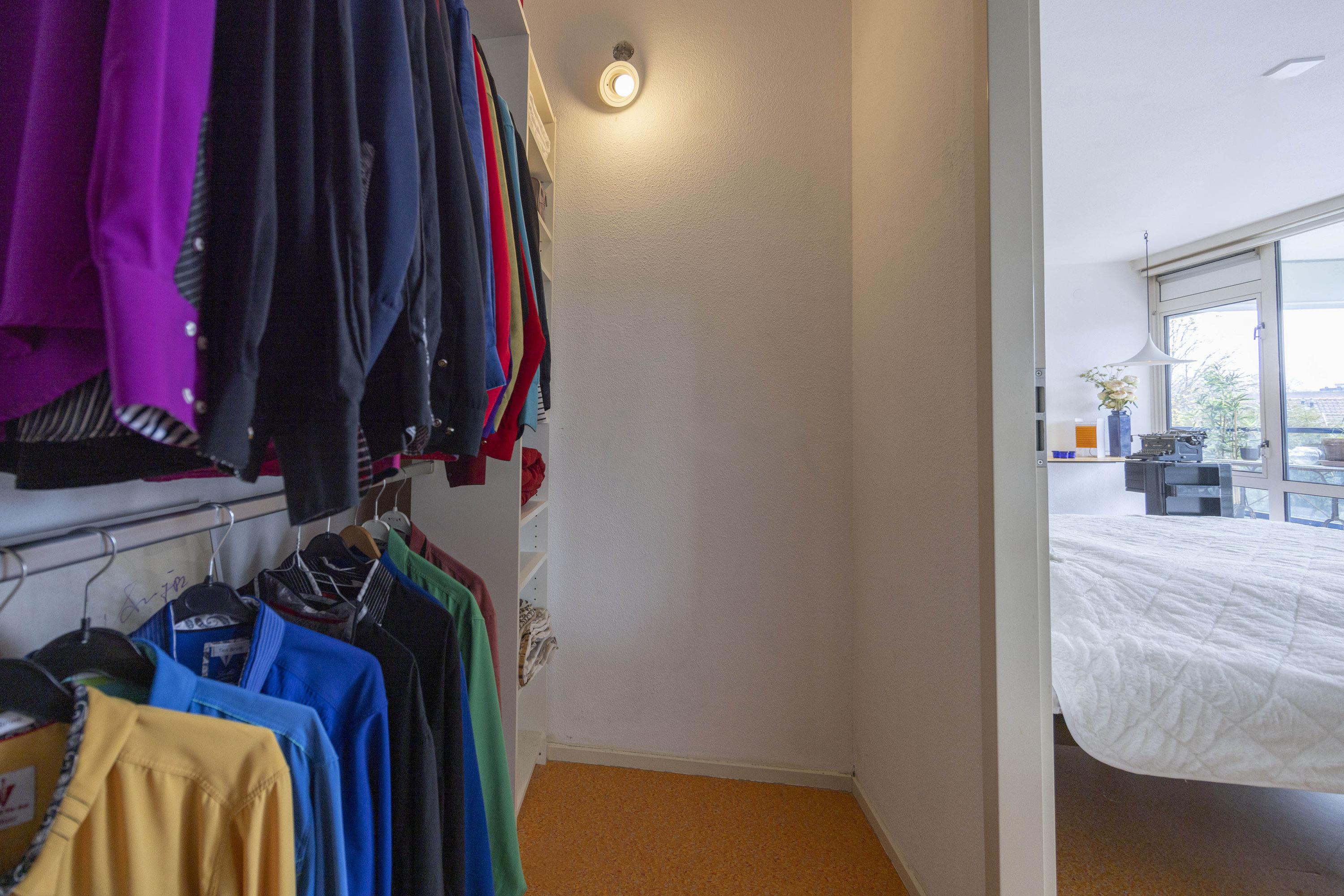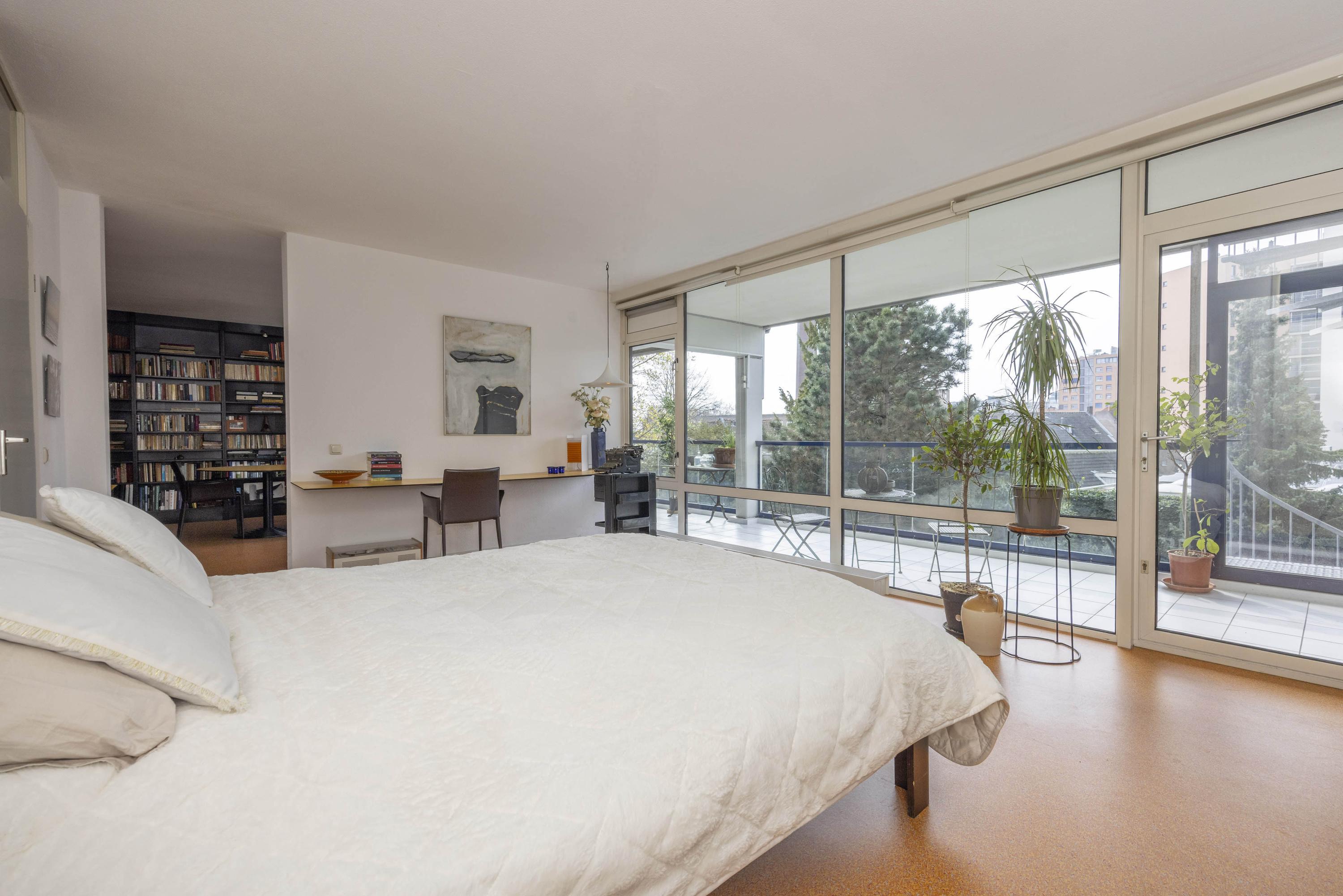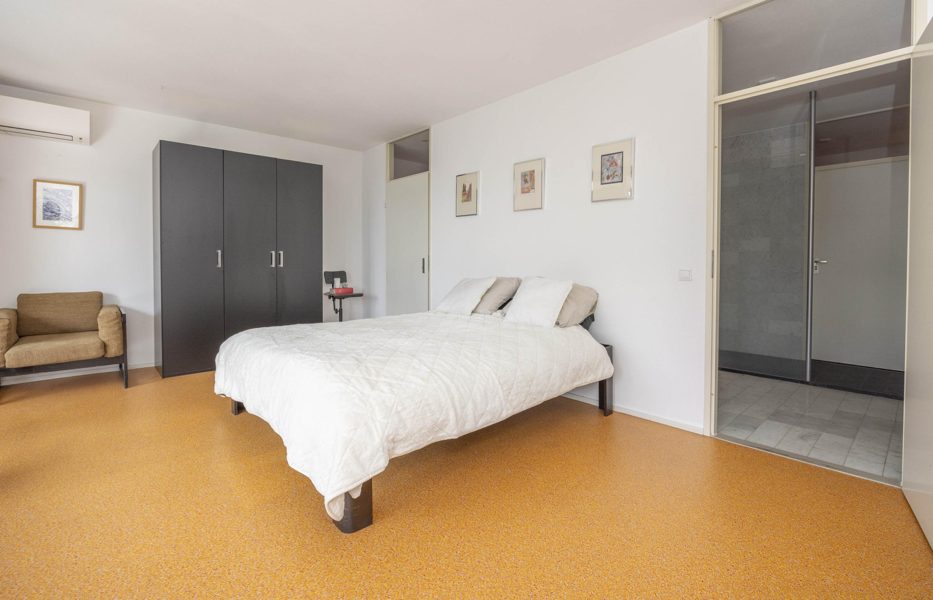 Het appartement beschikt over twee slaapkamers. De hoofdslaapkamer (ca. 23 m²) ligt aan de tuinzijde en heeft via een deur toegang tot het balkon. Deze kamer is voorzien van een inloopkast en airconditioning. Zowel vanuit de slaapkamer als de hal is de ruime badkamer bereikbaar, die is uitgerust met een ligbad, inloopdouche en wastafelmeubel. In een kast bevinden zich de aansluitingen voor de wasmachine.