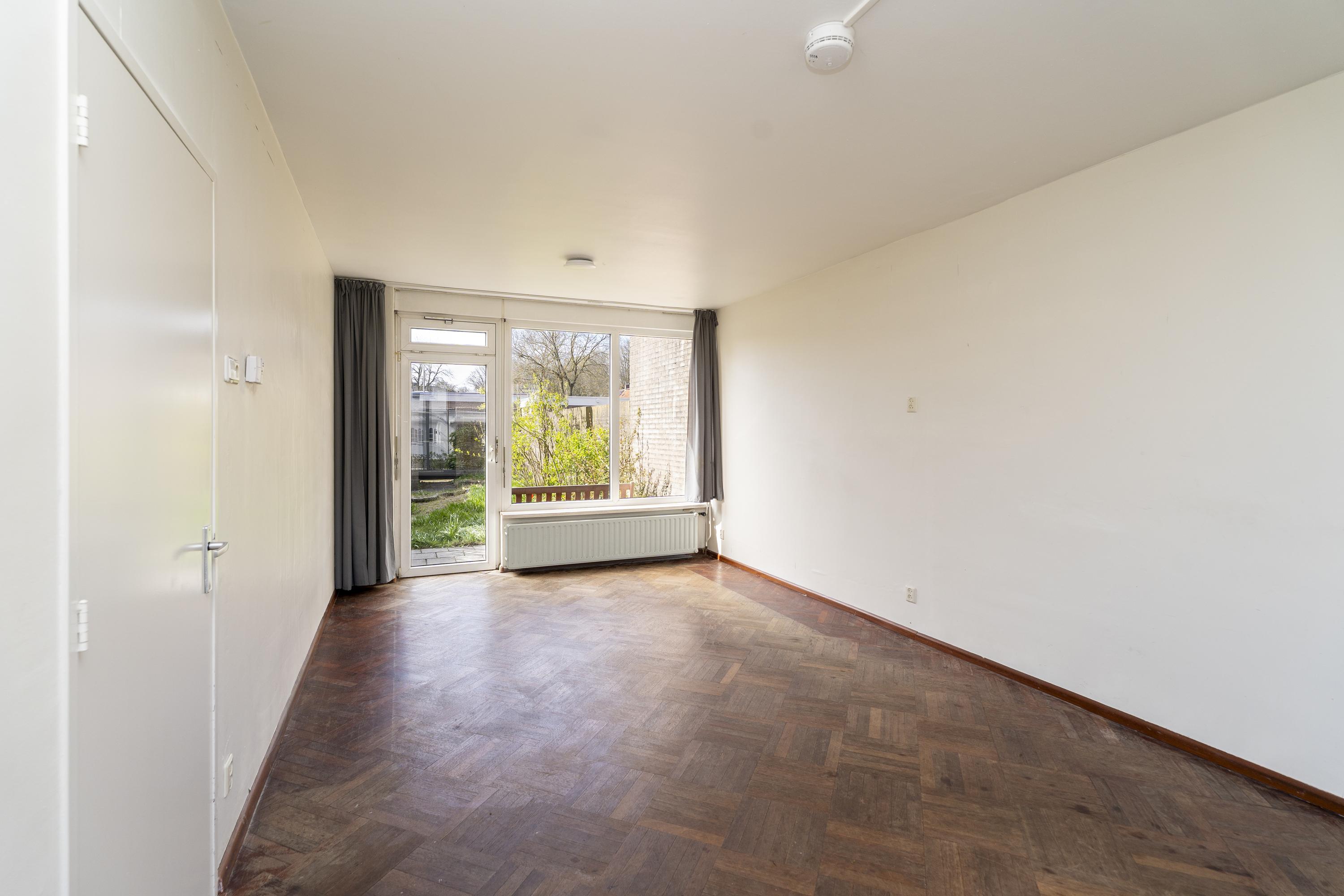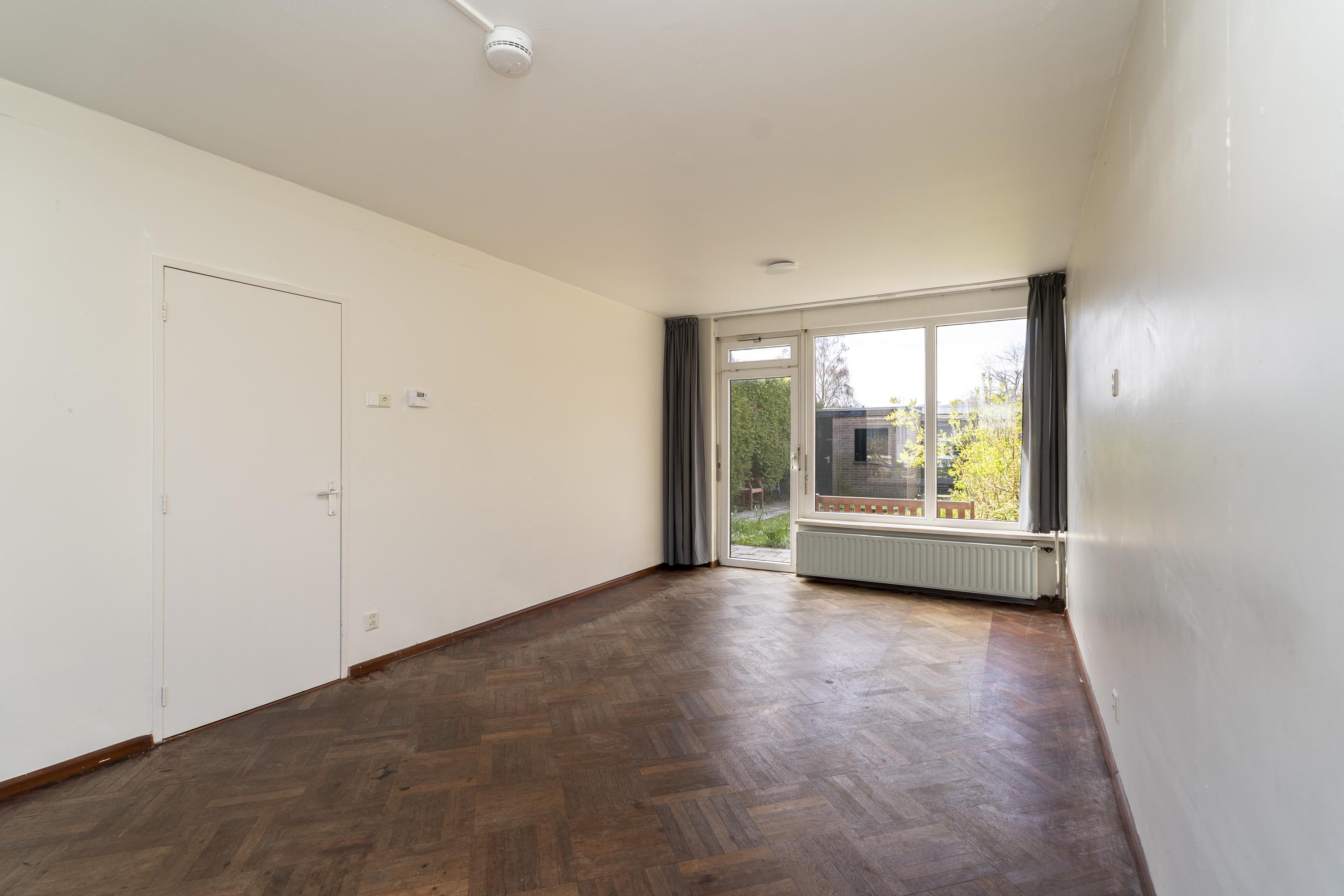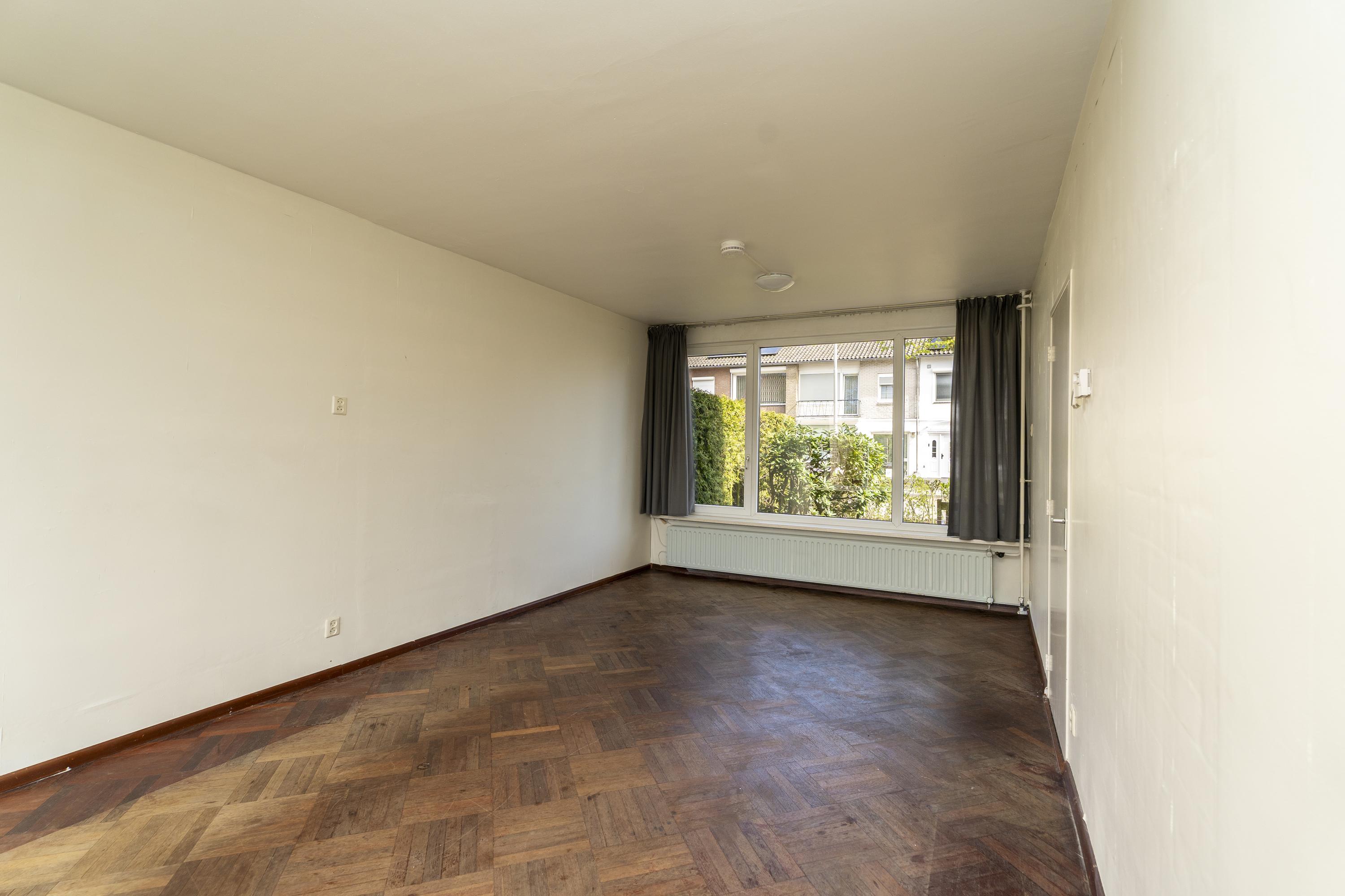 De doorzon woonkamer is ruim en licht en voorzien van een fraaie parketvloer.