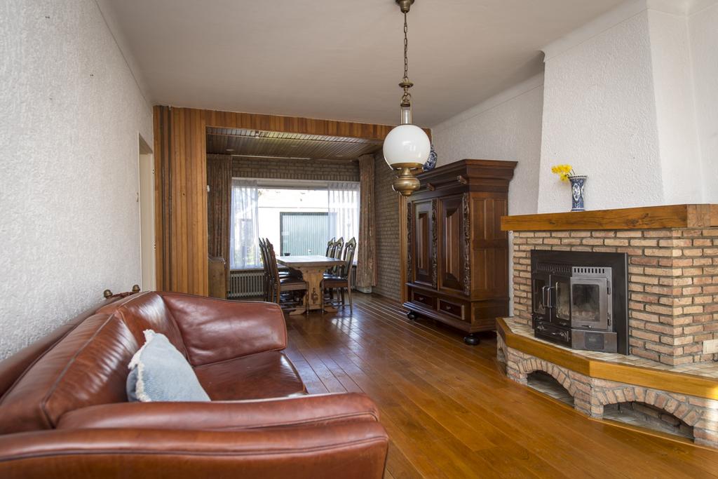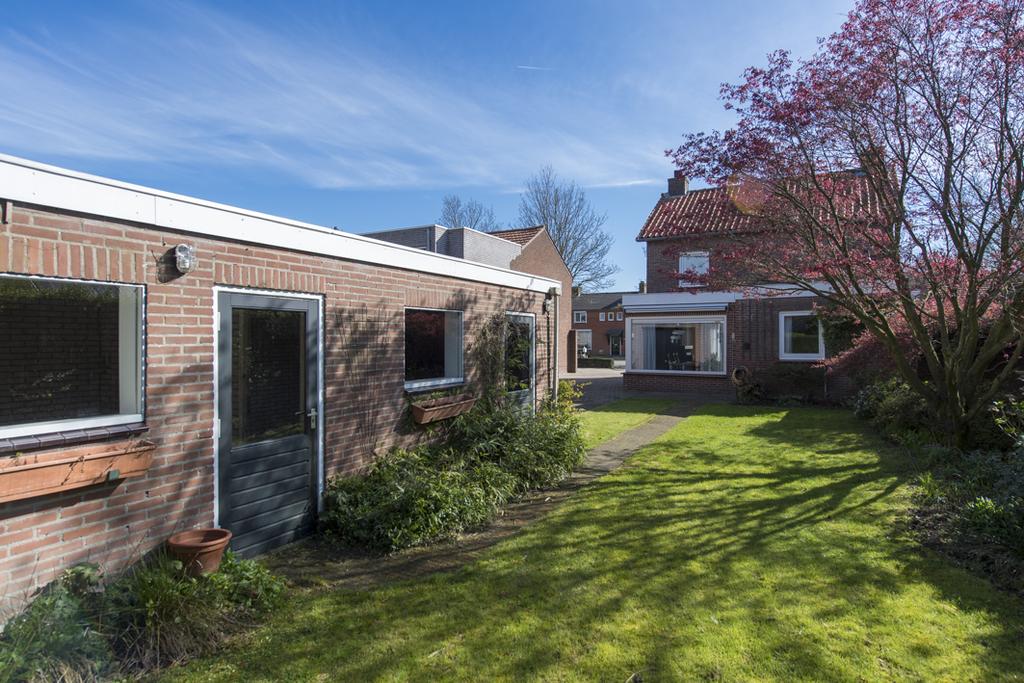 Hal met meterkast, trapopgang en toegang naar de woonkamer en de woonkeuken. De woonkamer is aan de achterzijde uitgebouwd en voorzien van een schouw met houtkachel (met ventilator) en origineel glas-in-lood raam. De ruime woonkeuken –met uitzicht op de zijtuin- is ingericht met een L-vormig keukenblok v.v. spoelbak, 4-pits gaskookplaat, afzuigkap, oven, vaatwasser en koelkast. Verder is er een kleine kelder onder de trapopgang. De bijkeuken is een fijne, praktische ruimte met aan-/afvoer wasmachine, opstelling c.v.-combiketel en toegang naar de geheel betegelde toiletruime met een zwevend toilet. Alsmede toegang naar de geheel betegelde badkamer met douche en wastafel. De achtertuin is middels een deur in de bijkeuken te bereiken.