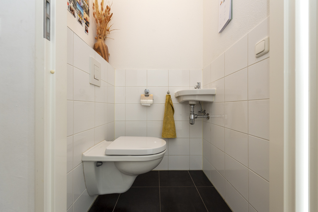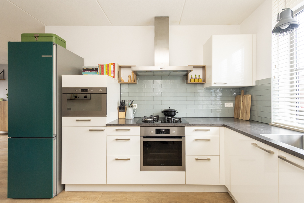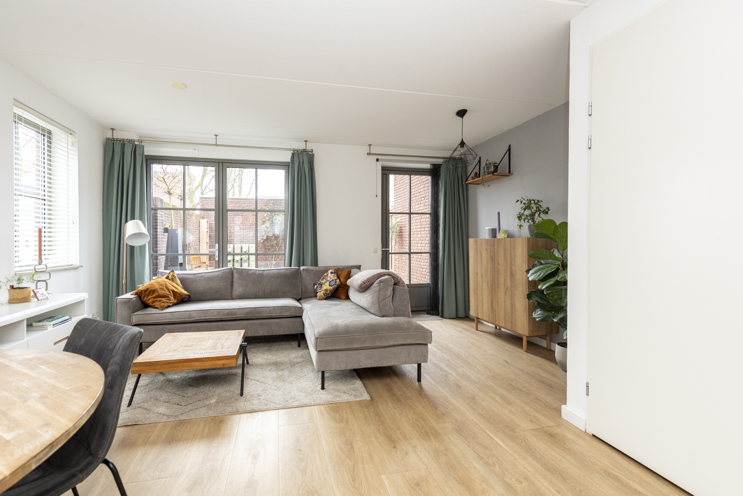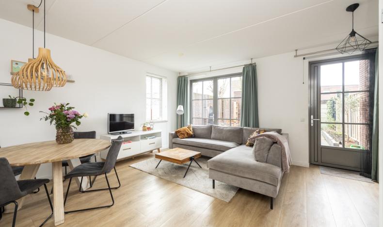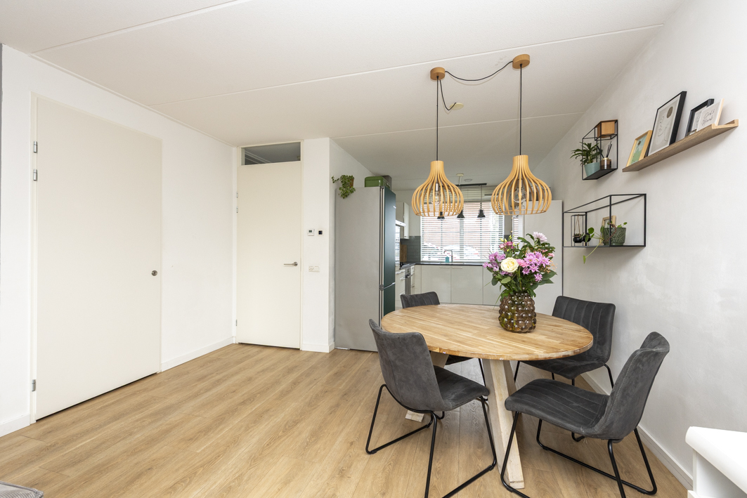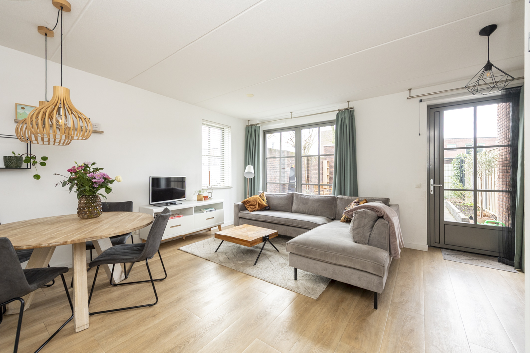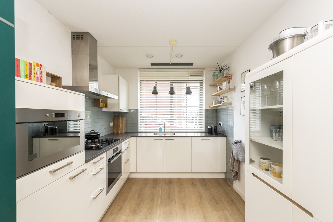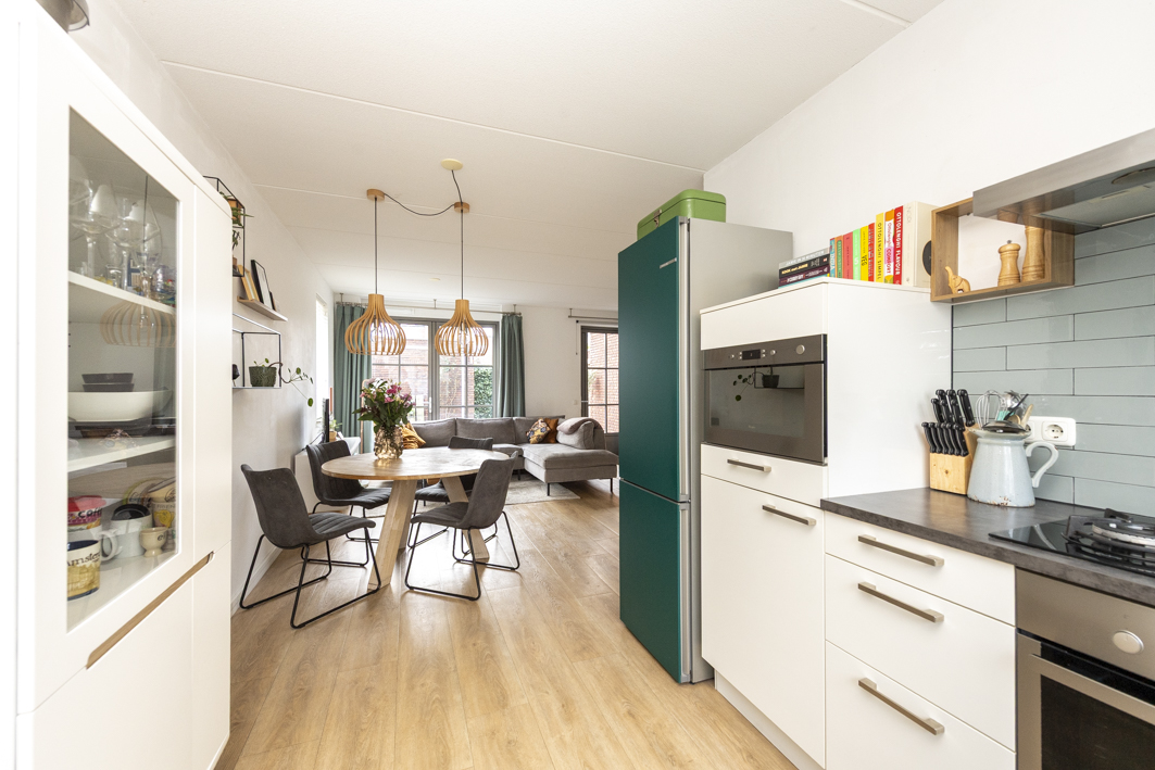 De moderne, lichte keuken is aan de straatzijde gelegen en voorzien van een gaskookplaat, oven, vaatwasser en Quooker. De woonkamer biedt volop ruimte voor zowel een gezellige zithoek als een royale eettafel.