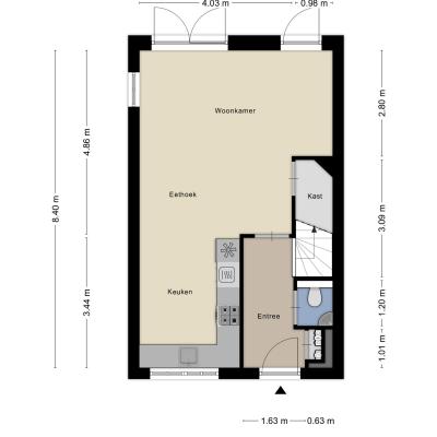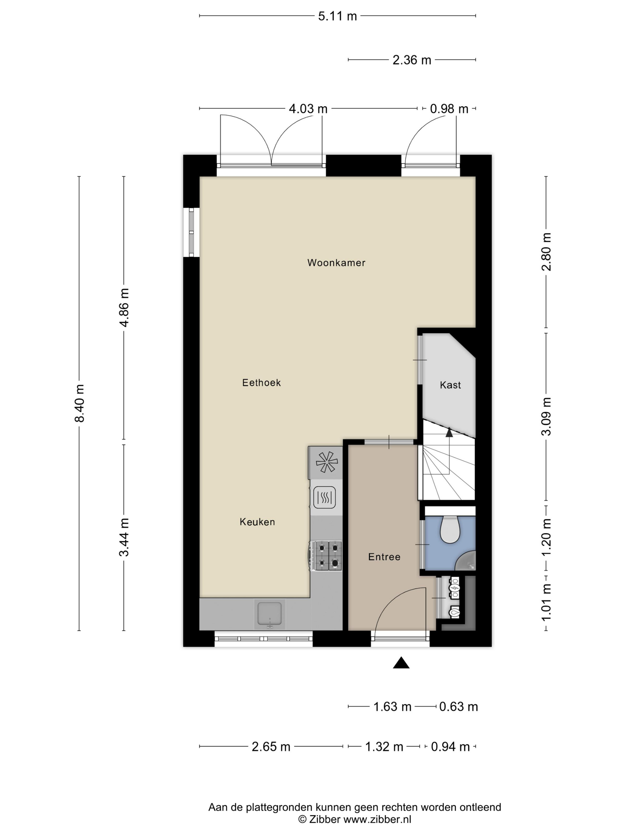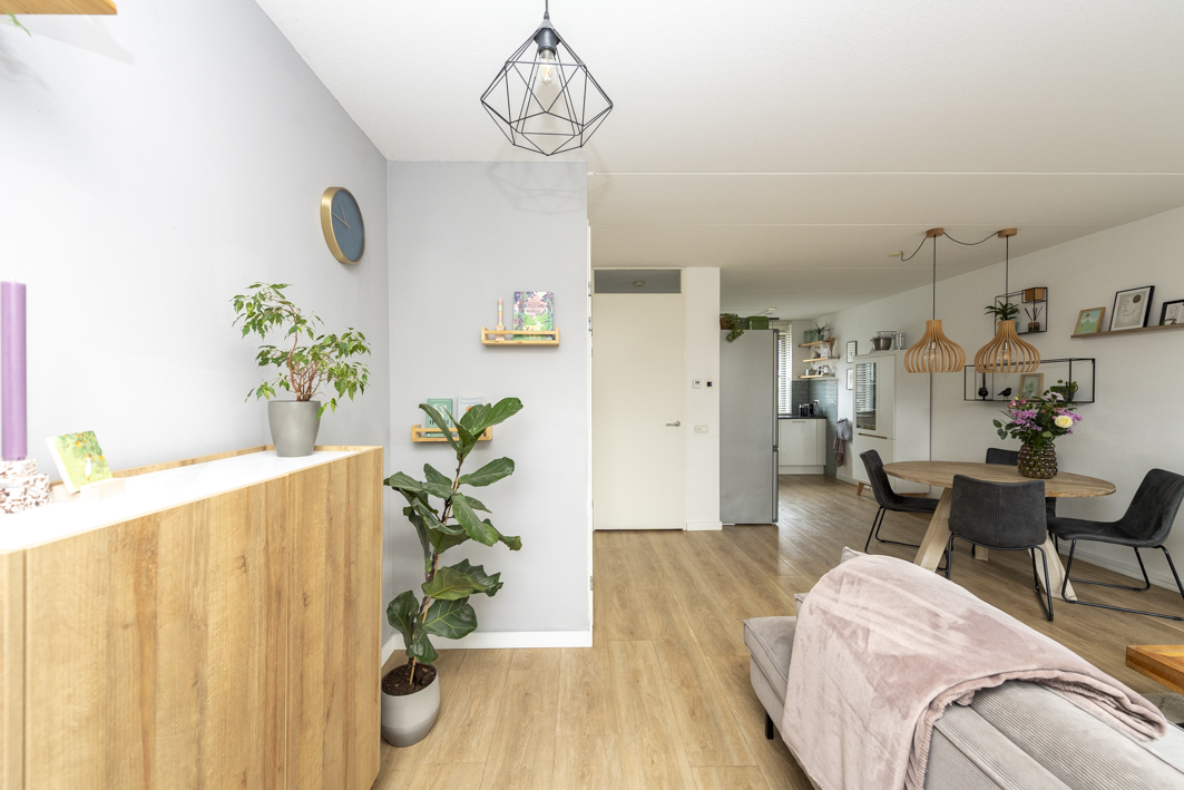 Via de ruime entree/hal met toilet en trapopgang betreed je de lichte L-vormige woonkamer met open keuken.