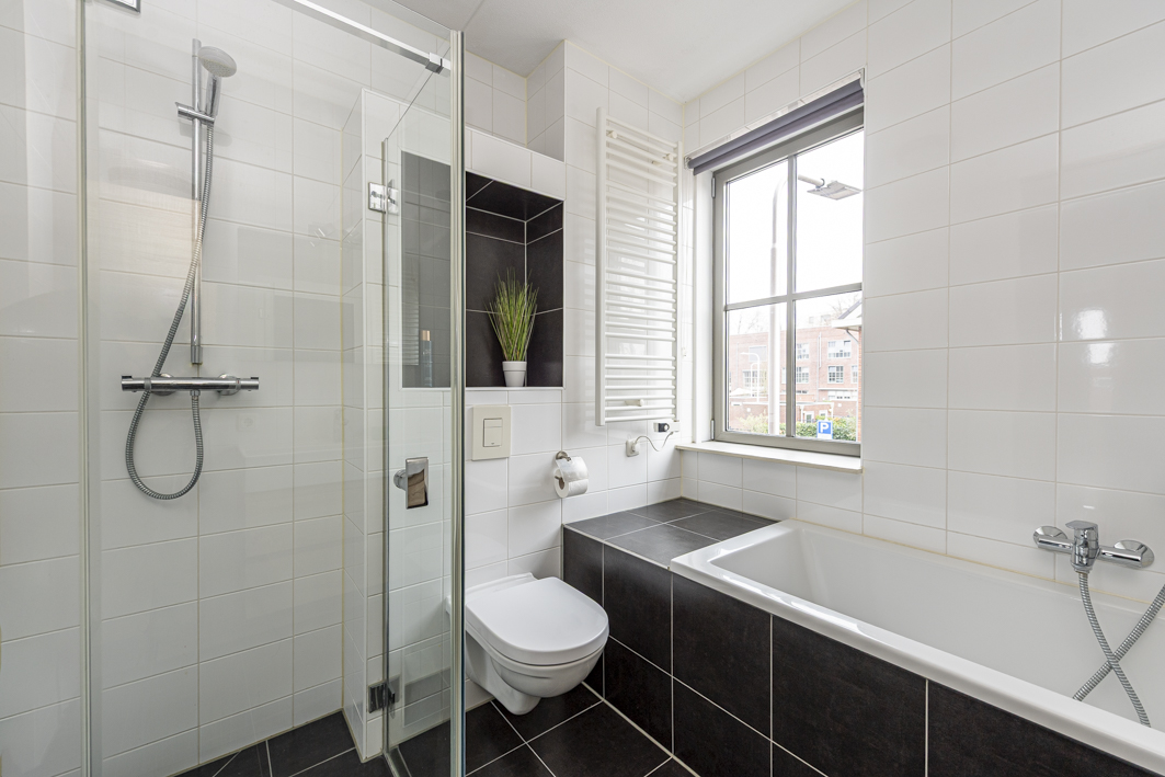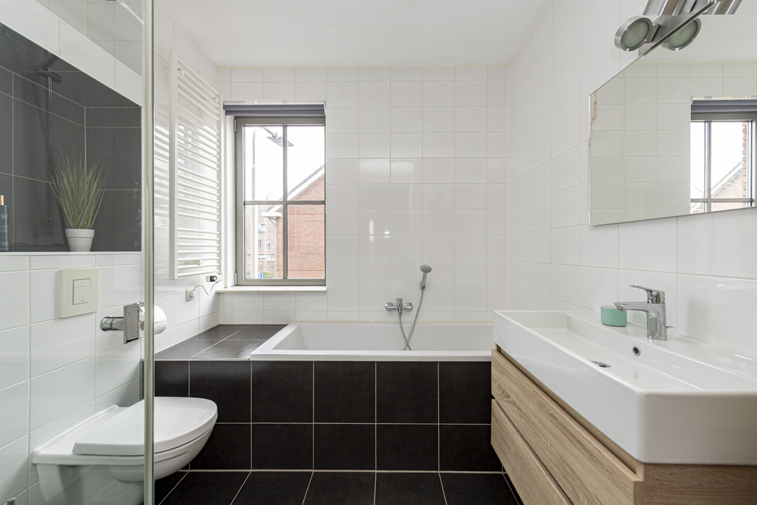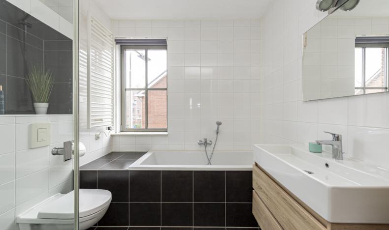 De badkamer is hoogwaardig afgewerkt en beschikt over een ligbad, inloopdouche, wandcloset en een wastafelmeubel met dubbele wastafel.