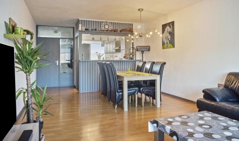 Het balkon grenst aan de woonkamer en is op het westen georiënteerd. Aan de voorzijde staat de woonkamer in een open verbinding met de keuken. De bar vormt een gezellige afscheiding tussen het kookgedeelte en het leefgedeelte.