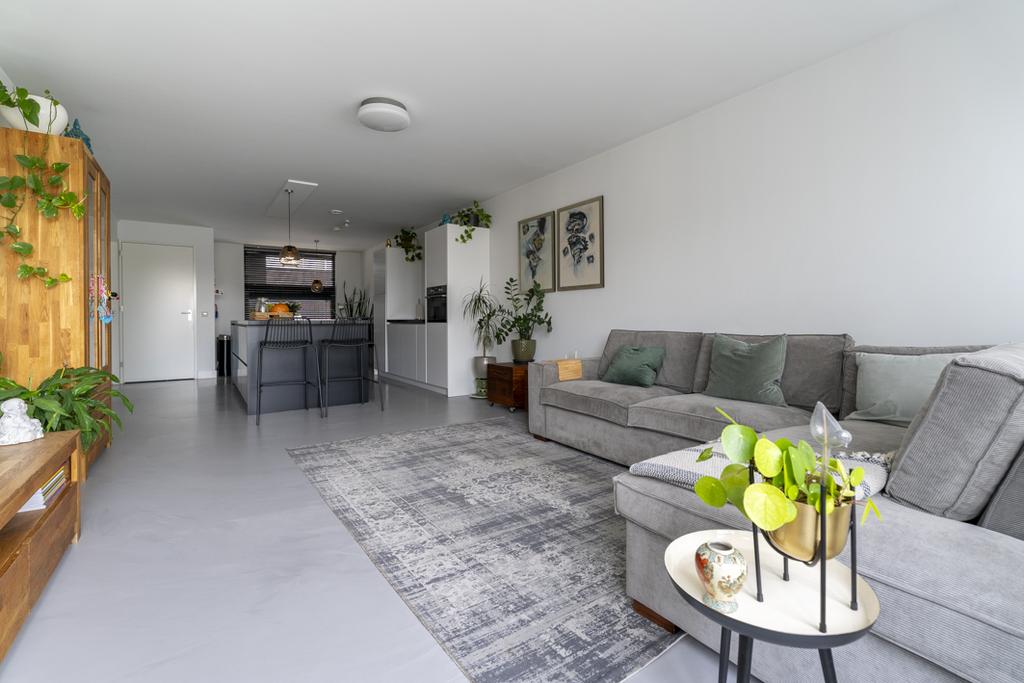 De keuken is het middelpunt van de fijne leefruimte, u heeft zowel contact met het eetgedeelte als met de zithoek. De zithoek is aan de achterzijde gesitueerd en is voorzien van diverse openslaande deuren welke zijn voorzien van elektrische screens met Franse balkons, waardoor er sprake is van veel lichtinval. Het appartement is afgewerkt met een moderne doorlopende betonlook kunststof gietvloer.