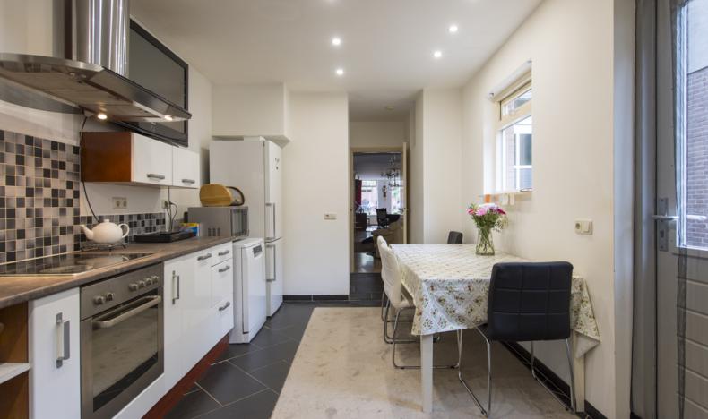 Keuken is gelegen achter de woonkamer en voorzien van een rechte opstelling met apparatuur zoals een oven, kookplaat en afzuigkap. Er is veel kastruimte aanwezig en de mogelijkheid tot het plaatsen van een keukentafel. In de keuken is een ruime bergkast aanwezig met daarin de aansluiting voor de wasapparatuur.