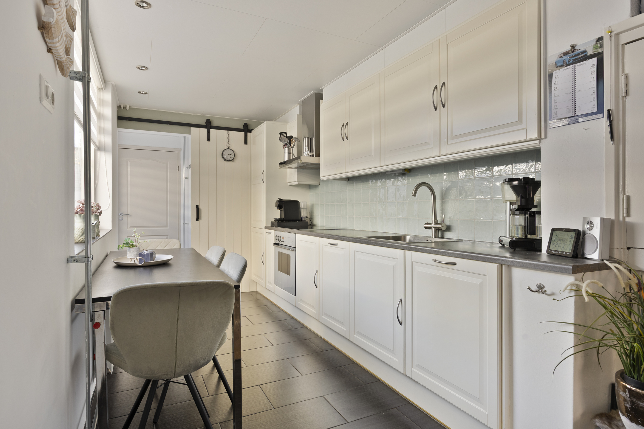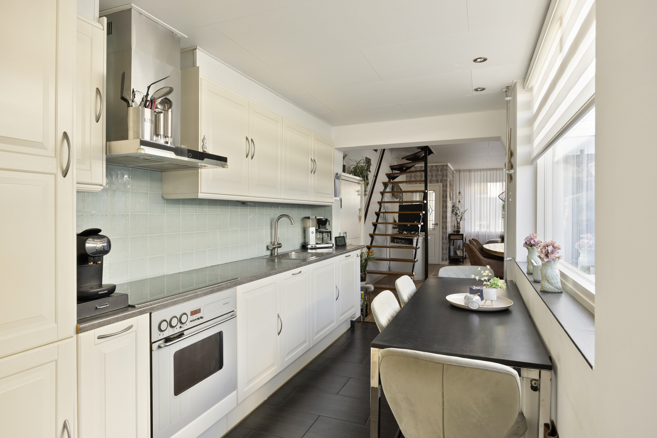 Aan de achterzijde bevindt zich de keuken in rechte opstelling, uitgerust met een vaatwasser, inductiekookplaat, afzuigkap, koel-vriescombinatie en Quooker. Achter de keuken ligt de bijkeuken met toegang tot zowel de badkamer als de tuin.