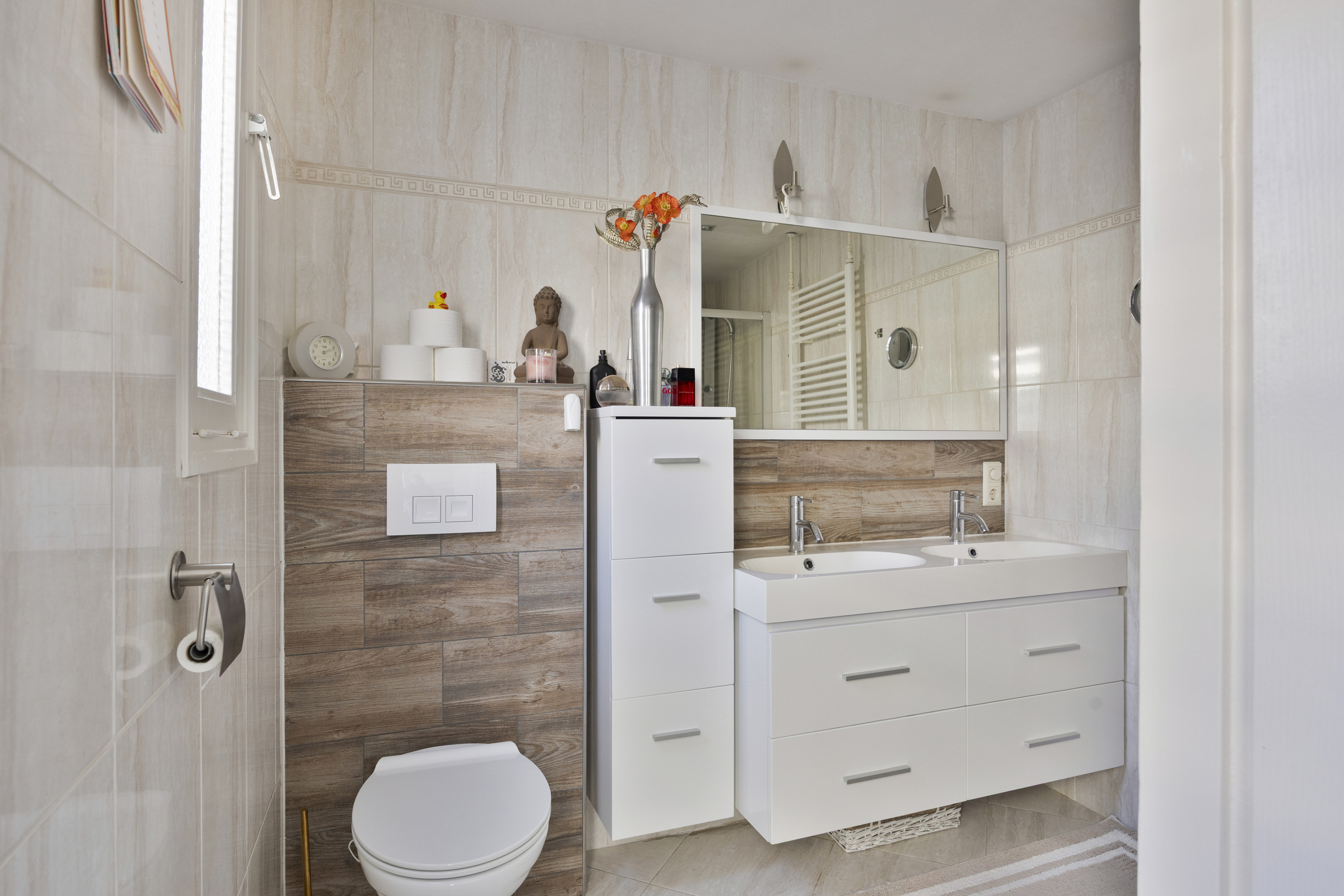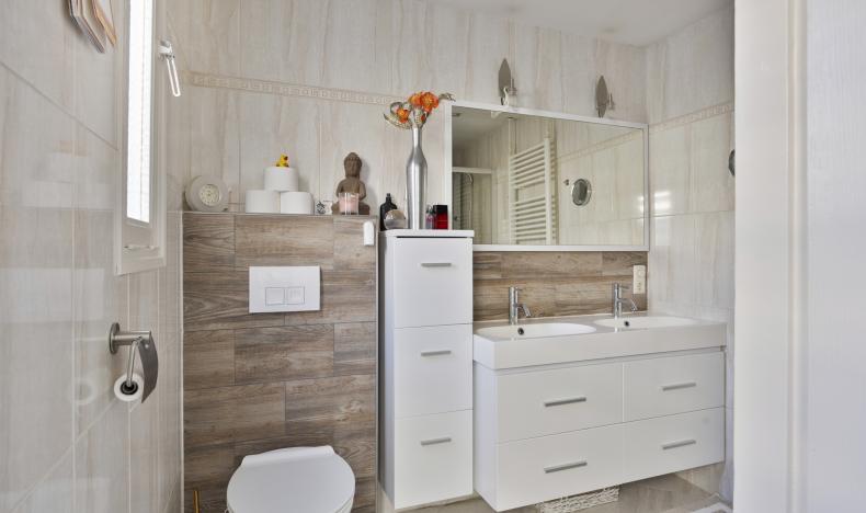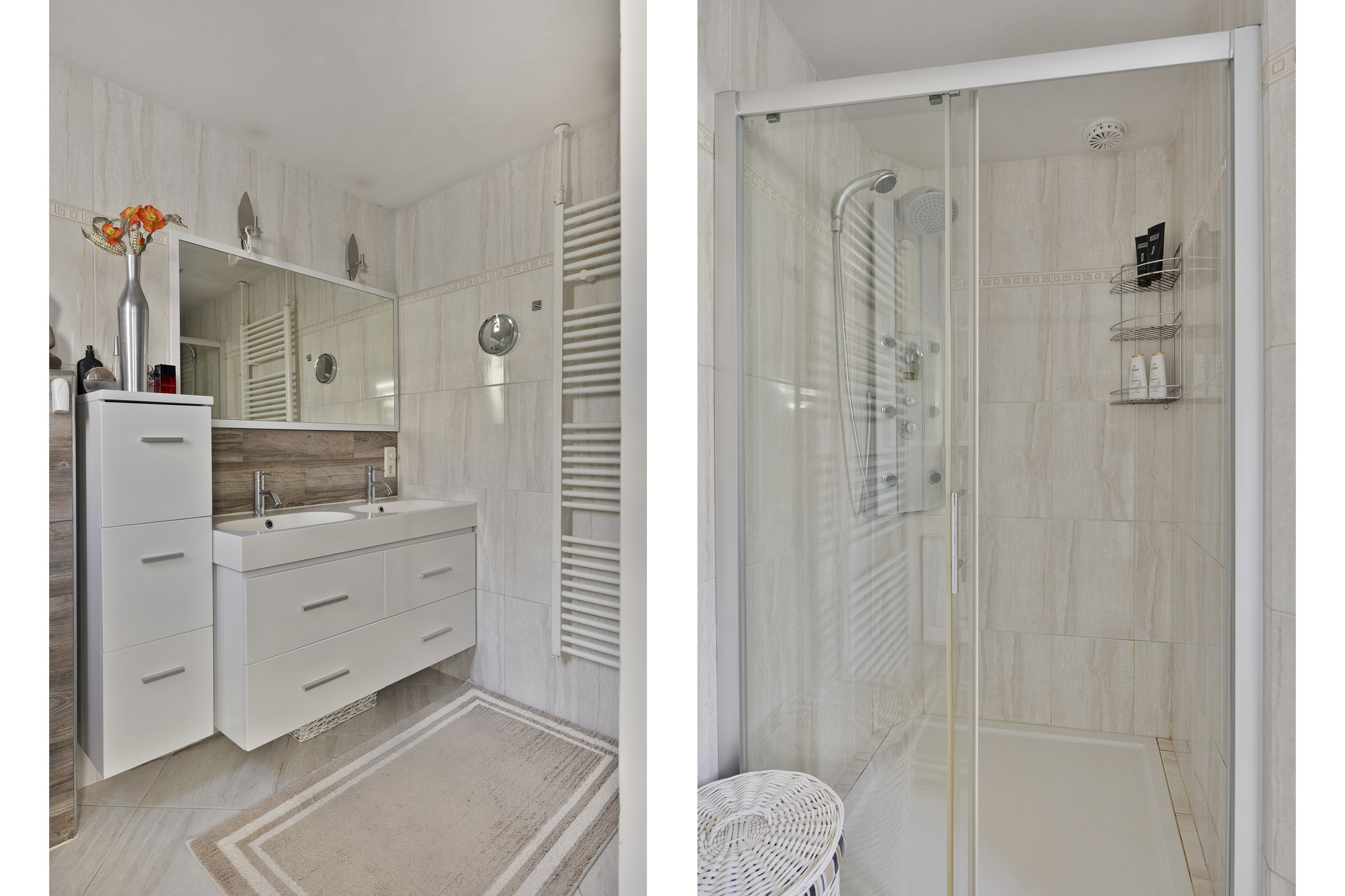 De badkamer is uitgevoerd in lichte kleuren en voorzien van een douchecabine met massagejets, dubbele wastafel met meubel en zwevend toilet.
