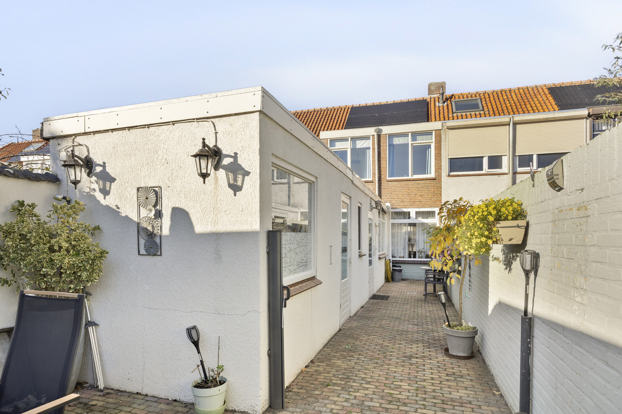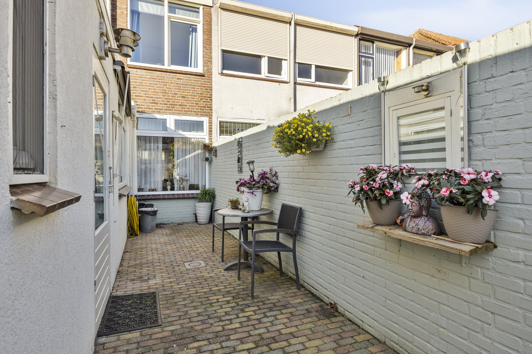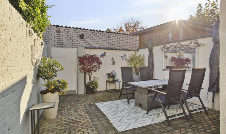 De achtertuin is onderhoudsvriendelijk aangelegd met bestrating en biedt voldoende ruimte voor een gezellige zithoek of eettafel in de zon. De berging grenst aan de woning en hier is de aansluiting voor wasmachine aanwezig en extra bergruimte. Via de achterom heb je directe toegang tot de achtergelegen brandgang, wat de tuin praktisch en goed bereikbaar maakt, tevens is hier de garage bereikbaar.