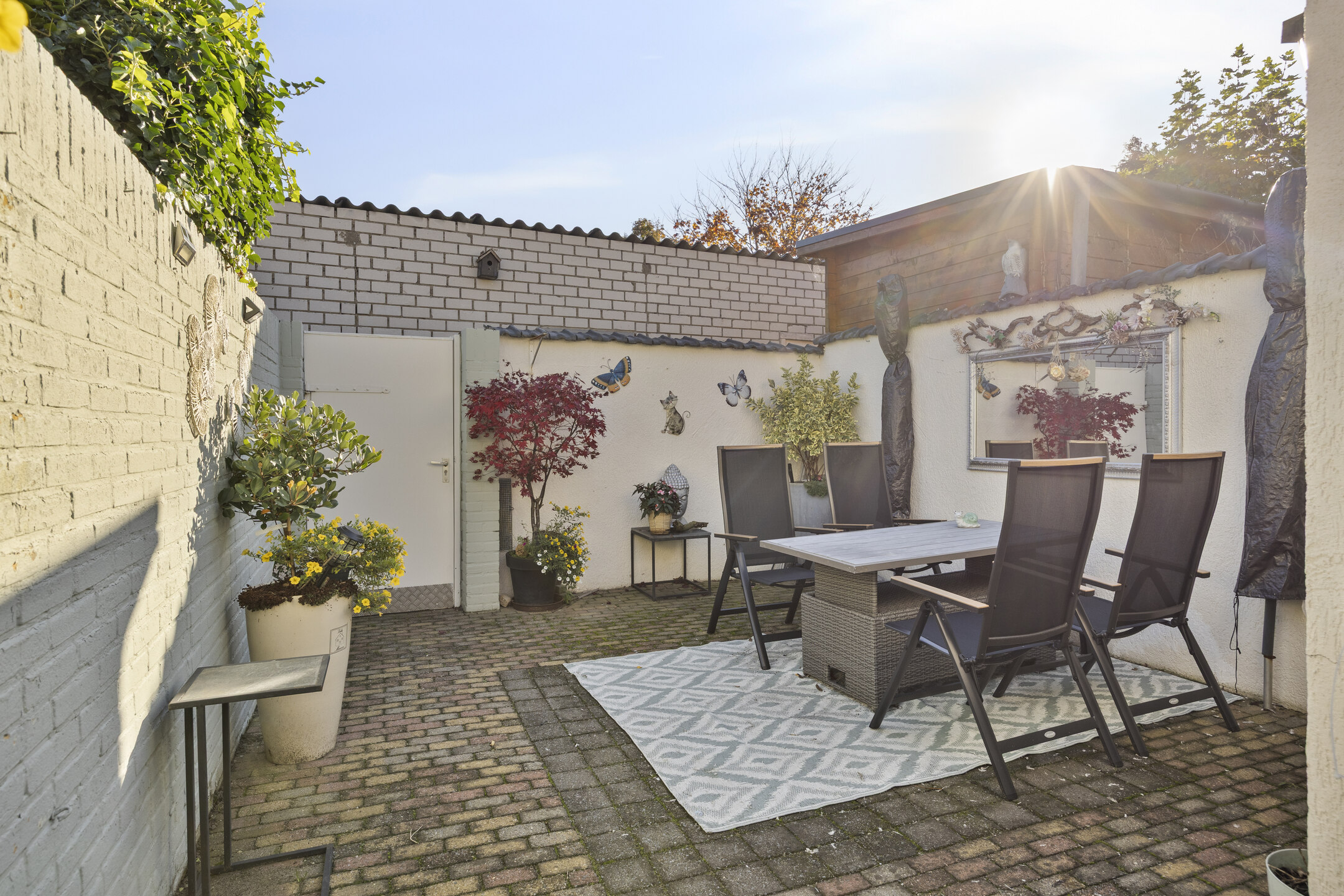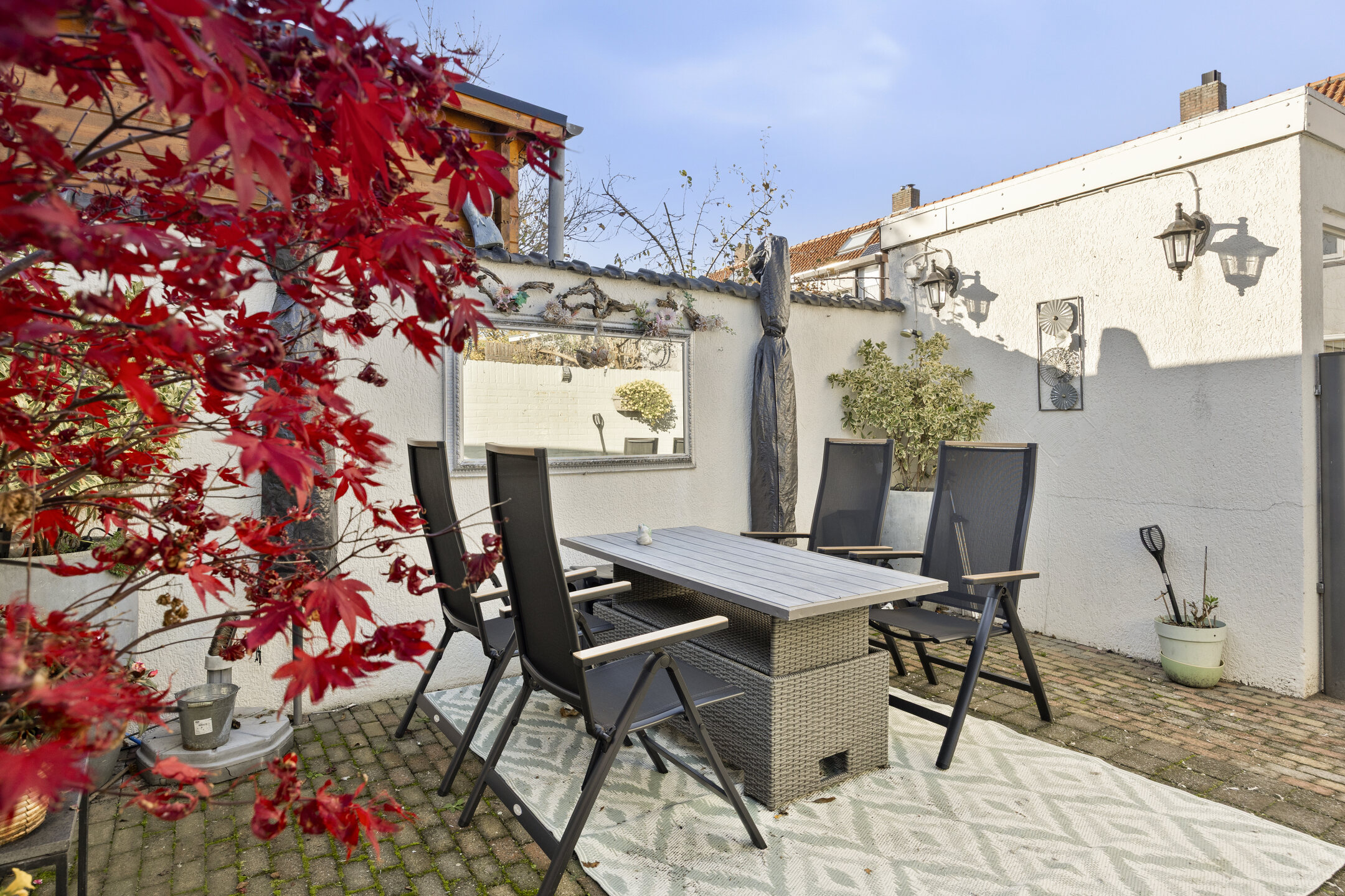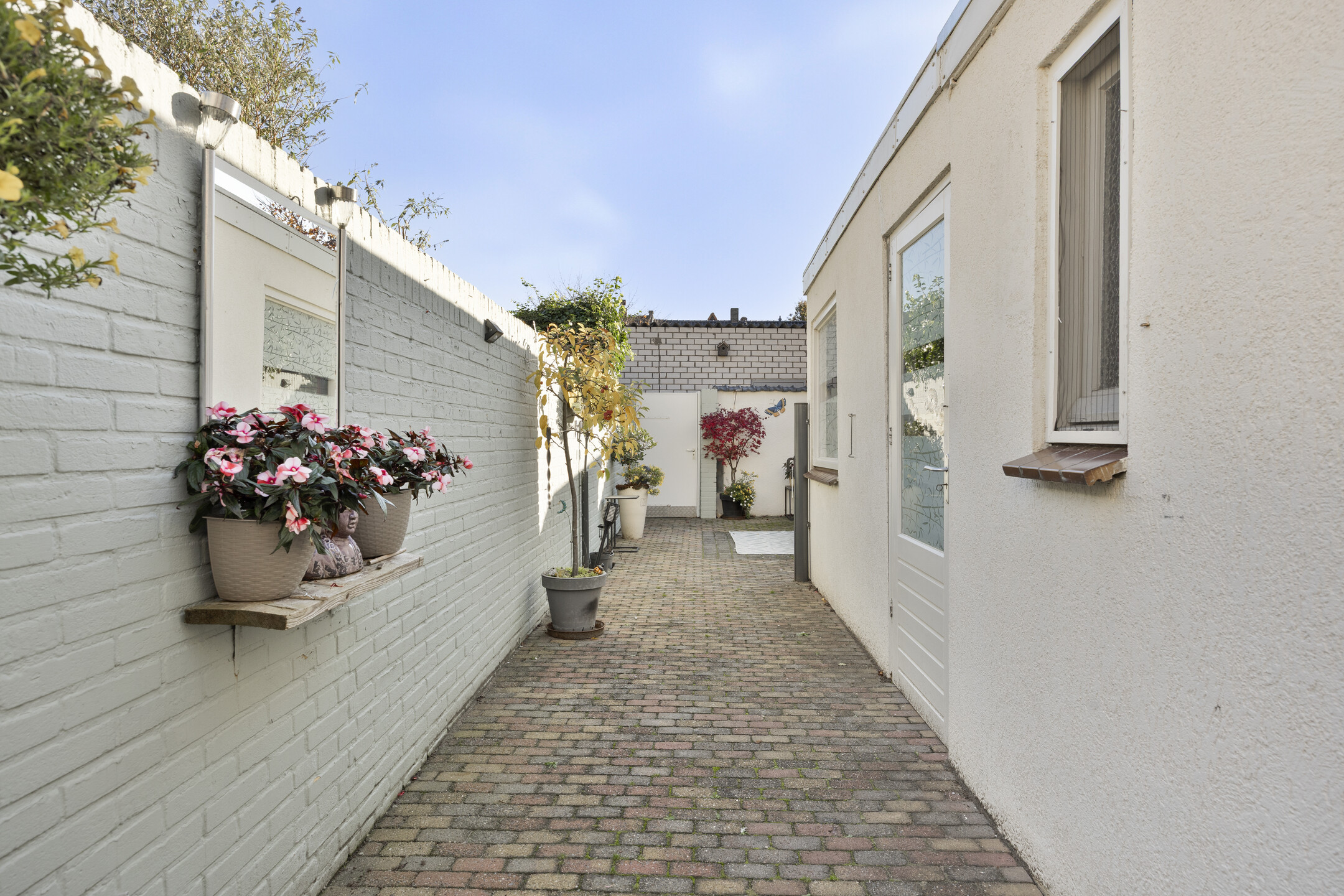 De achtertuin is onderhoudsvriendelijk aangelegd met bestrating en biedt voldoende ruimte voor een gezellige zithoek of eettafel in de zon. De berging grenst aan de woning en hier is de aansluiting voor wasmachine aanwezig en extra bergruimte. Via de achterom heb je directe toegang tot de achtergelegen brandgang, wat de tuin praktisch en goed bereikbaar maakt, tevens is hier de garage bereikbaar.