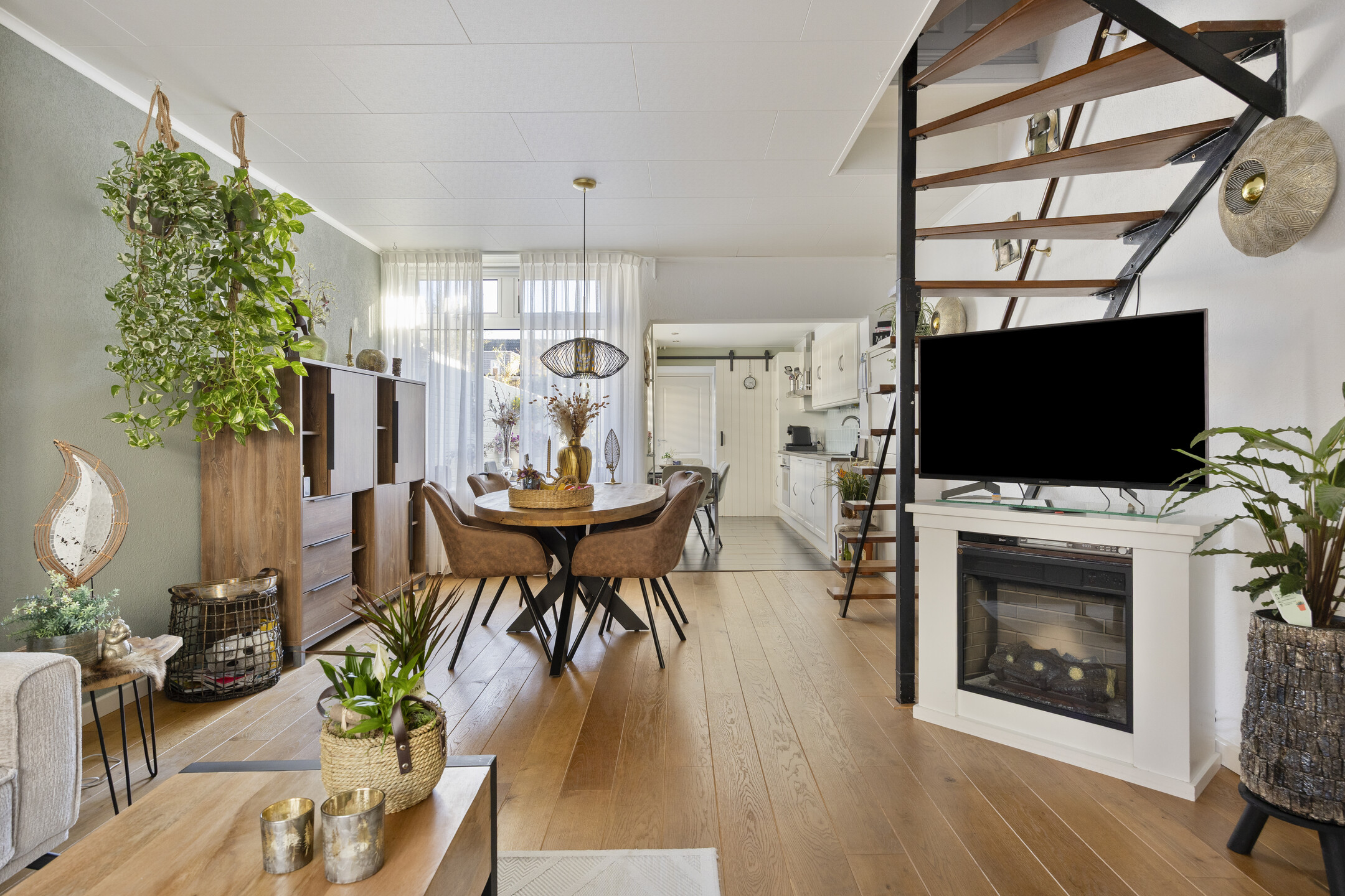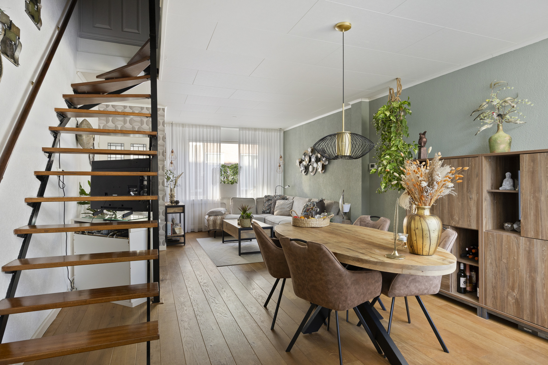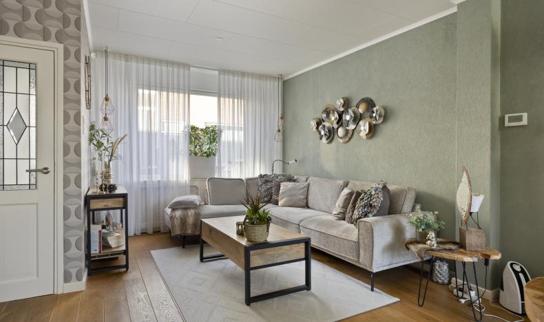 Je komt binnen in de hal met toegang tot de sfeervolle woonkamer. Dankzij de ramen aan de voor- én achterzijde is het hier heerlijk licht. De eiken houten vloer geeft het geheel een warme uitstraling. De open trap in de woonkamer zorgt voor een speels effect en verbindt de begane grond met de verdieping.
