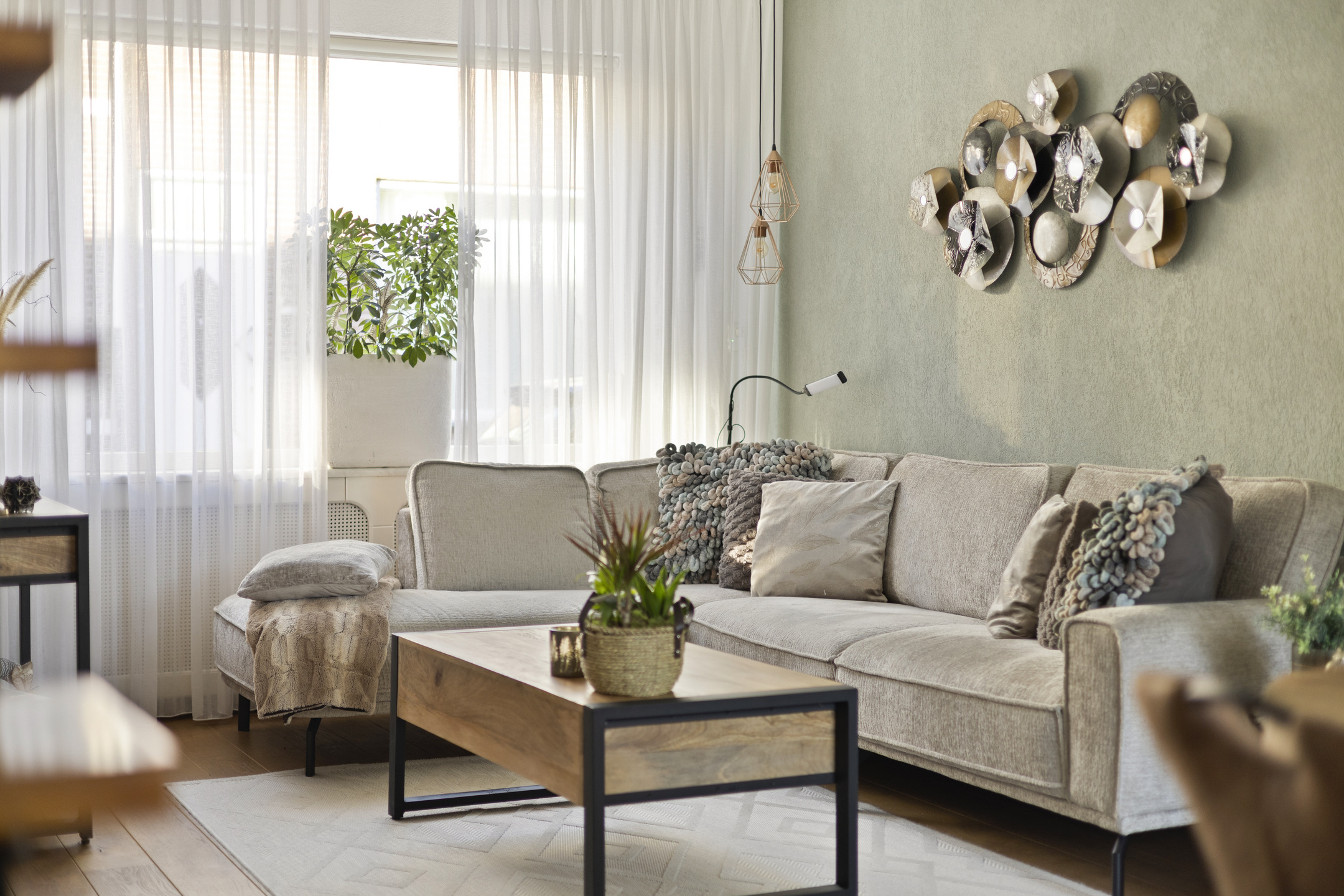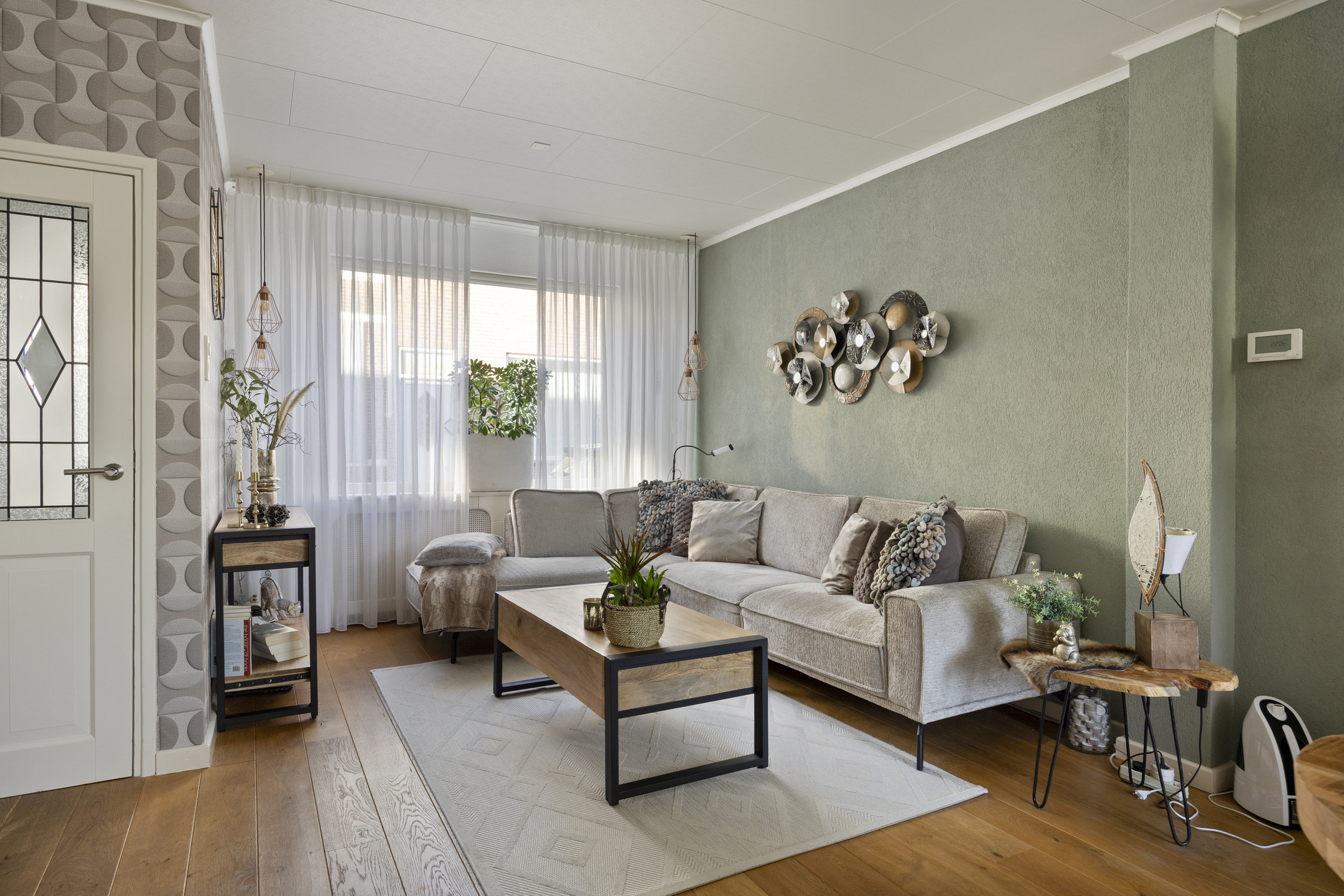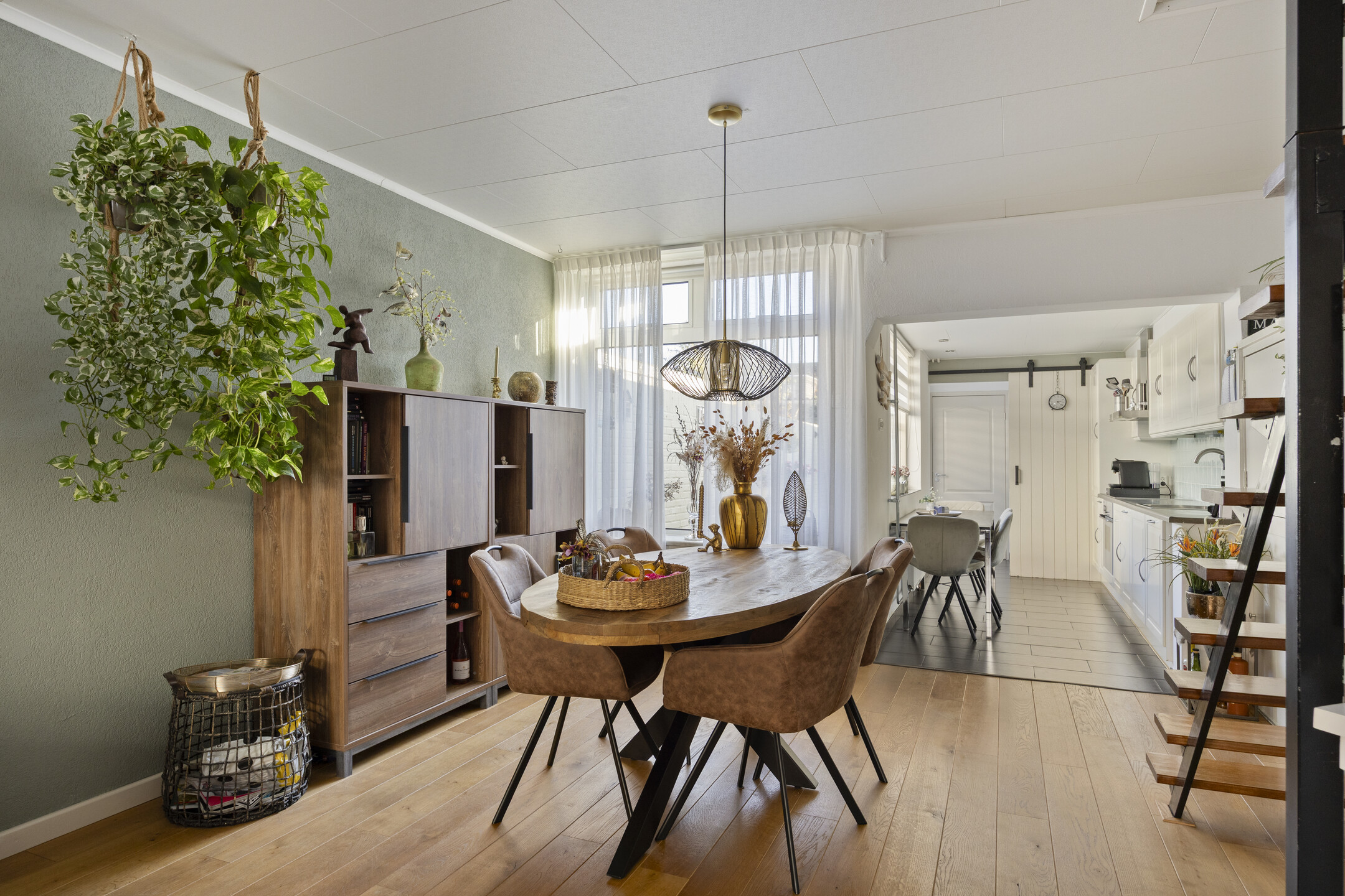 Je komt binnen in de hal met toegang tot de sfeervolle woonkamer. Dankzij de ramen aan de voor- én achterzijde is het hier heerlijk licht. De eiken houten vloer geeft het geheel een warme uitstraling. De open trap in de woonkamer zorgt voor een speels effect en verbindt de begane grond met de verdieping.