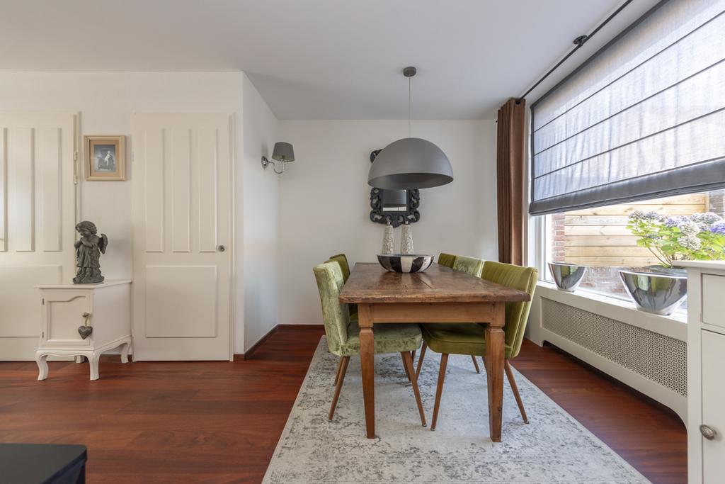 Entree/hal met meterkast en modern toilet (hangcloset) met fontein. De gehele begane grond is voorzien van een fraaie hardhouten vloer die twee jaar geleden nog geheel geschuurd en behandeld werd. Gezellige woonkamer aan de voorzijde en halfopen keuken aan de achterzijde met eetgedeelte. De keuken is in 2022 geheel vernieuwd! De keuken is voorzien van een composiet aanrechtblad en verder van de navolgende inbouwapparatuur: koelkast met vriesvak (KitchenAid), hetelucht-oven met magnetronfunctie , inductiekookplaat (v.v. flexmodule) en recirculatie afzuigkap. Verder treft u nog aan een vaatwasser en een grote spoelbak. Ter plaatse van de woonkamer toegang tot een diepe trapkast.