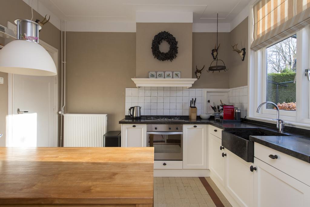 Entree, stijlvolle hal met trapopgang met tussenbordes, fonteintje en toiletruimte, toegang naar de kelder, de woonkamers en keuken. De woonkamer-en-suite is voorzien van een schouw met houthaard, meerdere authentieke schuifdeuren, vaste kasten, schouw met houtkachel, doorgeefluik naar keuken en tuindeuren naar voortuin en naar de achtertuin. De separate keuken is ingericht met een roomwit keukenblok met Belgisch hardstenen blad v.v. spoelbak,5-pits gaskookplaat, afzuigkap ,koelkast en combioven (oven/grill). Vanuit de keuken is de bijkeuken te bereiken. Deze ruimte is voorzien van een praktische kast, aan/afvoer wasmachine en vaatwasser en verder bevinden zich hier de gasmeter en meterkast. Middels deur toegang naar het terras onder de houten overkapping en naar de achtertuin.
