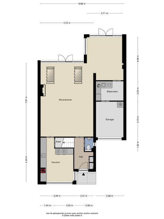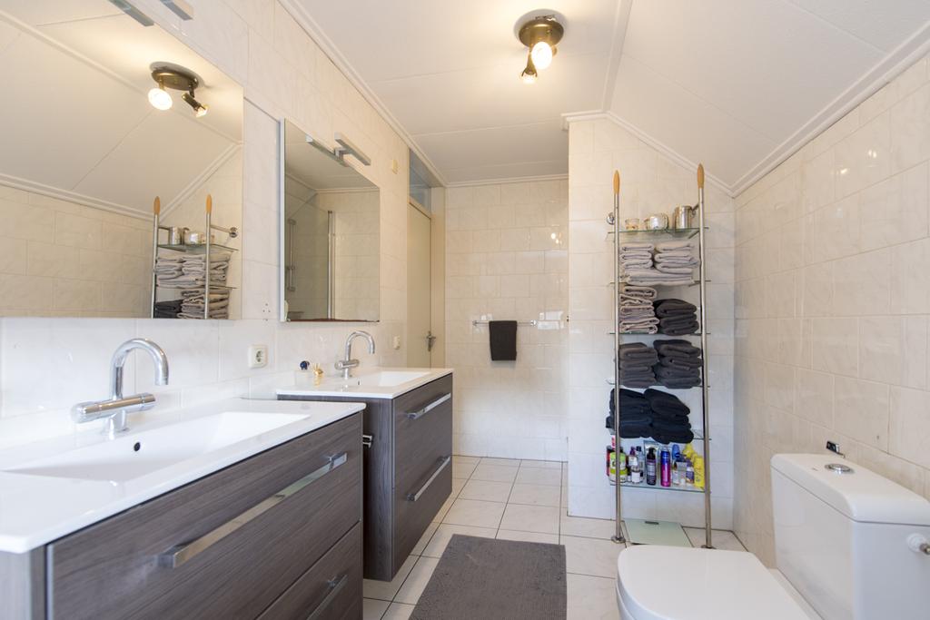 Vanuit de eetkamer toegang tot de praktische bijkeuken met de aansluiting voor de was-apparatuur en extra kastruimte met gootsteen. Vanuit de bijkeuken komt u in de garage voorzien van een kanteldeur met extra loopdeur. Boven de garage is bergruimte aanwezig onder de schuine kap.