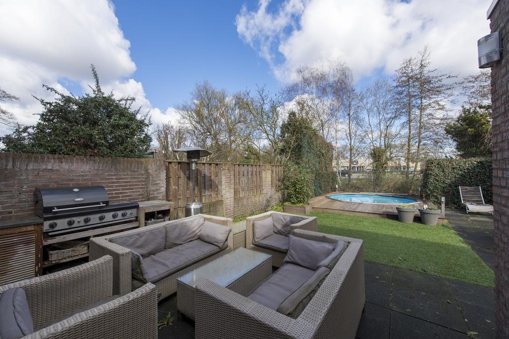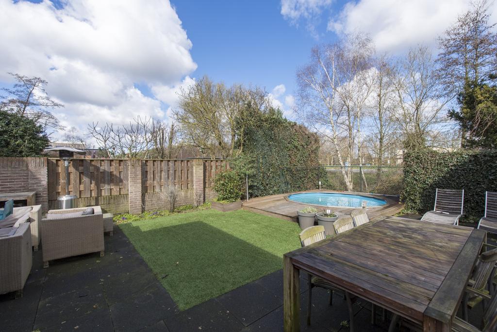 Voortuin met oprit voor meerdere auto’s. Achtertuin grenzend aan het water met terras aan de woning, gazon (kunstgras) en een terras rondom het zwembad met pomp, achter in de tuin. Vanuit de achtertuin een vrij uitzicht over de Campenhoefdreef.