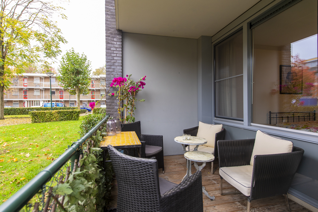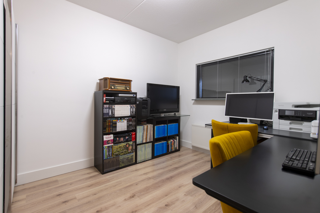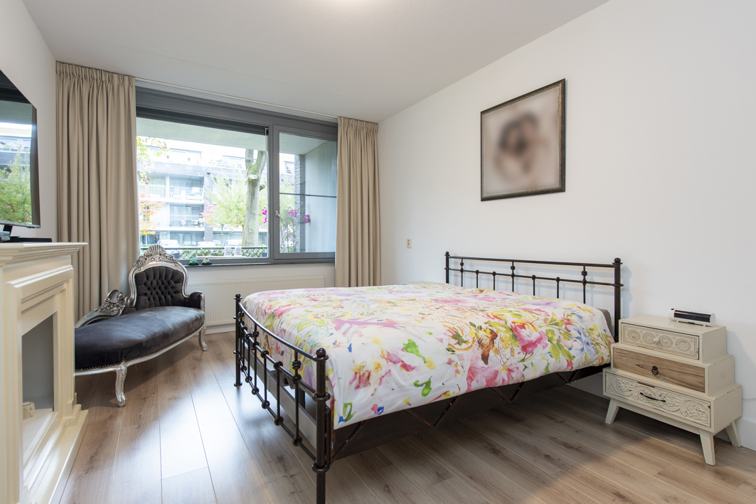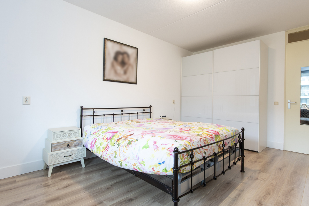 Aan de achterzijde bevindt zich de ruime tweede slaapkamer, met een fraai uitzicht op het overdekte balkon en het park. De kamer is afgewerkt met een laminaatvloer, stucwerk wanden en een spuitwerk plafond. De kozijnen zijn voorzien van horren en recent is er een airconditioning (2025) geplaatst die zowel kan koelen als verwarmen. Spullen kunnen opgeborgen worden in een moderne kast van Goossens meubelen met schuifdeuren (2022).
